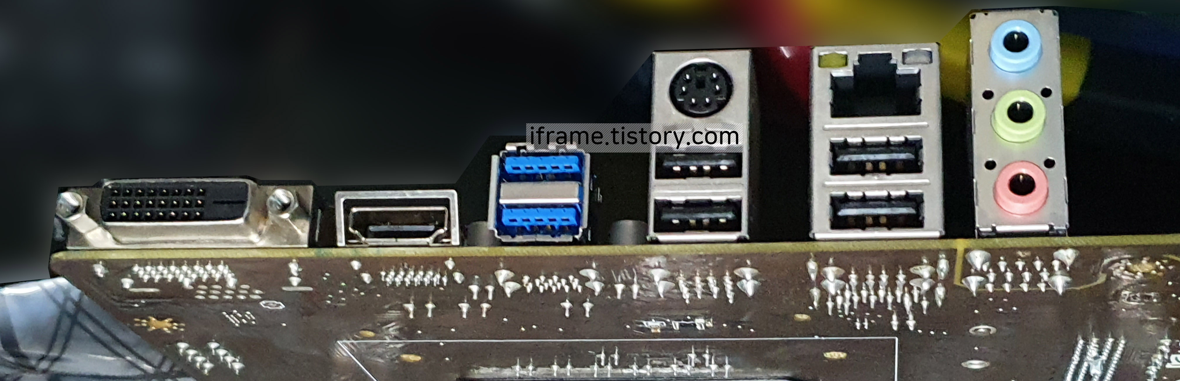 후면 포트 구성으로 DVI-D, HDMI, USB 3.2 Gen 1 및 USB 2.0 포트가 있고 PS/2 및 오디오, 기가비트 이더넷 포트가 탑재되어 있습니다.