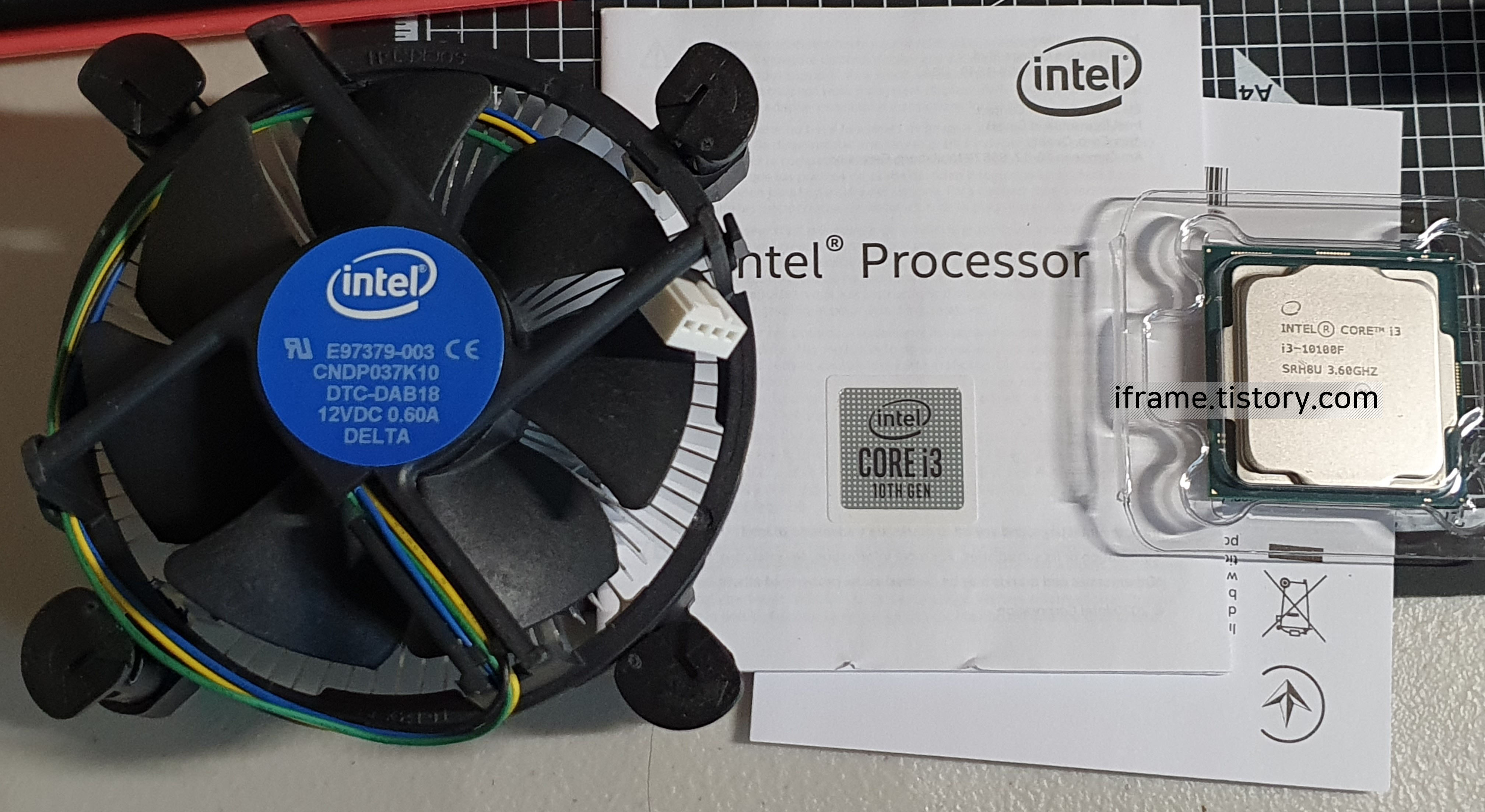 박스를 뜯어보면 CPU와 쿨러, 스티커가 있으며 그 외 안내서가 있습니다.