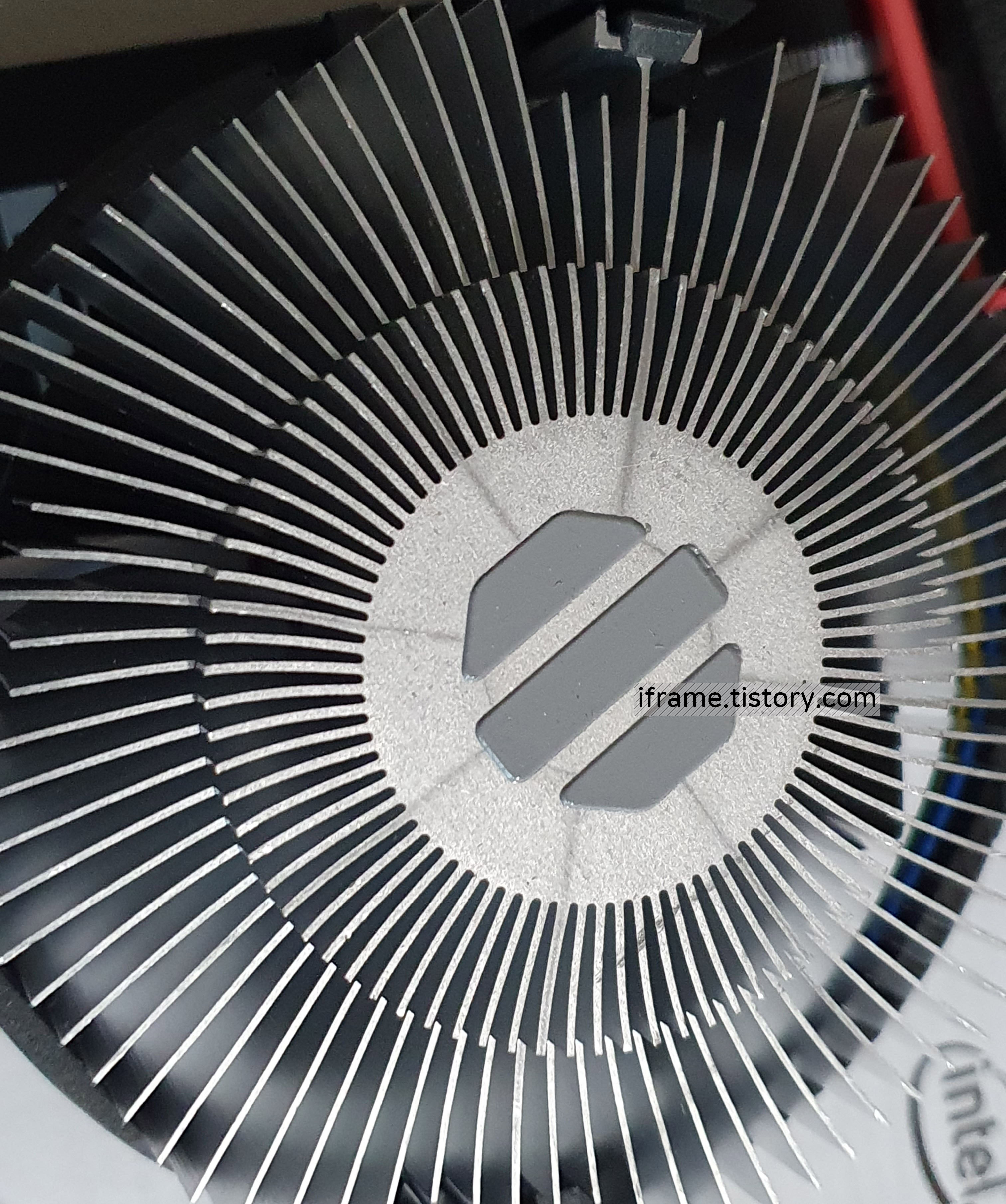 쿨러 바닥 면에는 위 사진처럼 서멀 그리스가 사전에 도포되어 있으며 이 상태 그대로 메인보드에 CPU 장착→CPU 쿨러 장착 및 고정을 하면 됩니다. 손이나 옷에 아주 잘 묻기 때문에 취급하실 때 조심하셔야 합니다.
