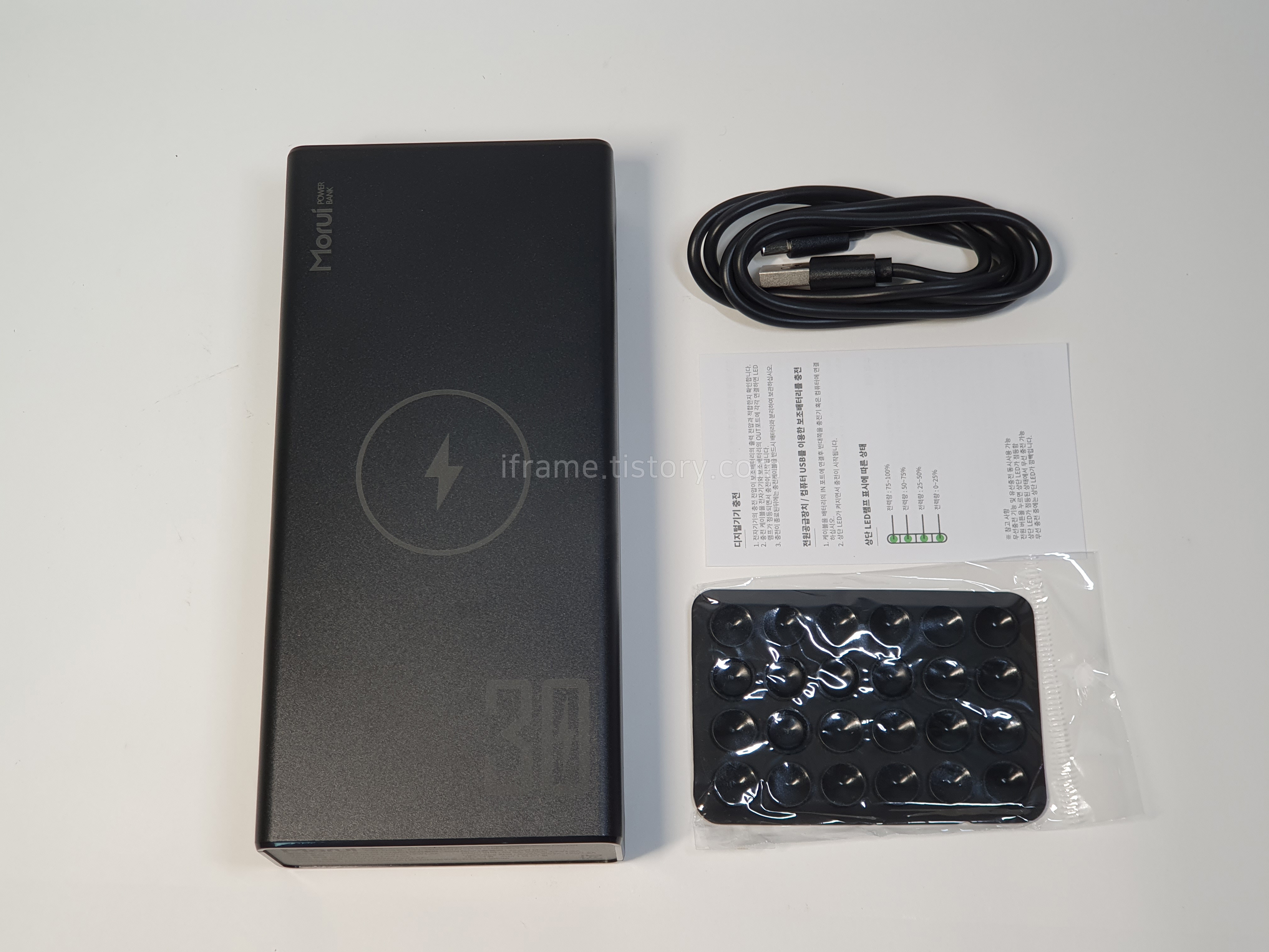 Type-A to C USB 케이블과 배터리 본체, 설명서가 있으며 아래 흡착패드는 판매처에 따라 제공 여부가 다르니 미리 확인해보셔야 합니다.