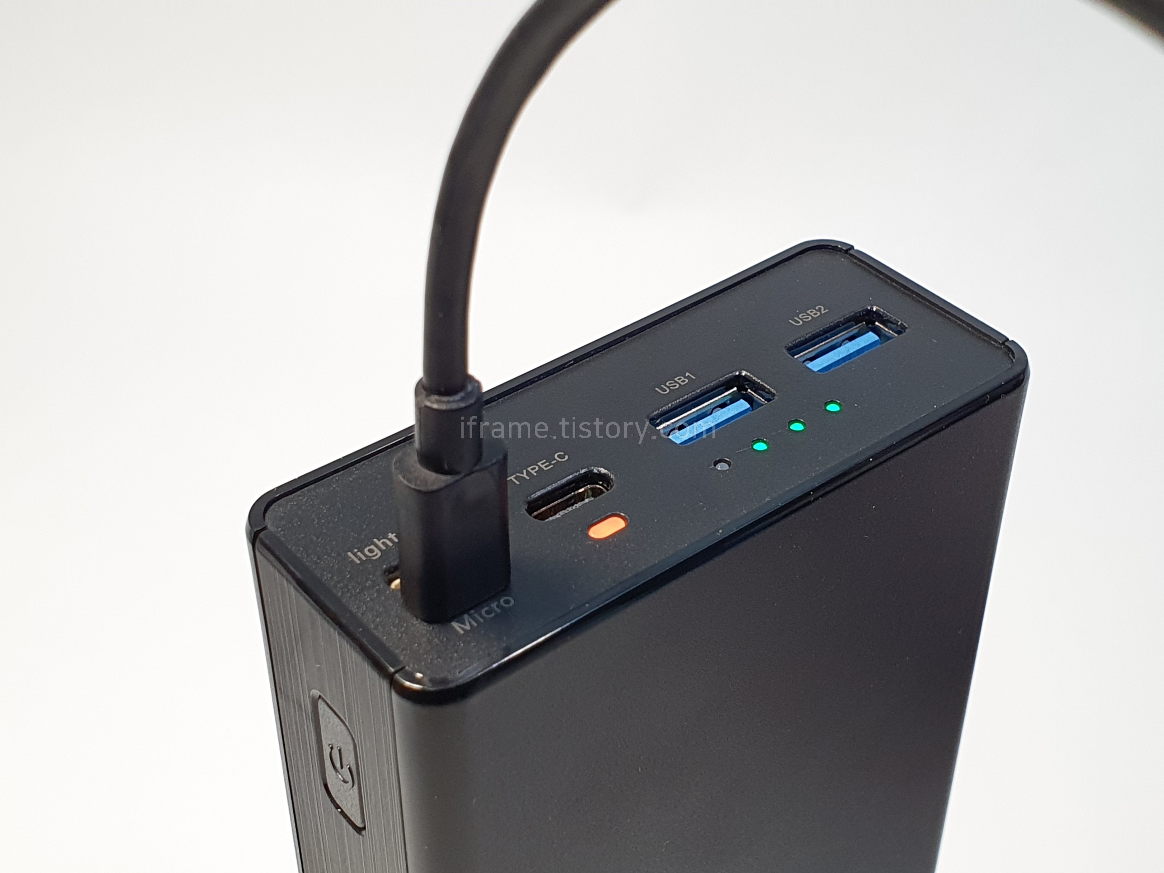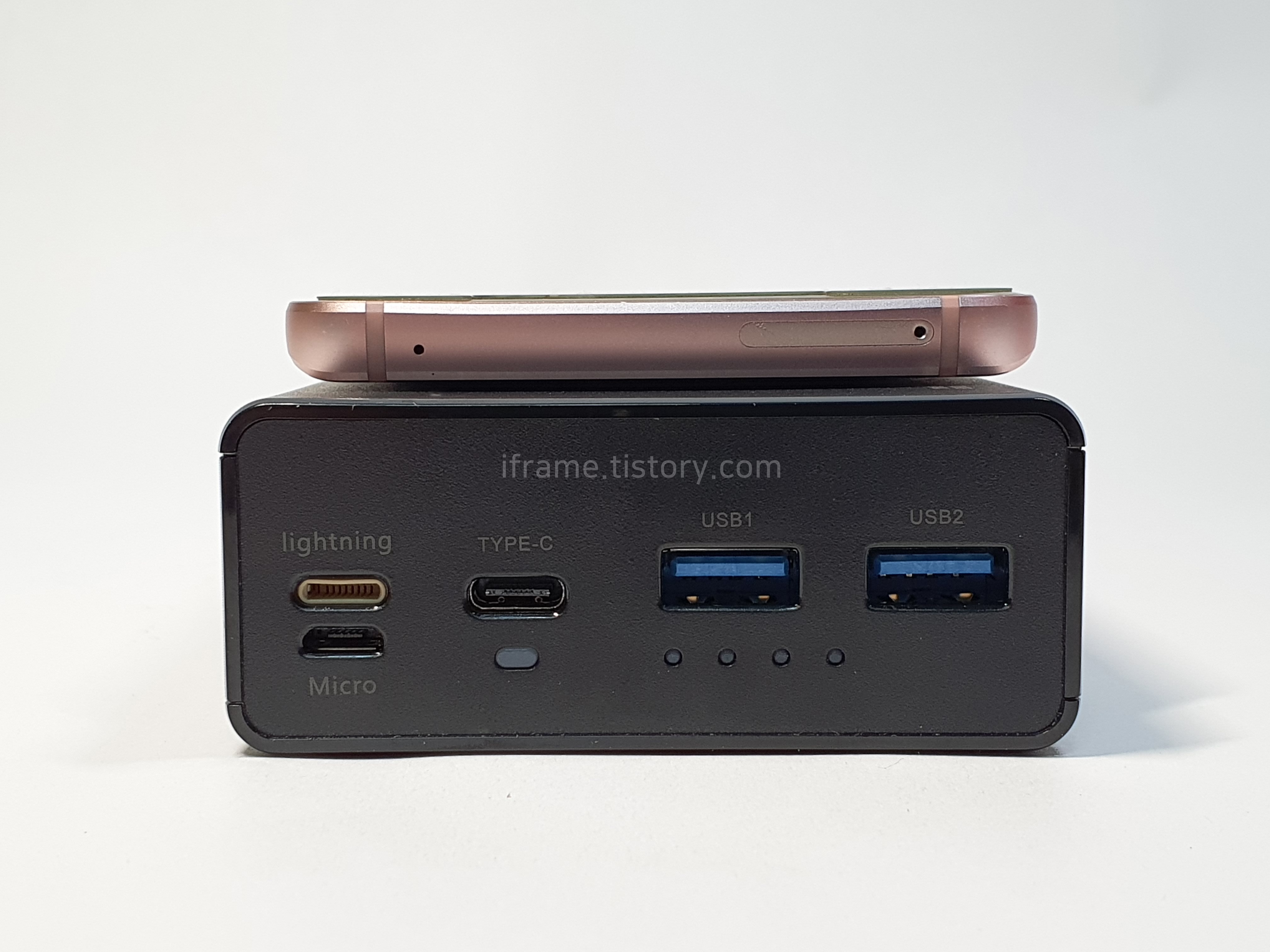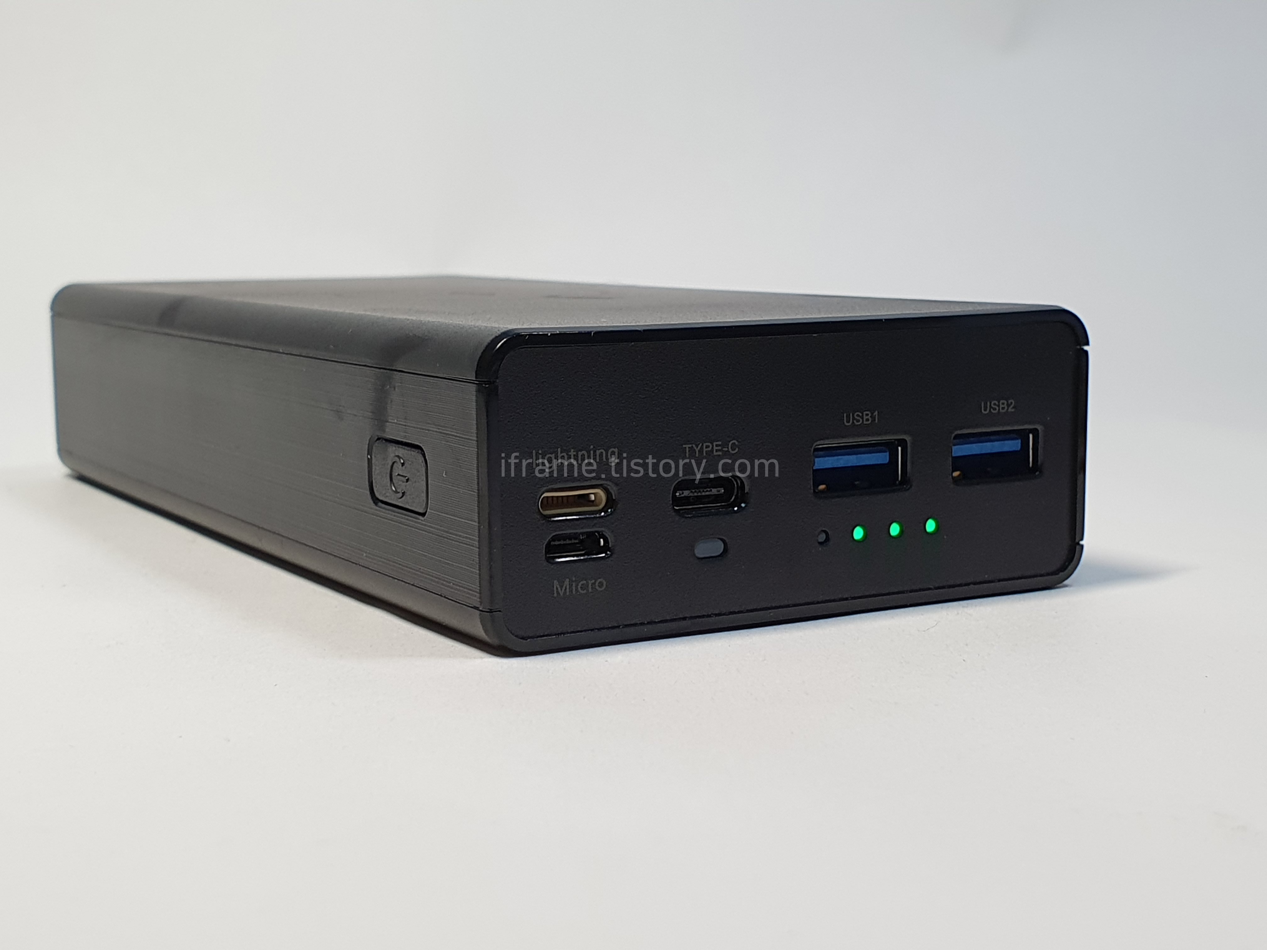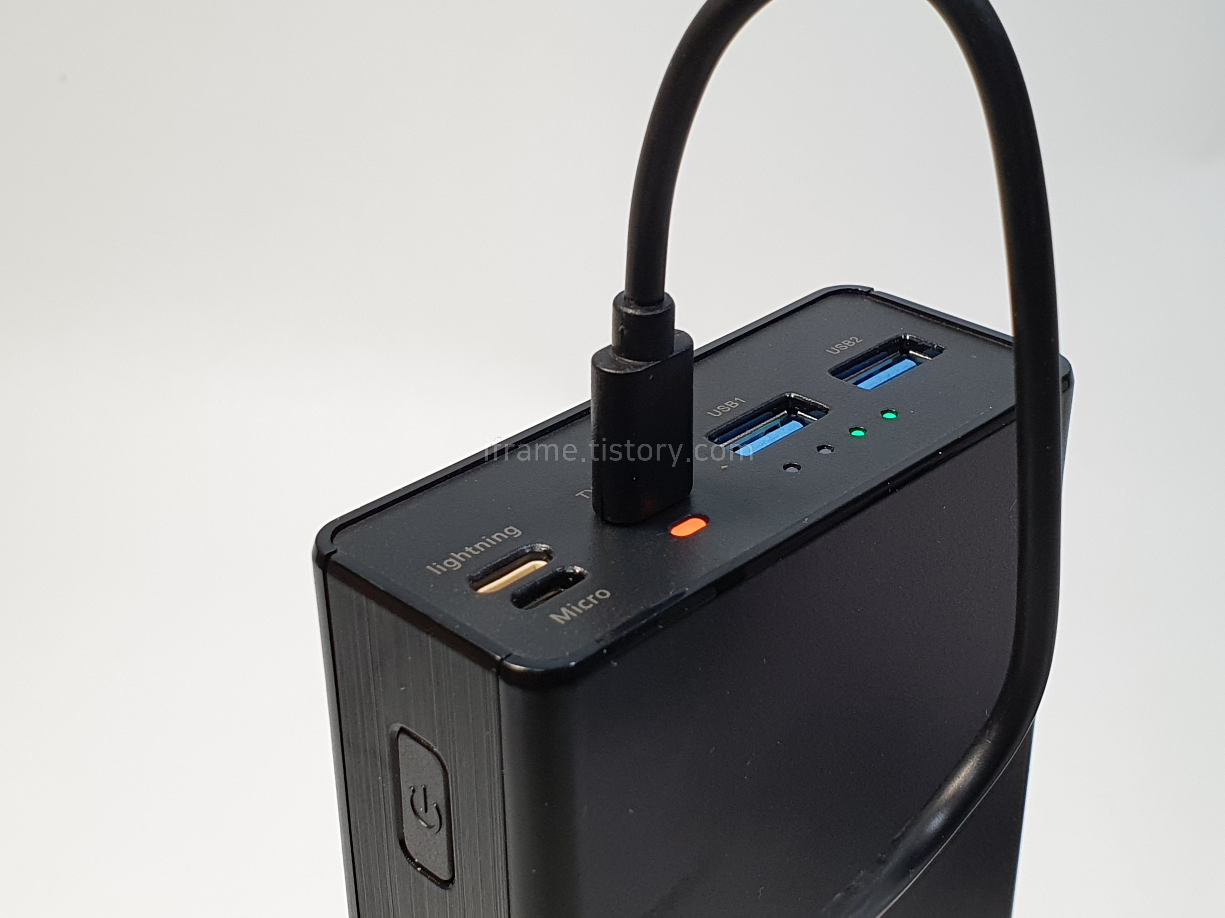 상단에는 라이트닝 포트 및 마이크로 USB, Type-C와 Type-A 2개의 포트가 있으며 충전 상태 및 잔량을 알려주는 LED가 탑재되어 있습니다.