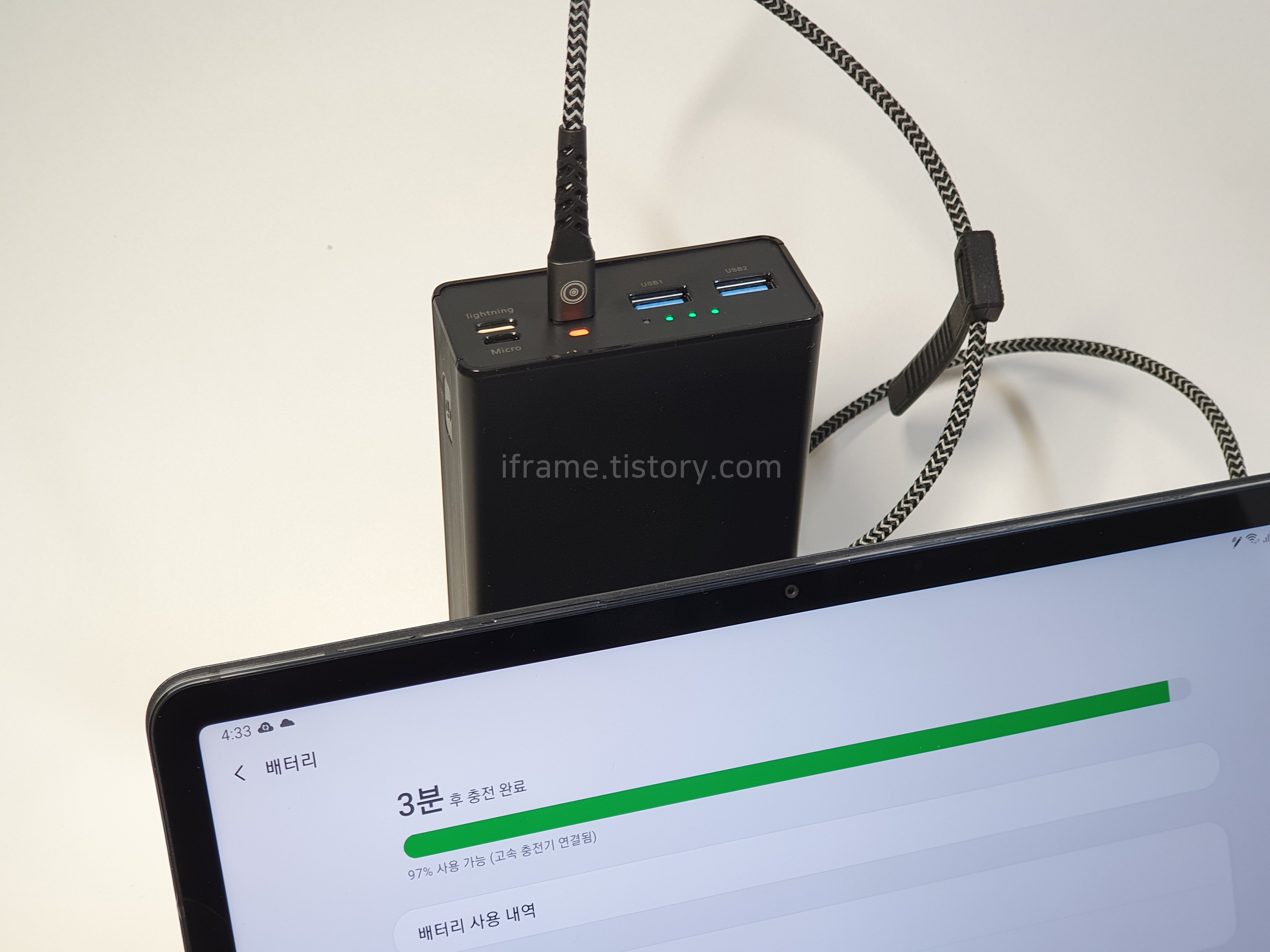 태블릿 PC에 꽂아서 충전을 해봤습니다. 사진처럼 고속 충전기 연결됨 표기를 볼 수 있으며, 초고속 충전(25W 이상)은 지원되지 않습니다. 그렇다 해도 15W 정도 출력은 지원되므로 5V 2A 전용 충전기에 비하면 빠른 속도로 충전 가능합니다.