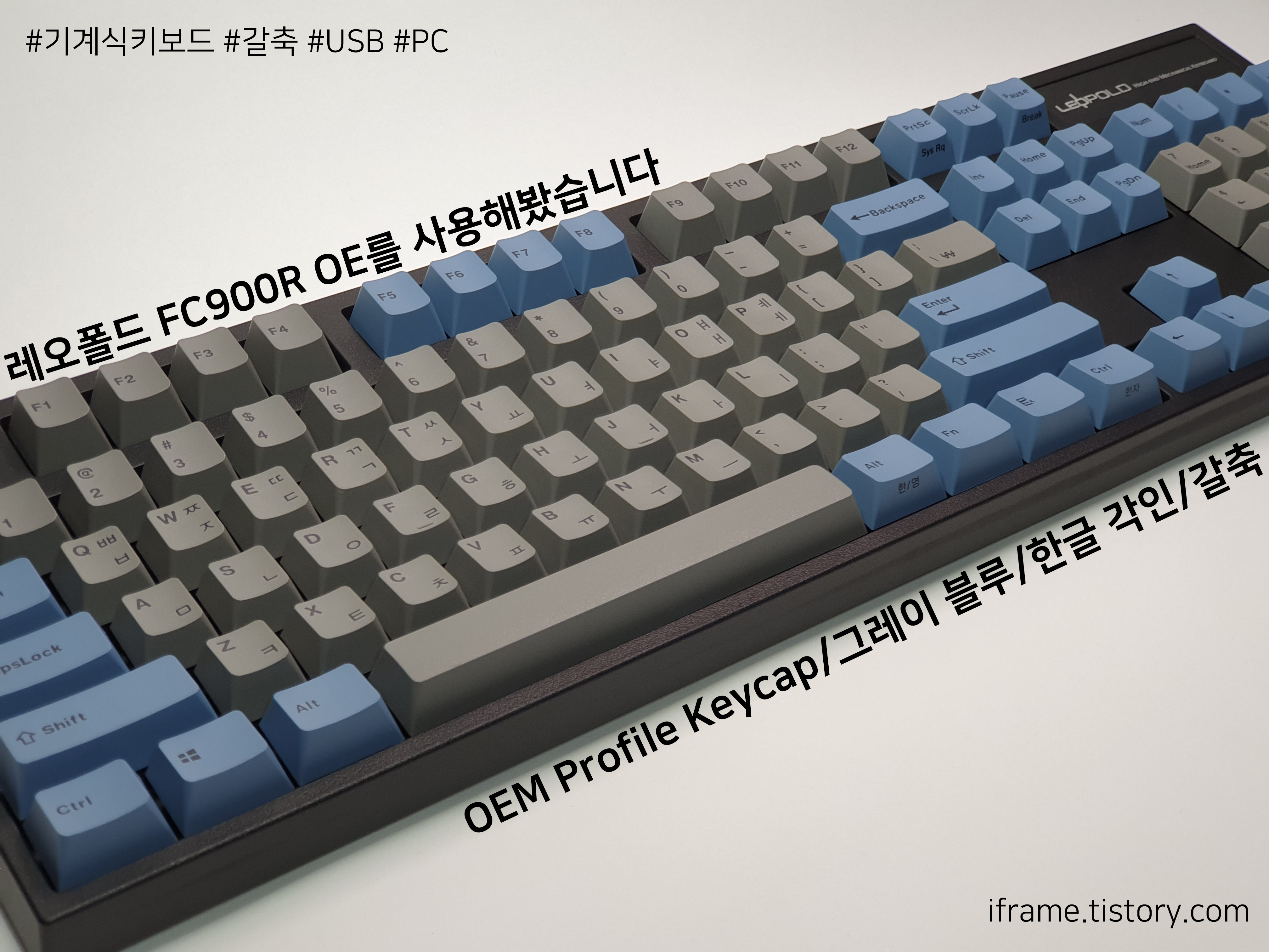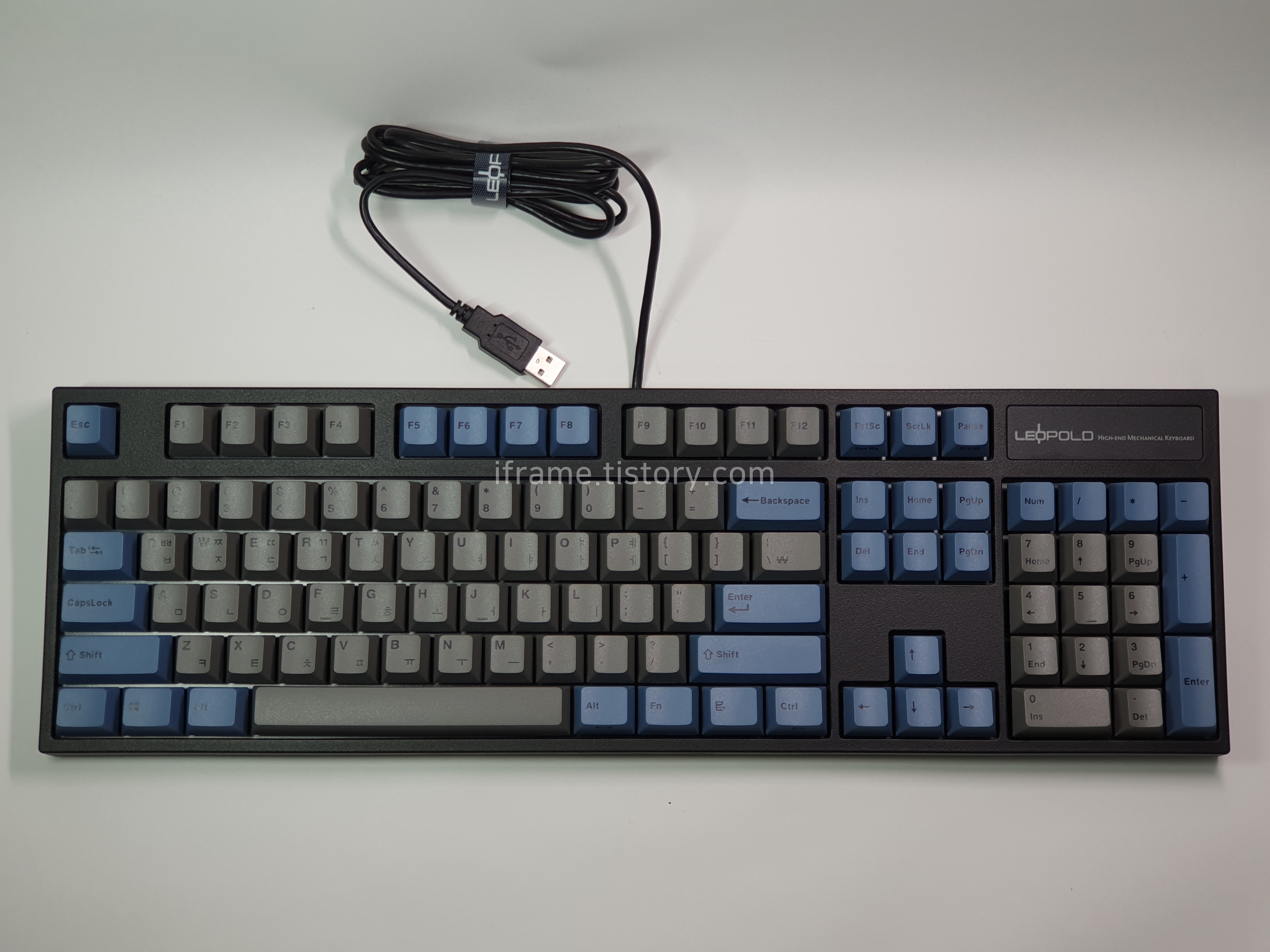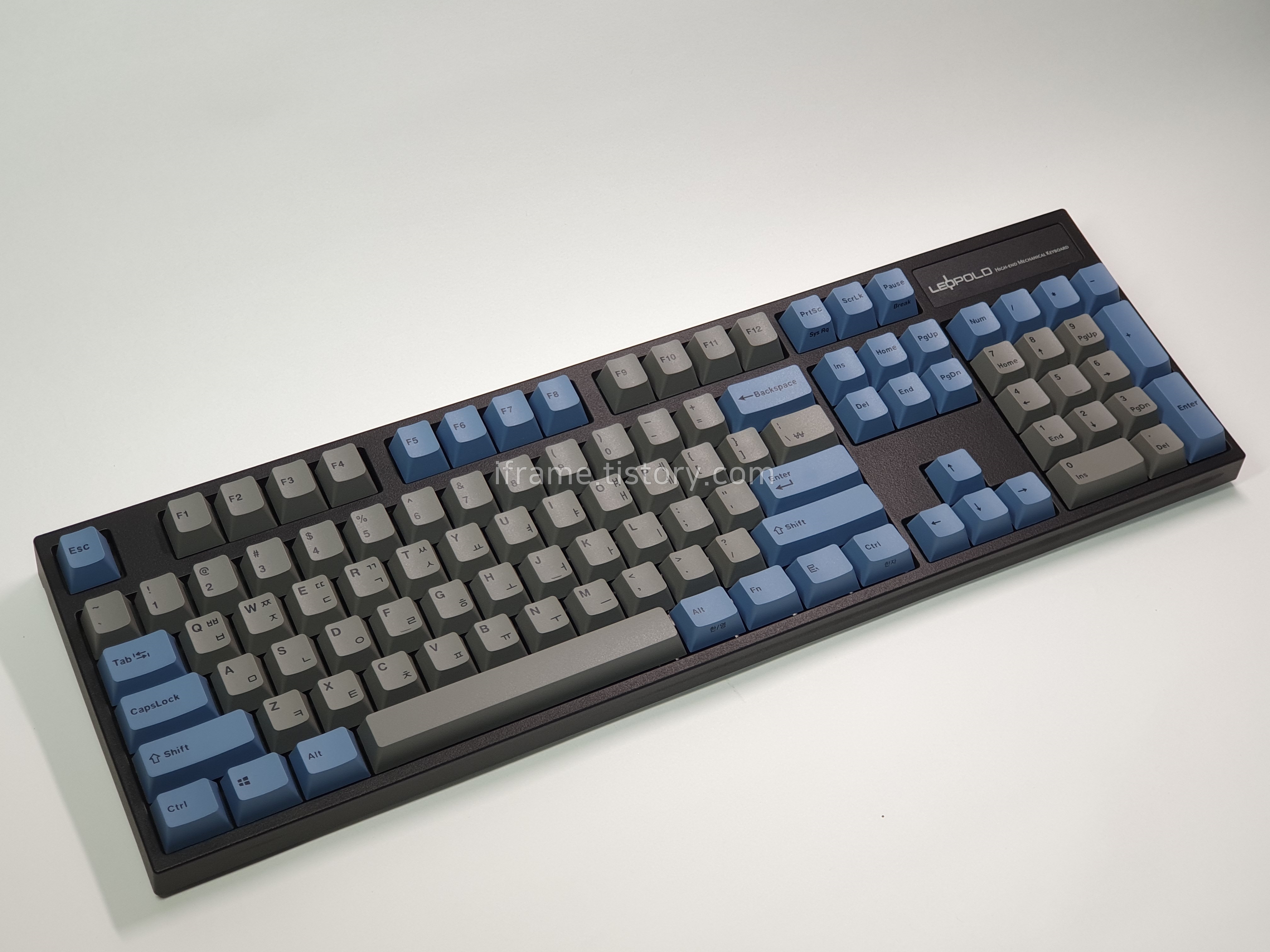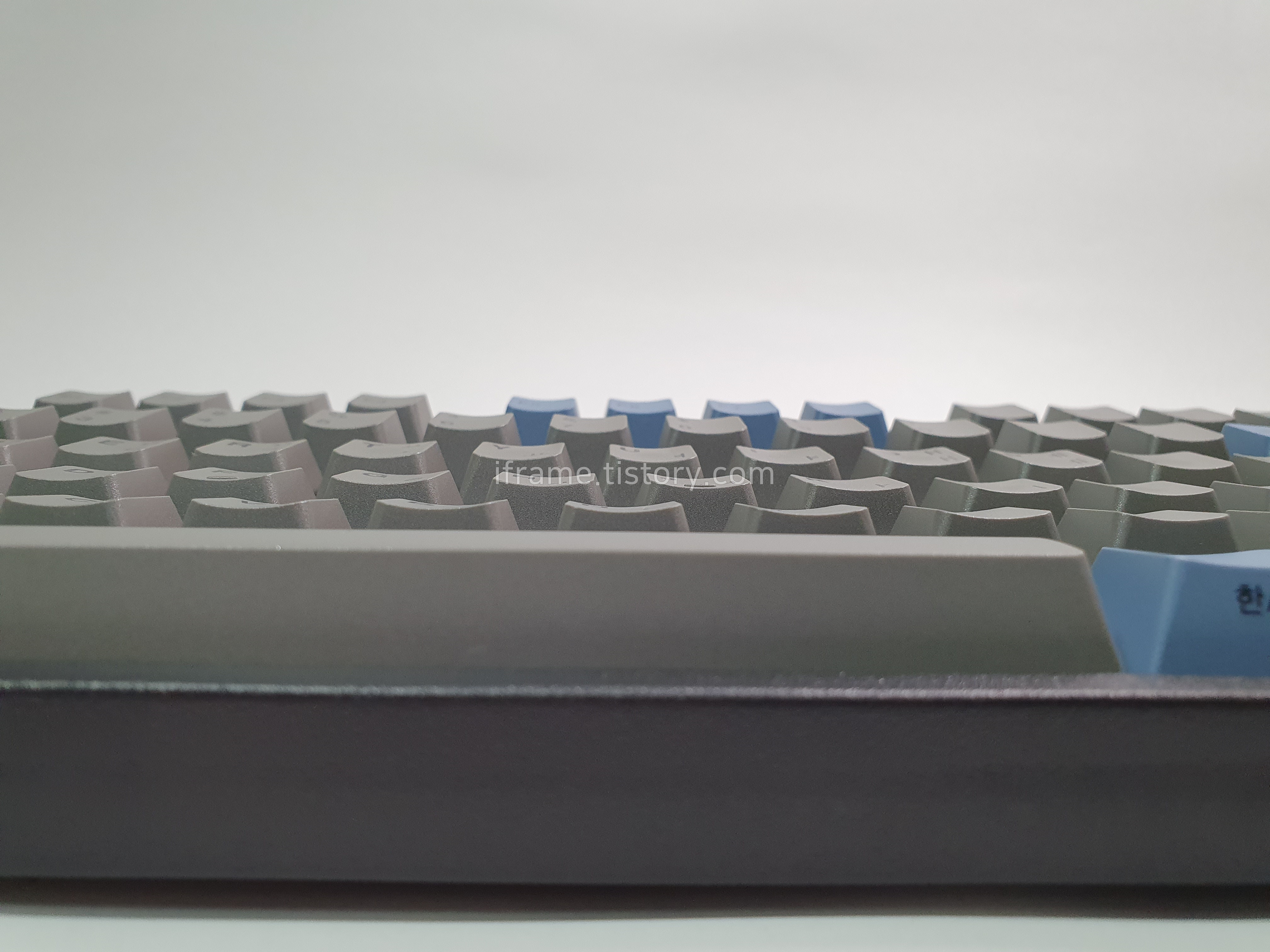 키캡 기본 색상은 회색이며, 기능 키나 일부 키는 파란색이 적용되어 있습니다.
