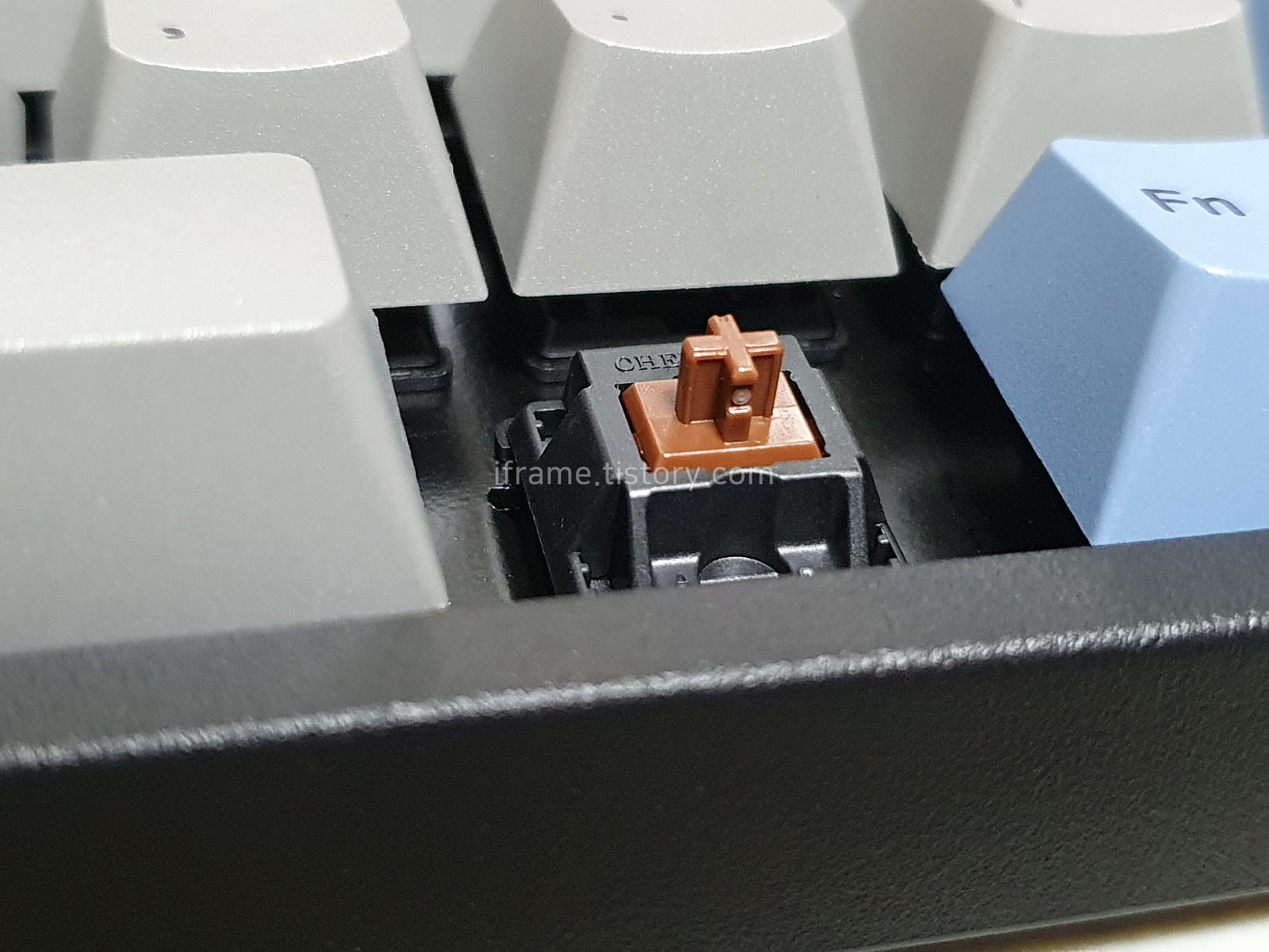 사진은 스페이스 바 우측에 위치한 Alt 키캡을 뺀 모습으로, 갈색 축이 적용되어 있습니다. 단순 색상만 입힌 게 아니라 스위치의 방식을 쉽게 구분하기 위해서 적용되었으며 스위치 별 차이는 링크를 참고해보세요.
