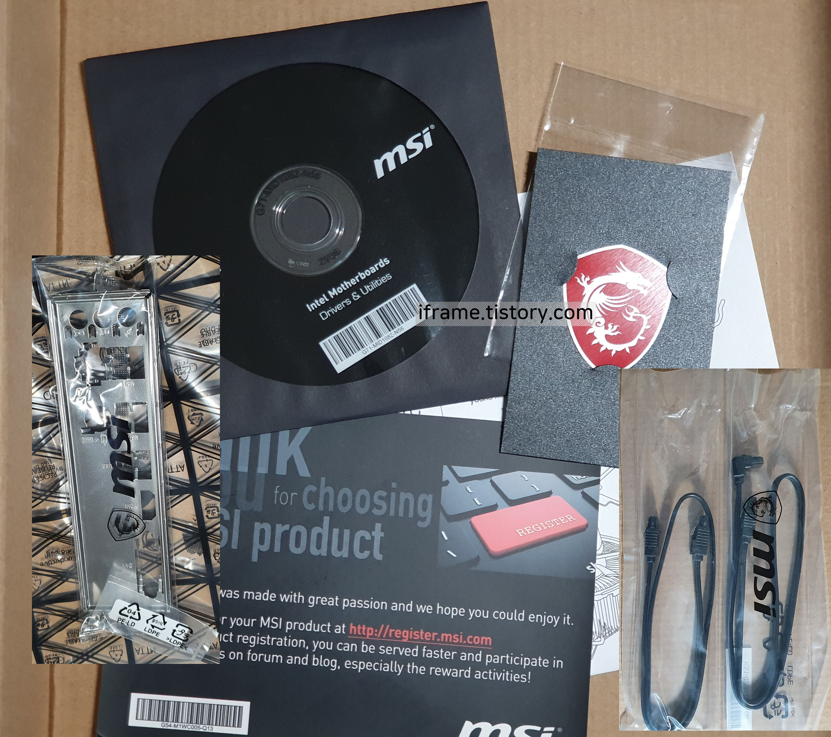 박스에는 간단 설명서와 후면 패널, 드라이버 CD, S-ATA 케이블 2개와 스티커, M.2 나사가 포함되어 있습니다.