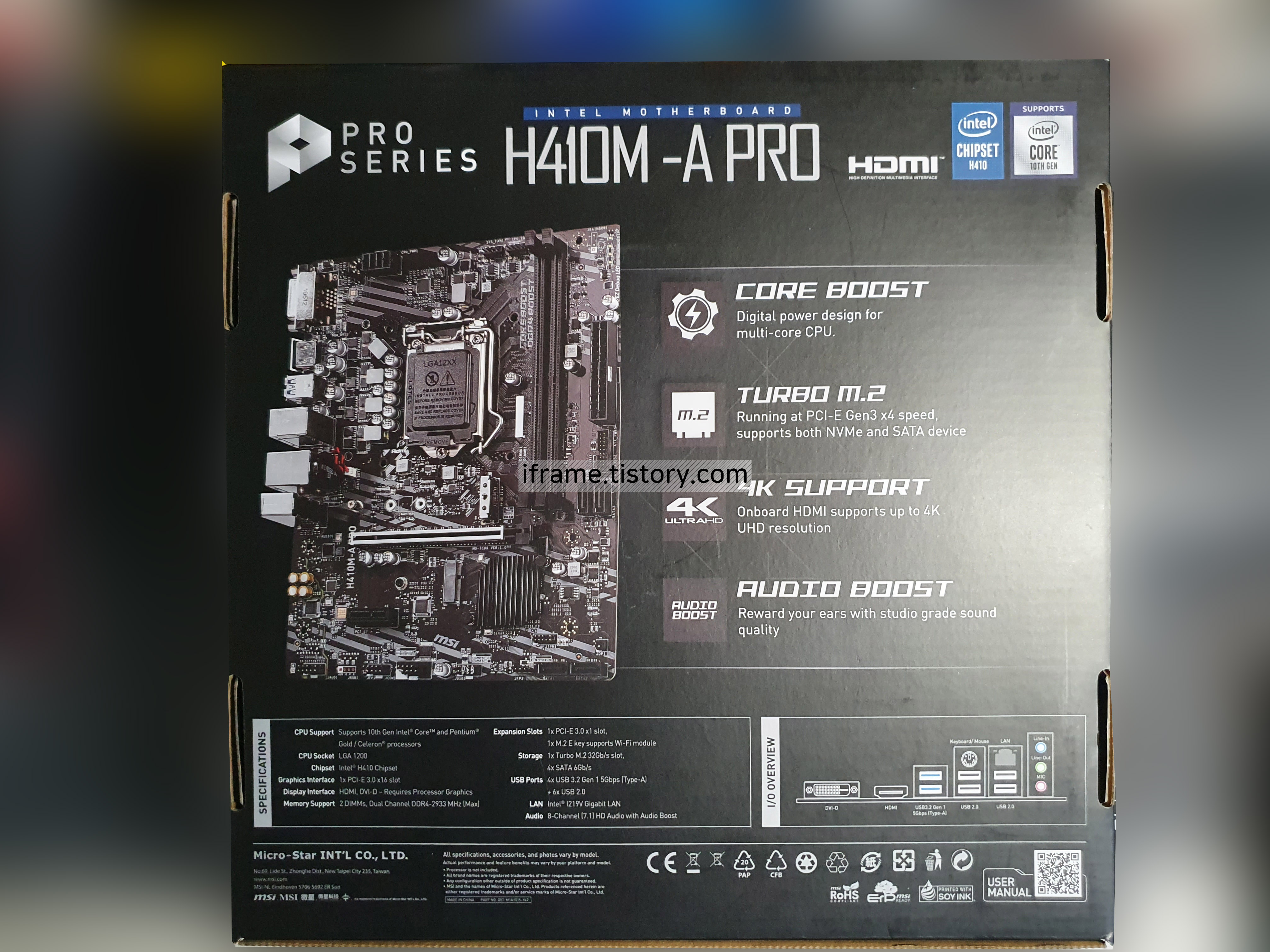 보드는 msi의 H410M-A PRO로 선택하였습니다. NVMe를 지원하는 M.2 슬롯이 있어 980 PRO 같은 SSD를 사용할 수 있는게 특징입니다.