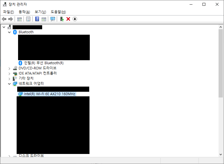 장치 관리자를 확인하면 블루투스 드라이버 및 AX210 드라이버가 잡혀있음을 확인할 수 있습니다. 블루투스를 지원하는 헤드폰이나 키보드 등을 연결하면 사용이 가능합니다.
