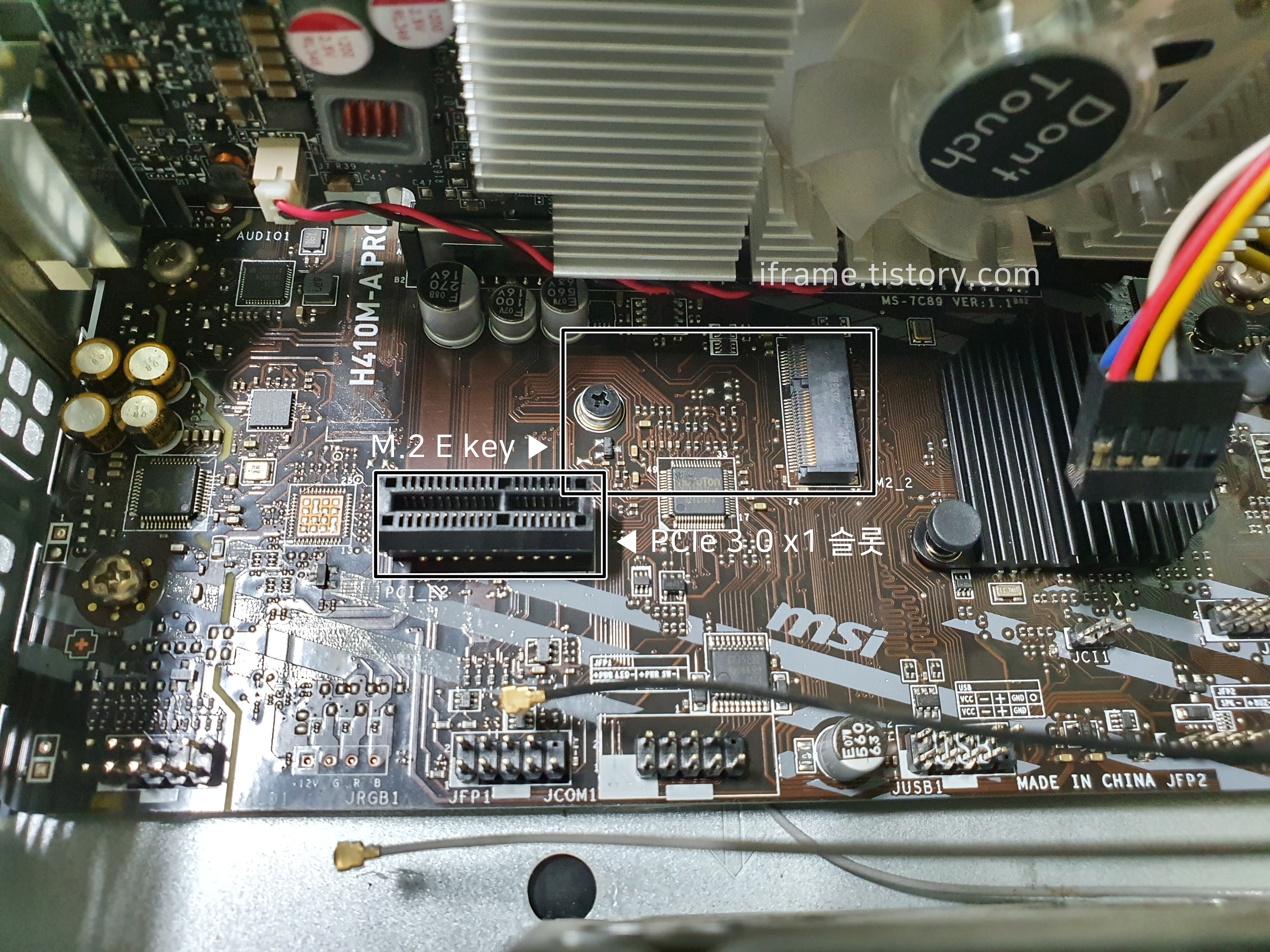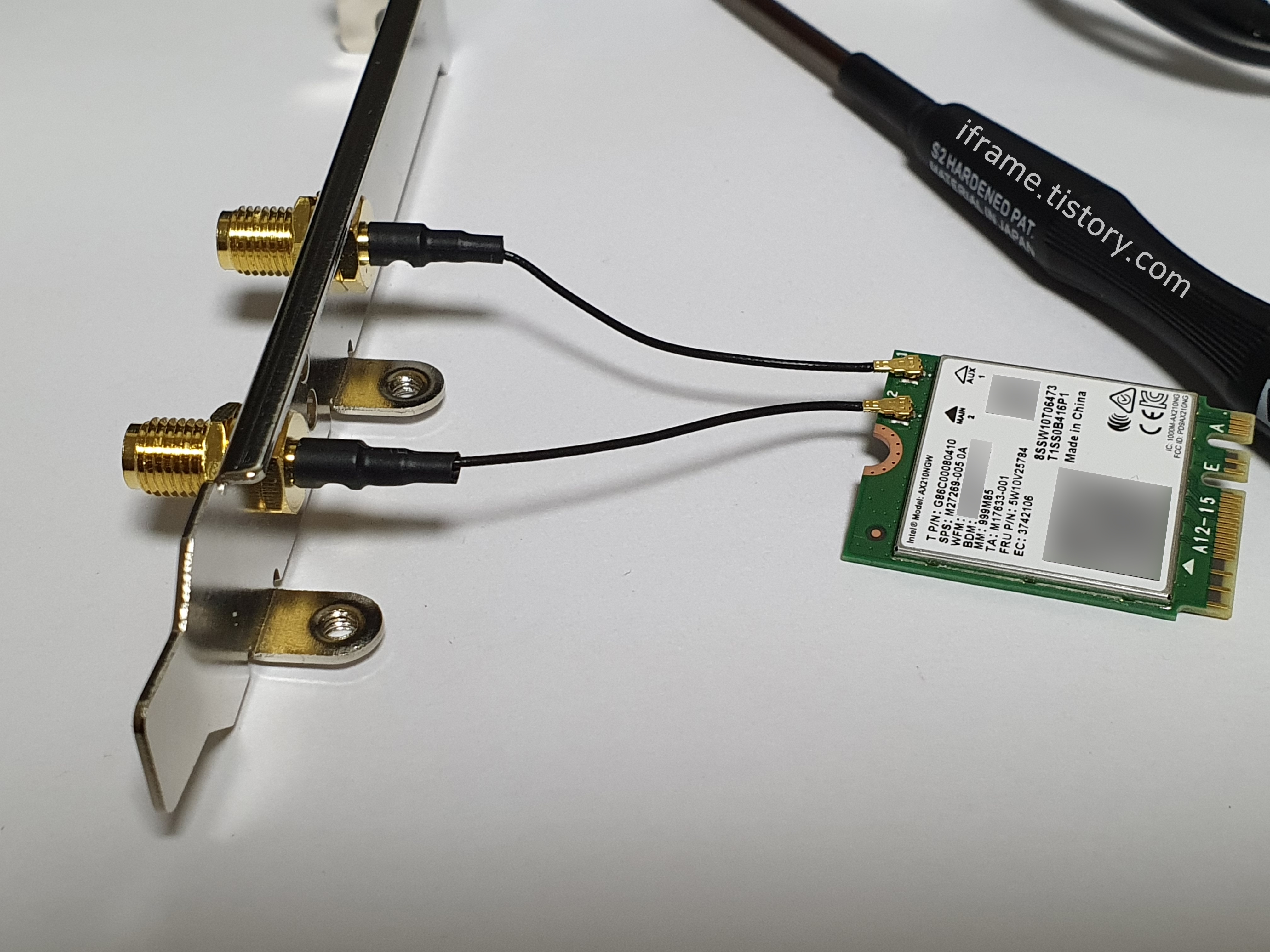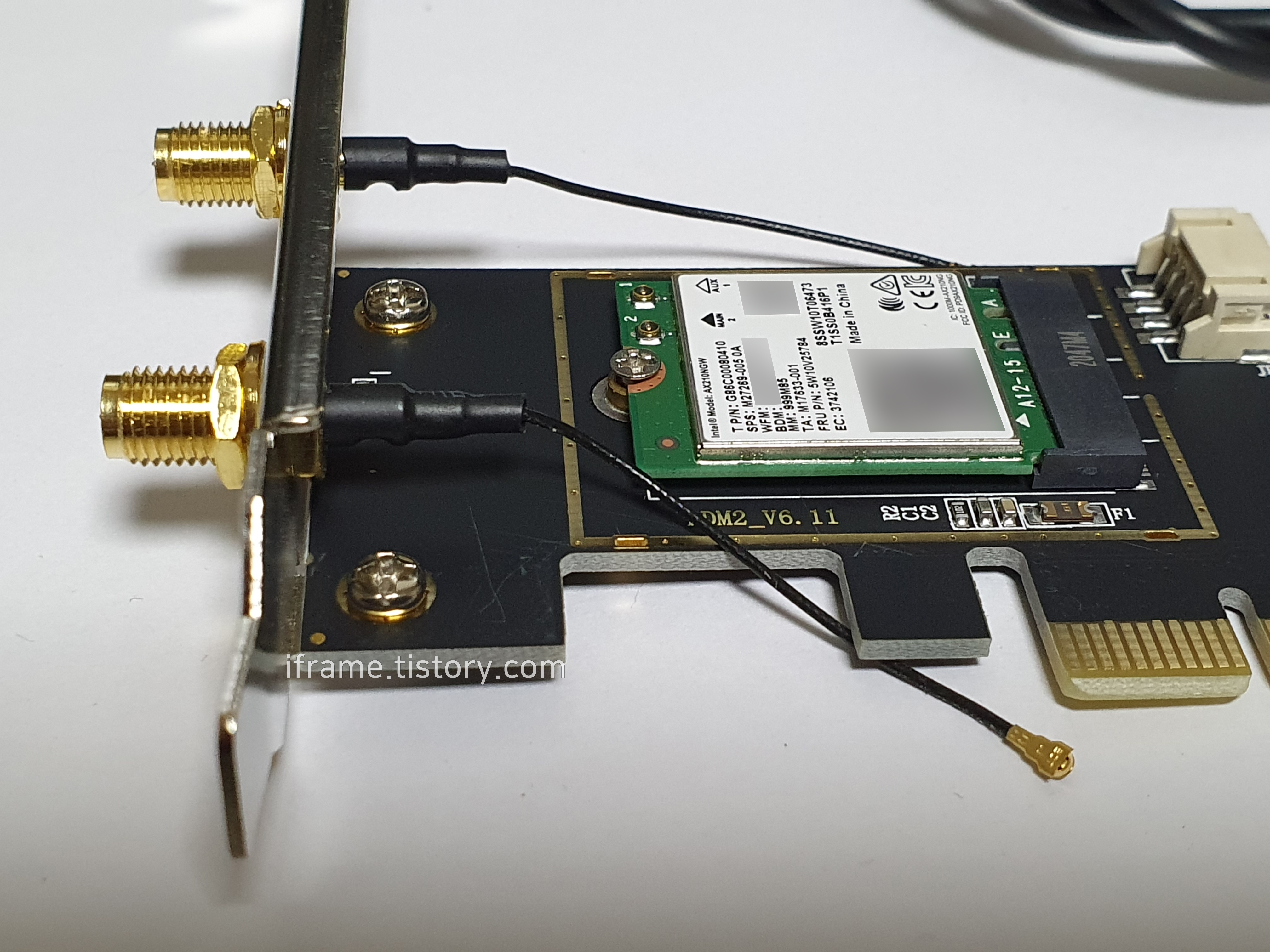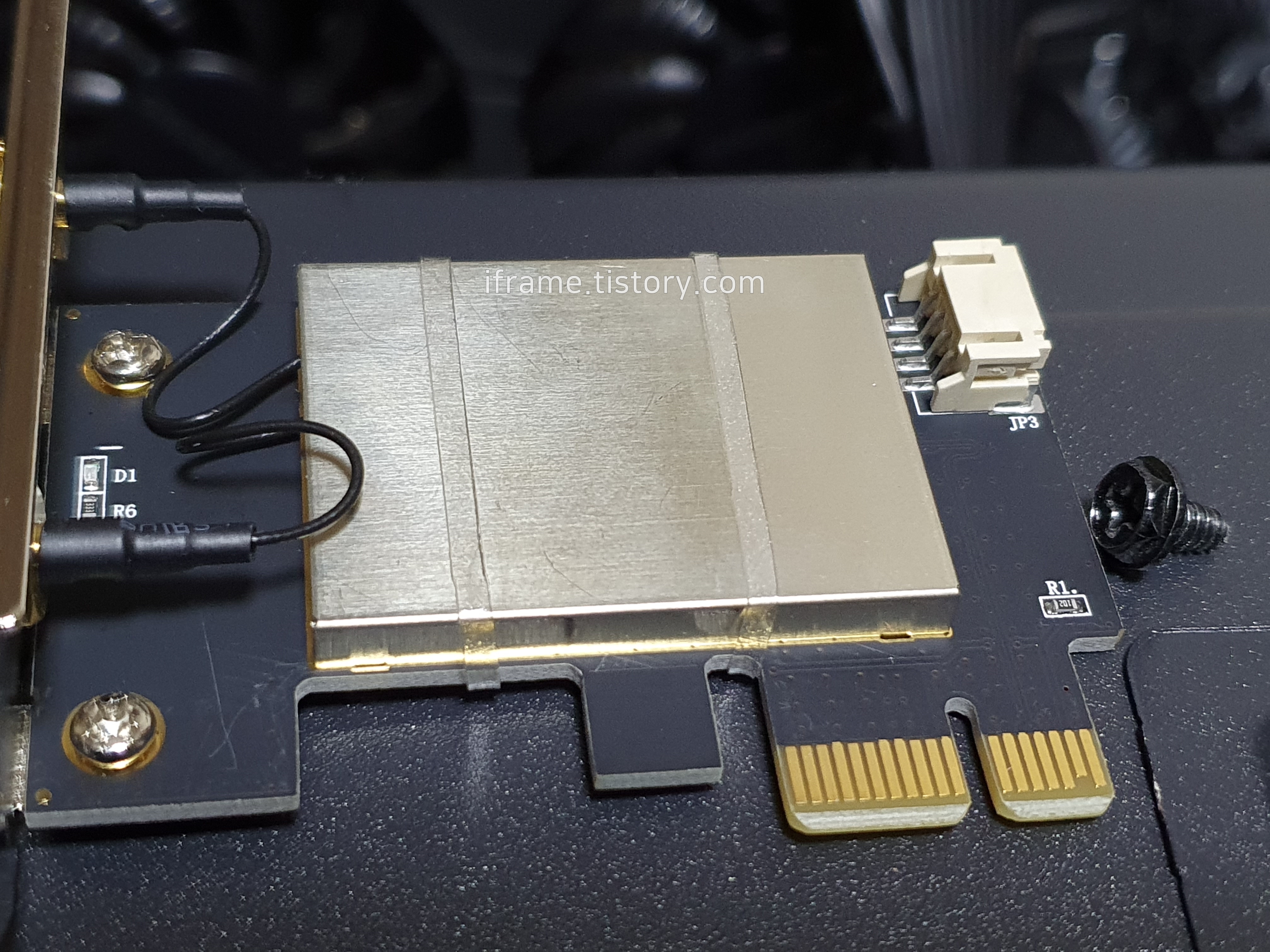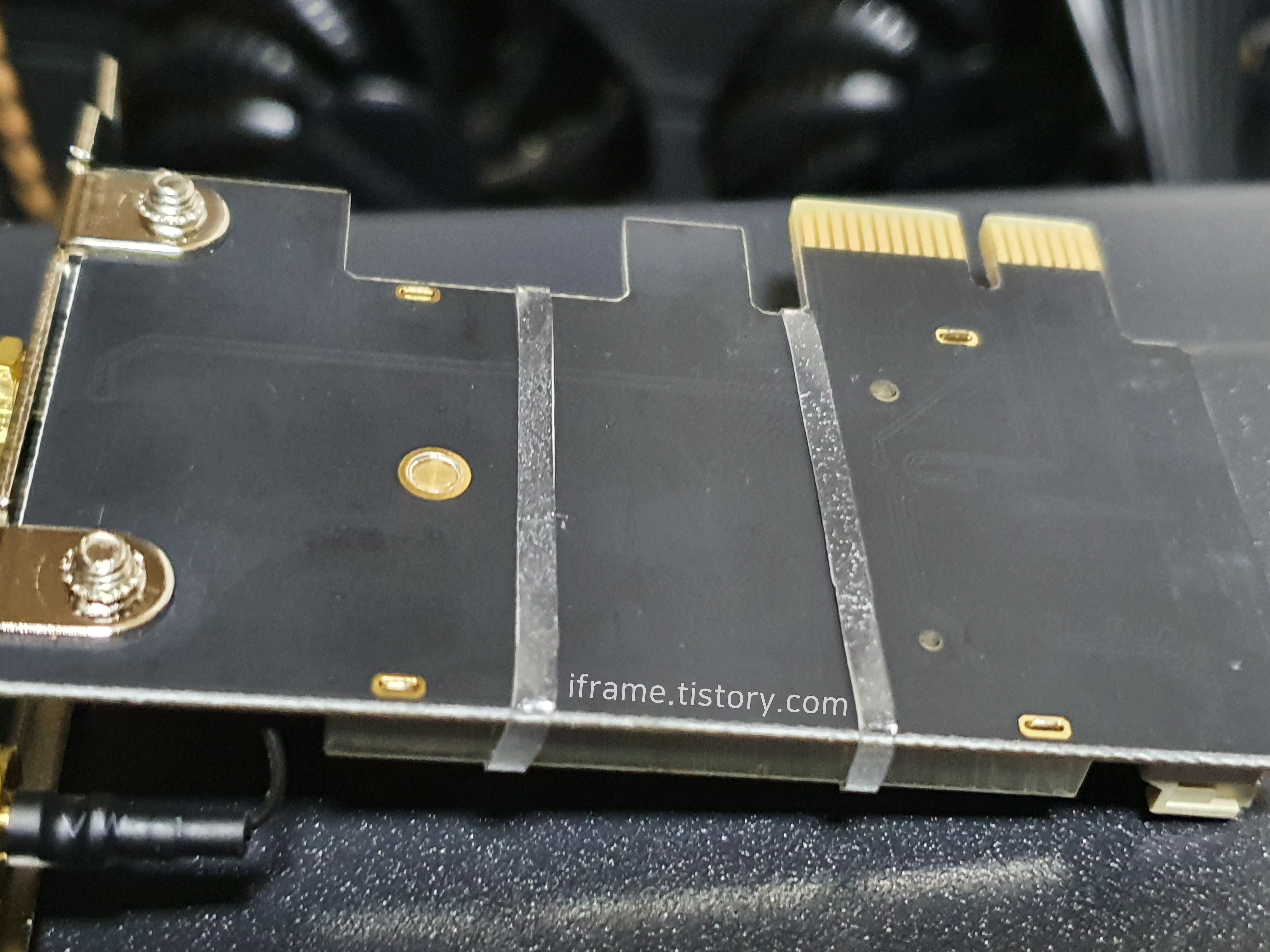 위 사진 속 보드에는 M.2 E Key와 PCIe 슬롯이 있어 원하는 방법으로 설치할 수 있습니다. 공간 차지를 줄여 깔끔하게 정리하고 싶다면 M.2 E Key 슬롯에 AX210을 장착 후 안테나 케이블을 연결하면 설치가 완료됩니다. 하지만 필자의 경우 컴퓨터를 바꾸다 보니 위 사진 속 메인보드가 아닌 MSI B450M 보드를 사용 중이다 보니 해당되는 M.2 슬롯이 없어 PCIe 슬롯에 끼워 진행했습니다.