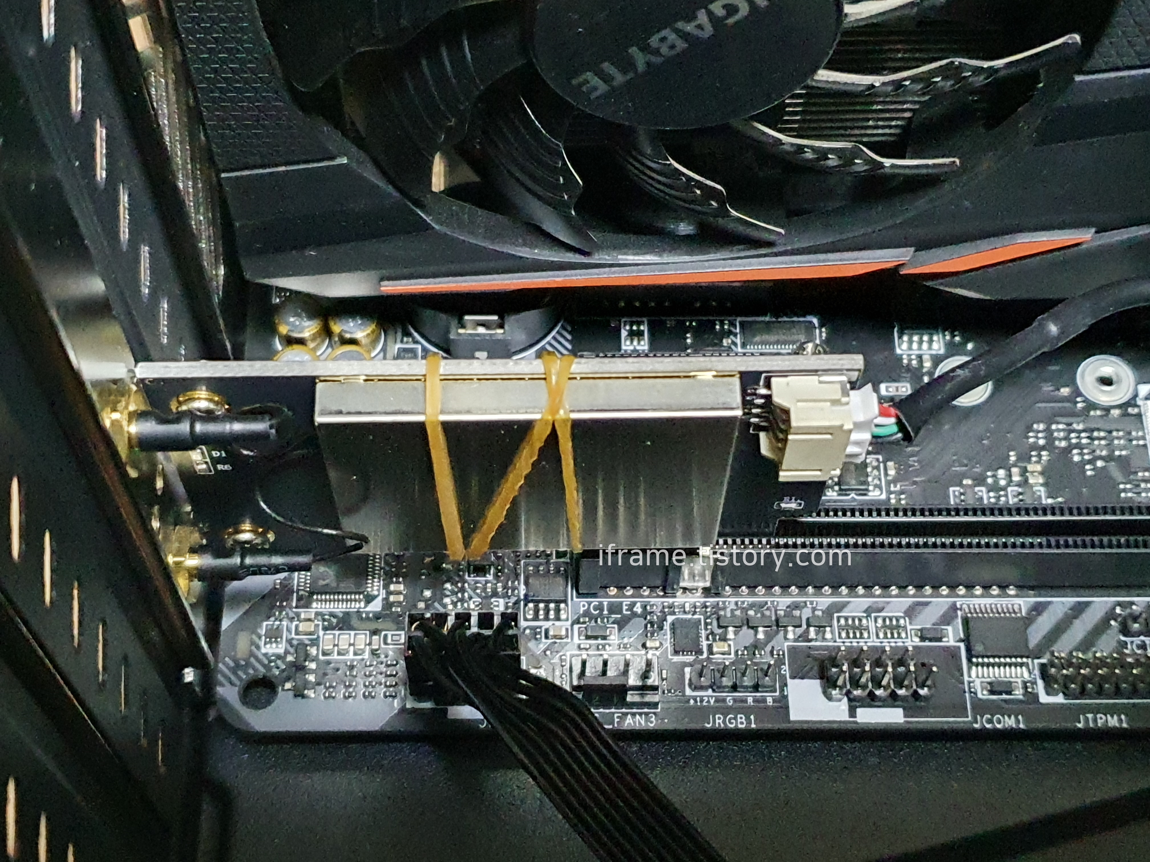 메인보드에 PCIe x1 슬롯이 있으나 그래픽카드 쿨러와 너무 가까워서 한 칸 아래에 끼웠습니다.