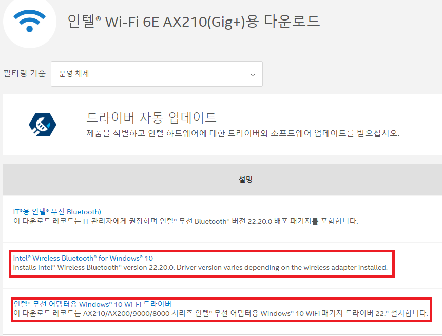 링크를 눌러서 드라이버를 미리 다운로드한 후, AX210 장착을 한 후에 설치하시면 됩니다. 32비트 및 64비트 드라이버가 있으며 파일 이름에 표기되어 있습니다. (예> driver64 → 64비트 전용)