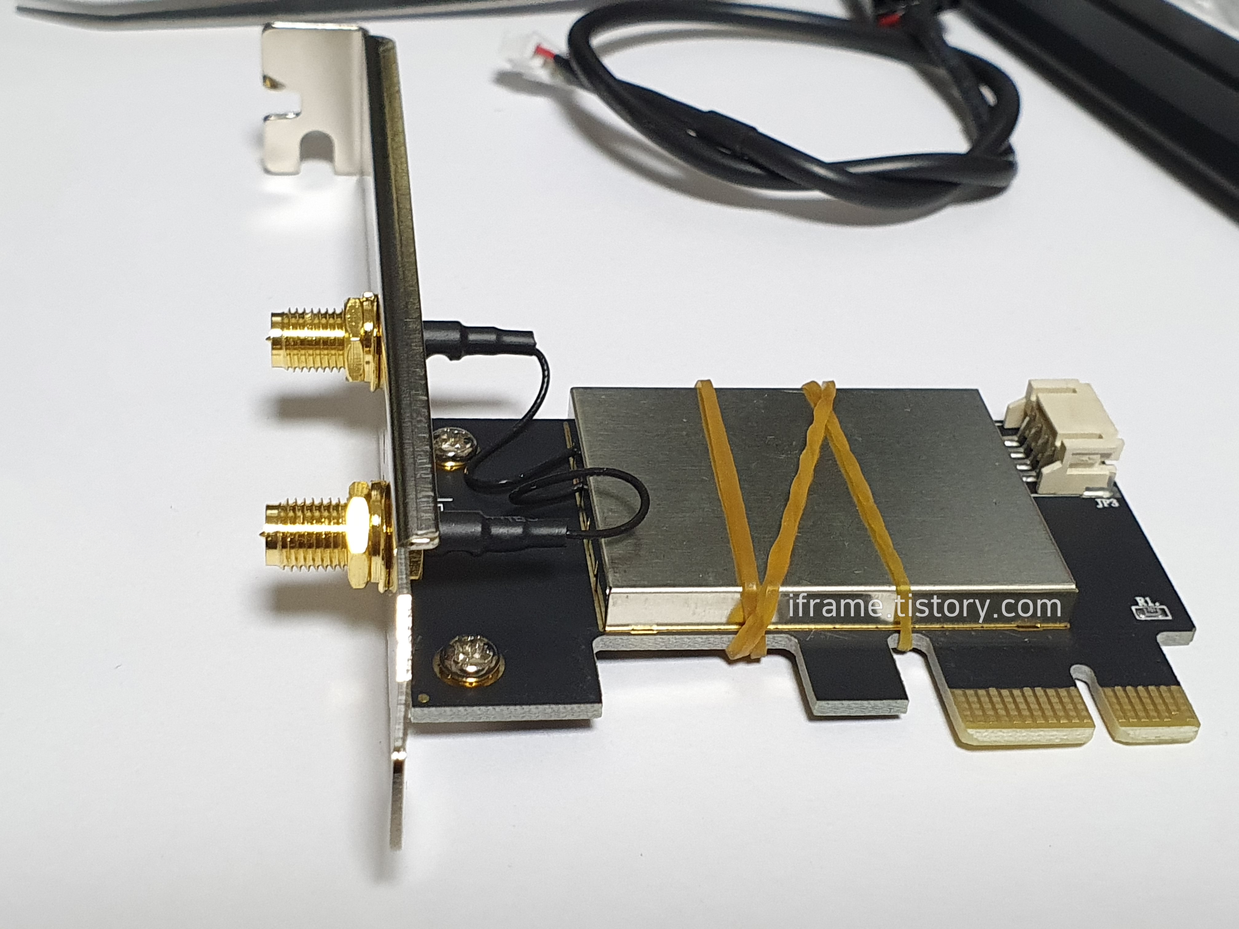 브래킷을 PCIe 어댑터에 끼운 후 랜카드도 장착합니다. 사진에는 안테나를 연결하지 않았으나 꼭 연결하셔야 합니다. 그렇지 않을 경우 공유기가 가까이에 있어도 수신율이 매우 낮아집니다.