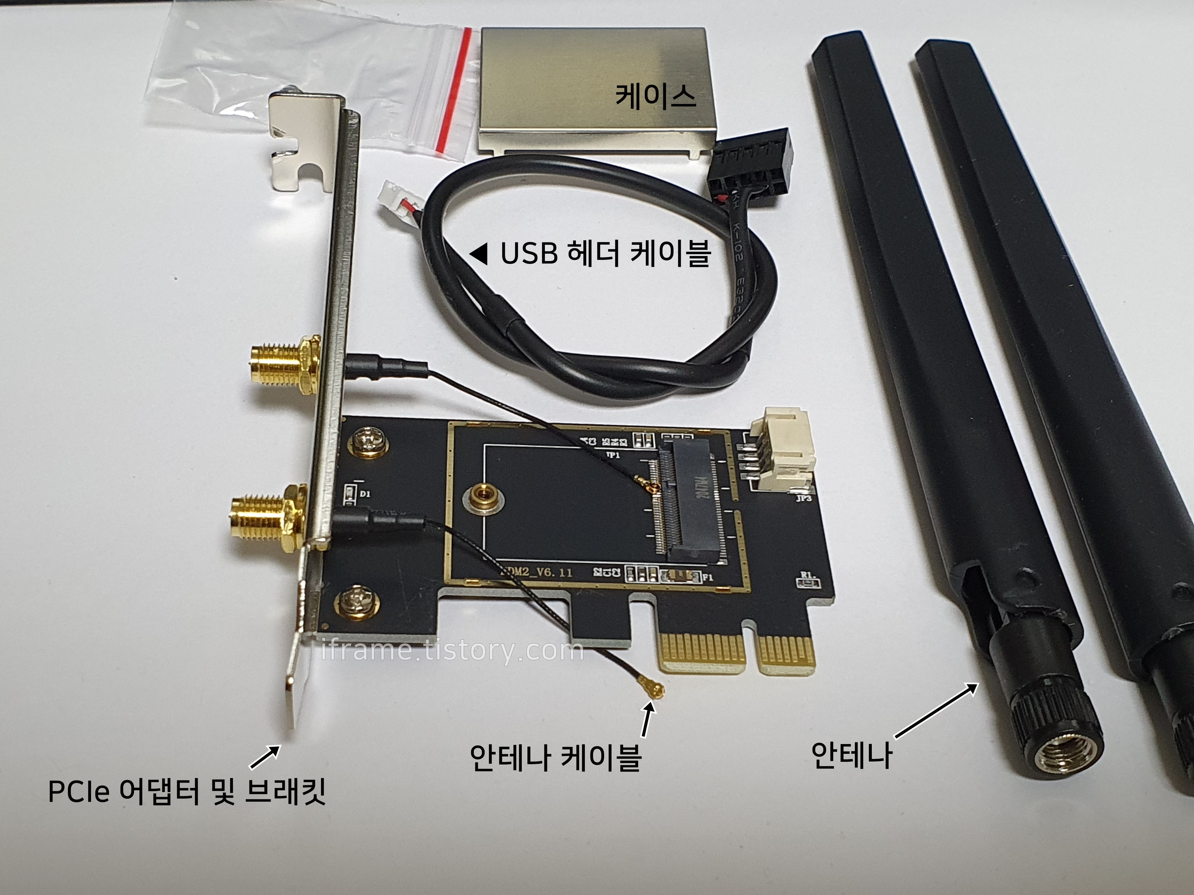 구성은 사진에서 알 수 있듯 안테나와 PCIe 어댑터, USB 헤더 케이블, 덮개(사진에선 케이스라 표기) 구성입니다. 판매처에 따라 구성은 일부 상이할 수 있습니다. 사진 속 안테나는 사용하지 않고 랜카드와 같이 주문한 안테나를 사용했습니다.