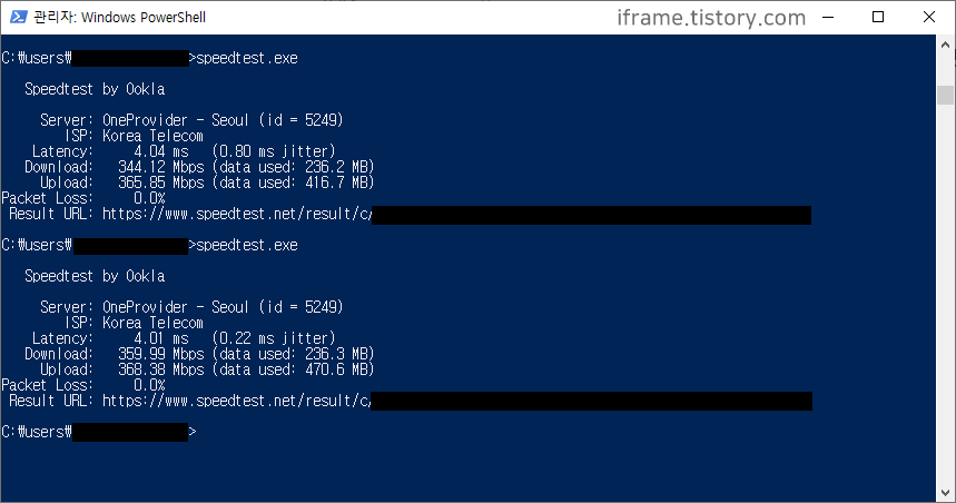 공유기는 콘크리트 벽 하나를 두고 두 번 측정해봤습니다. 사진 속 프로그램은 Speedtest.net에서 제공하는 Speedtest CLI를 사용했습니다. 필자가 이전에 사용하던 E사의 USB로 연결하는 무선랜카드보다 안정적이지만 속도는 큰 차이가 없었습니다. 필자의 경우 속도가 불만이라서 바꾼다기보다 안정적이며 블루투스가 지원돼서 바꾸는 이유가 큽니다.