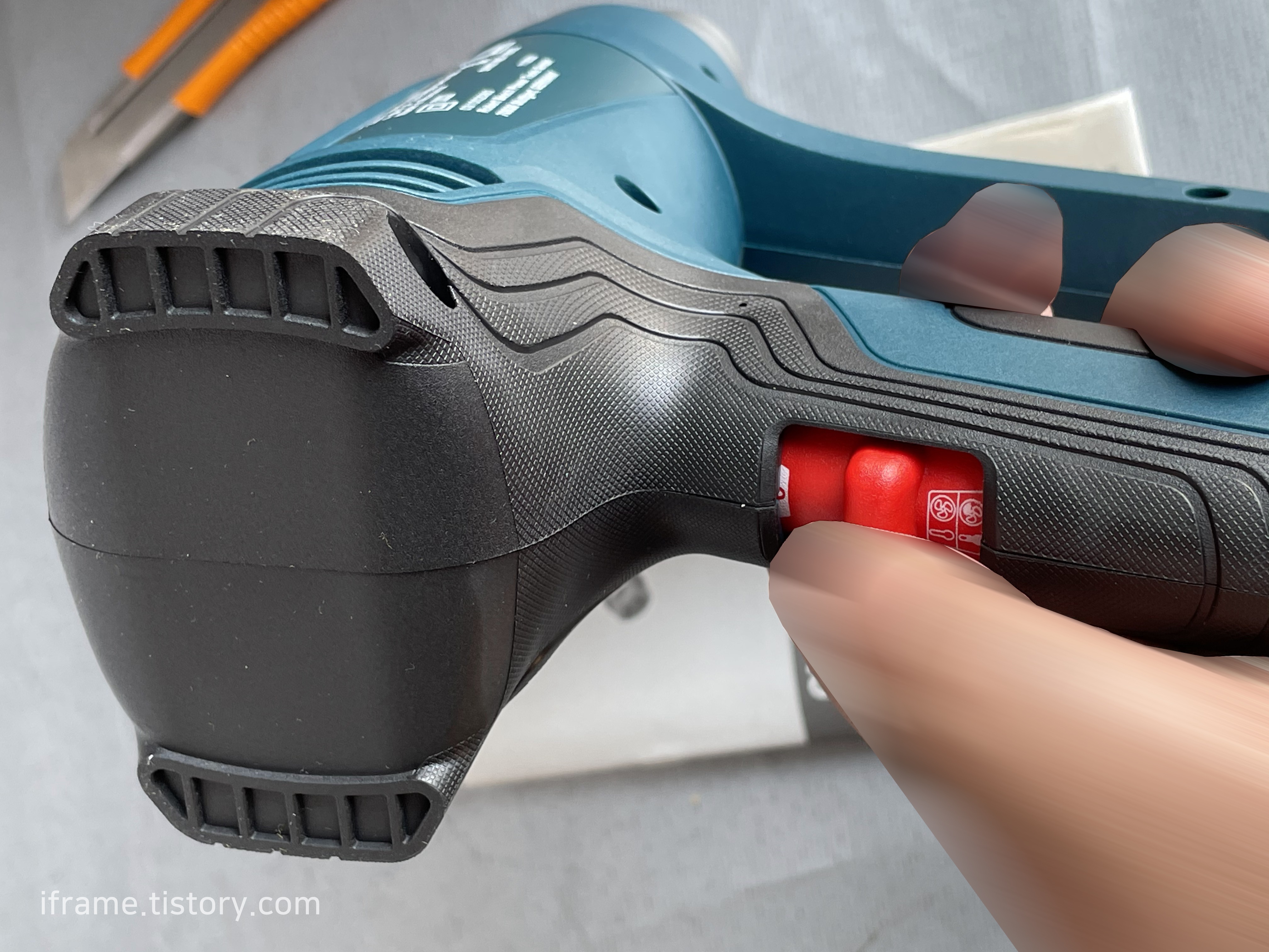손에 쥐었을 때 모습으로, 전동 드라이버나 글루건 같은 제품을 사용해보셨다면? 익숙하실 수 있는 사용 형태입니다. 편안하게 잡을 수 있고, 무게는 개인차가 있지만 적당하여 손에서 쉽게 놓치지 않고 손가락이 들어가는 부분이 넓어서 사용하기 편했습니다.