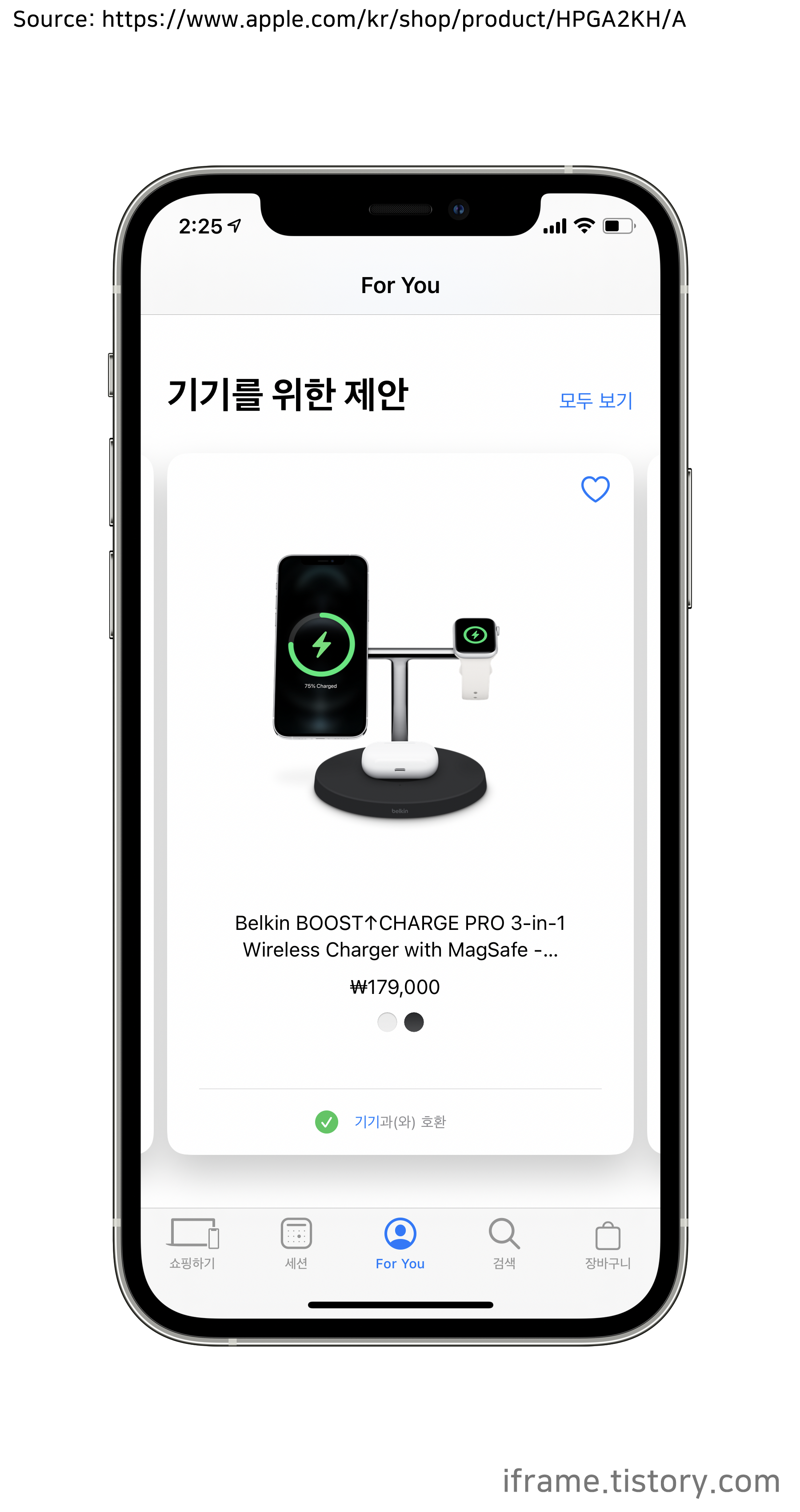 * 2021년 5월 현재 iPhone 12 시리즈만 MagSafe를 정식 지원하며 이전에 출시한 iPhone도 MagSafe를 사용할 수 있긴 하지만 충전기 자석에 잘 붙지 않거나 떨어질 수 있으며, 고속 무선 충전이 지원되지 않을 수도 있습니다.