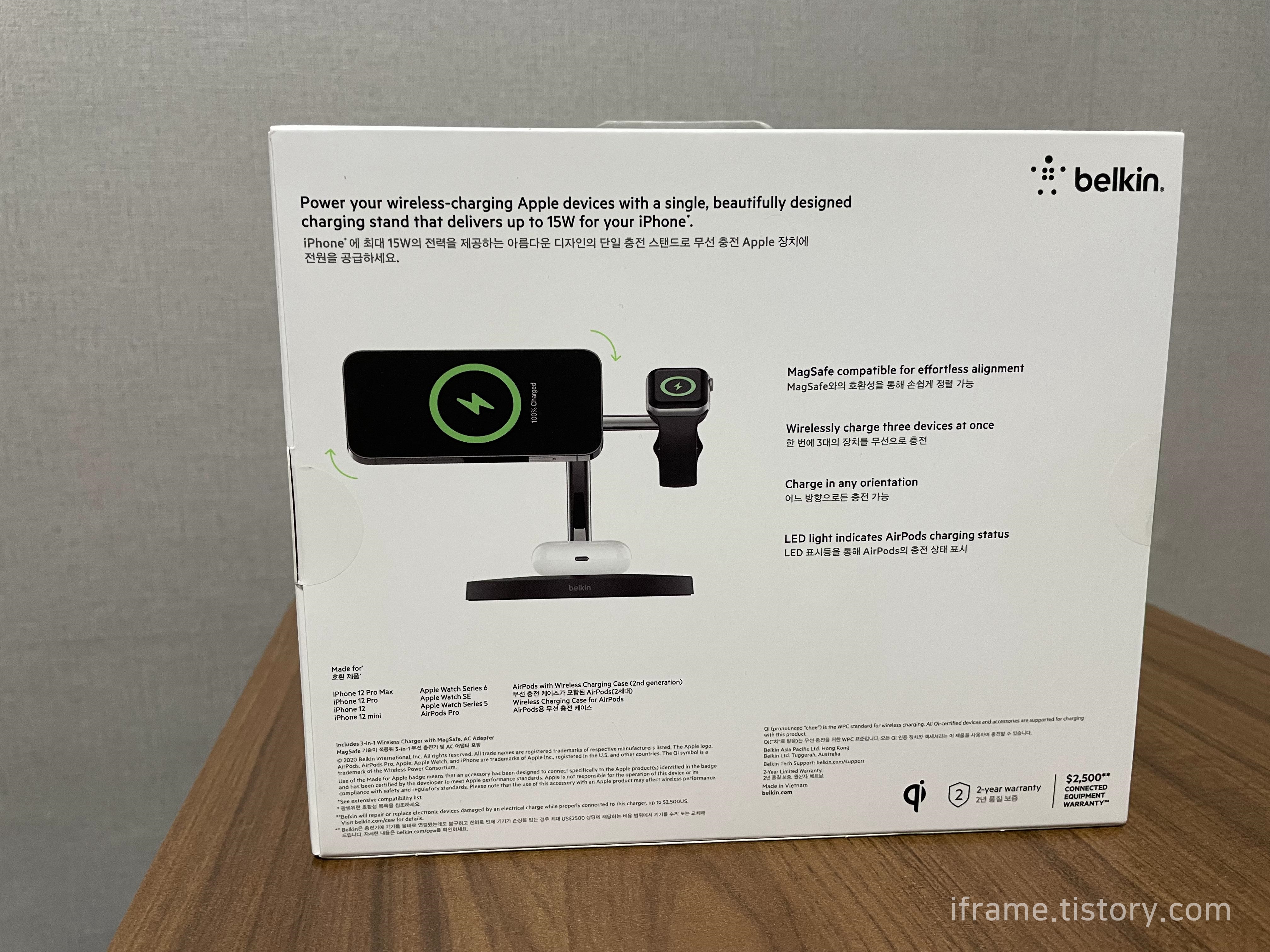 무엇보다 MagSafe 듀오 충전기는 본체만 제공되지 어댑터는 별매라는 점 때문에 선택하지 않았습니다. 같은 값이면 다홍치마를 선택한다는 속담처럼 이왕이면 환경에 좋지 않은 어댑터도 주고, Qi 규격 충전기도 본체 하단에 탑재되어 있어서 3가지의 기기를 한 번에 충전할 수 있다는 건 너무나 매력적이죠!