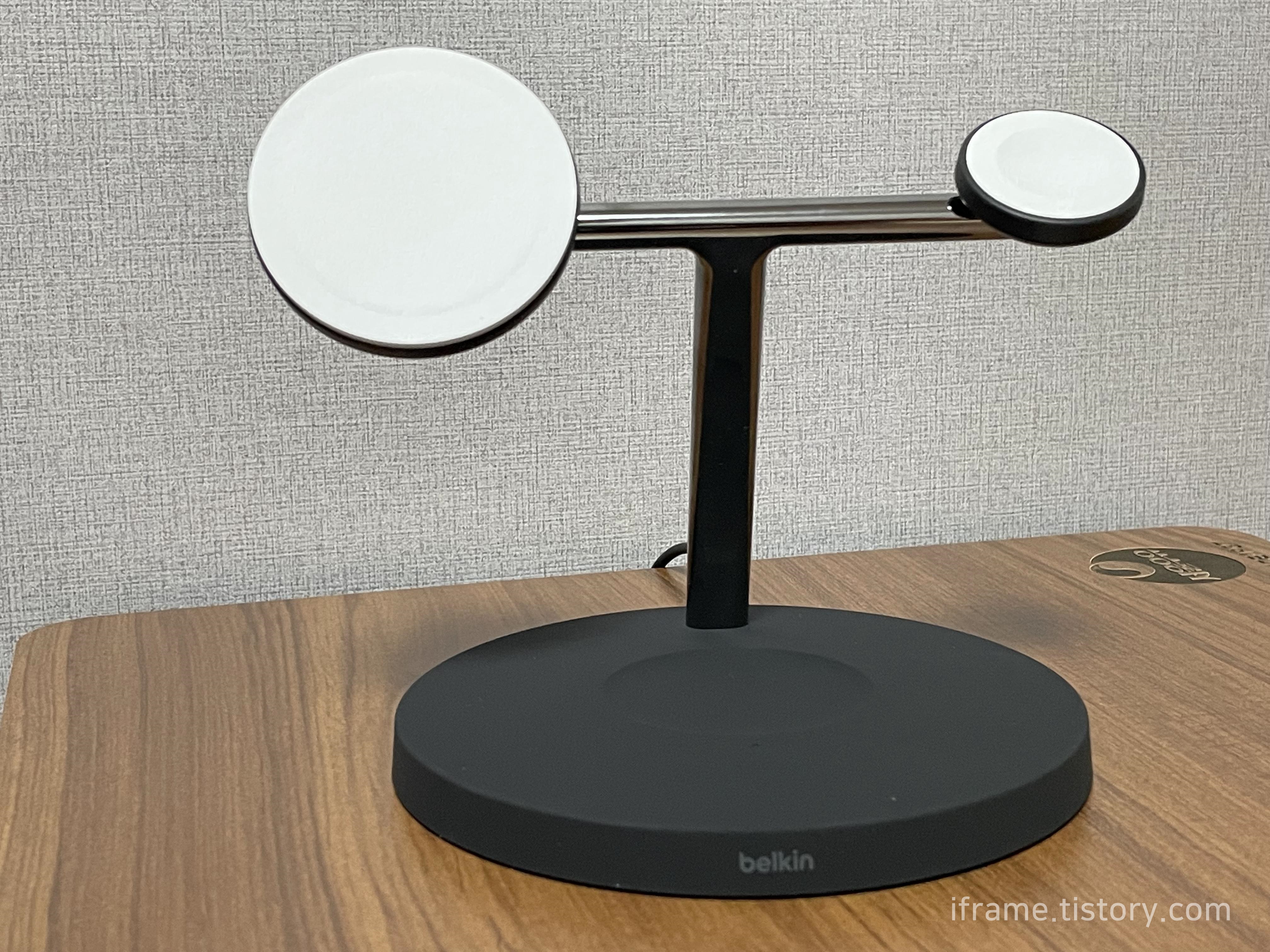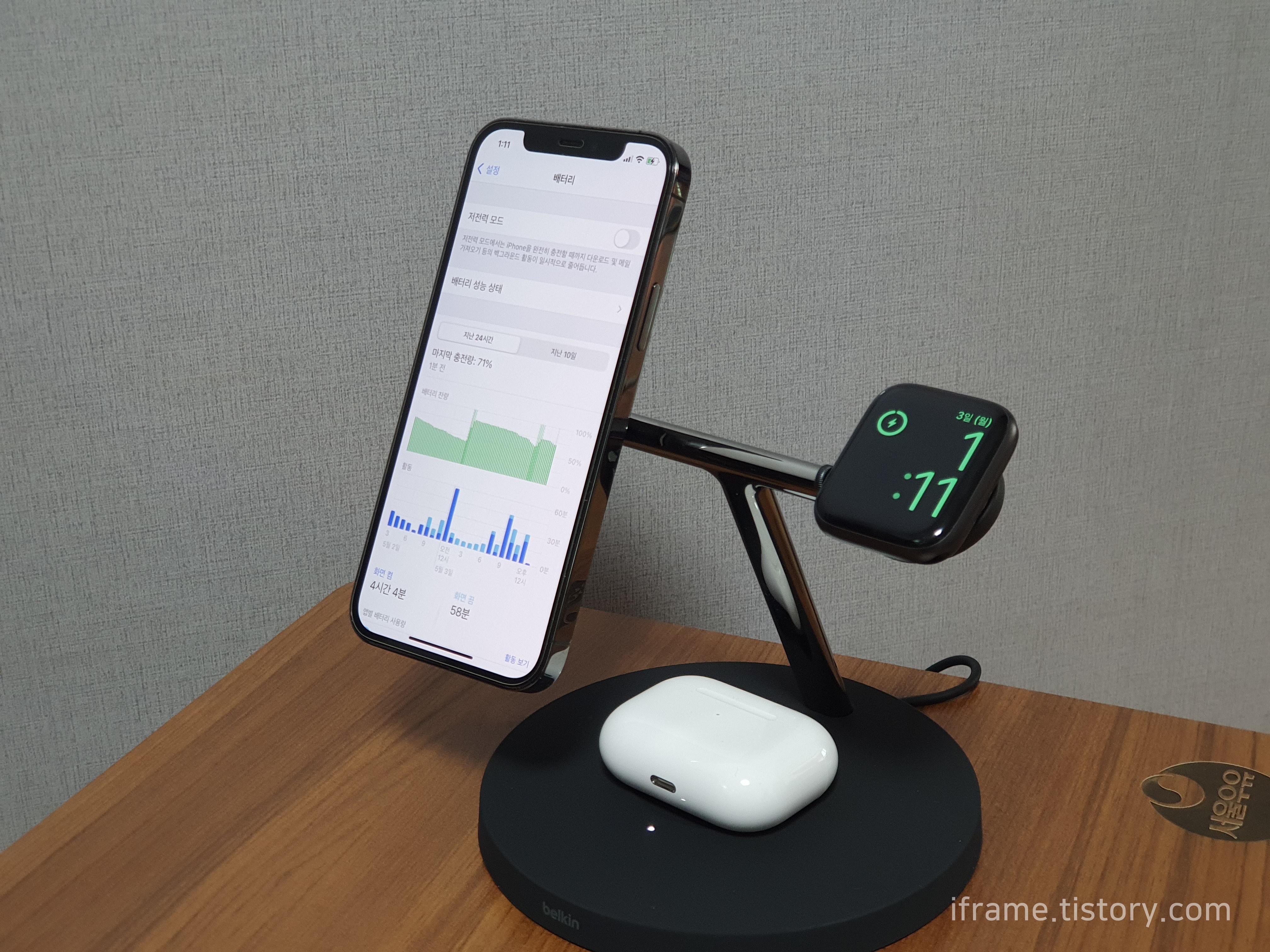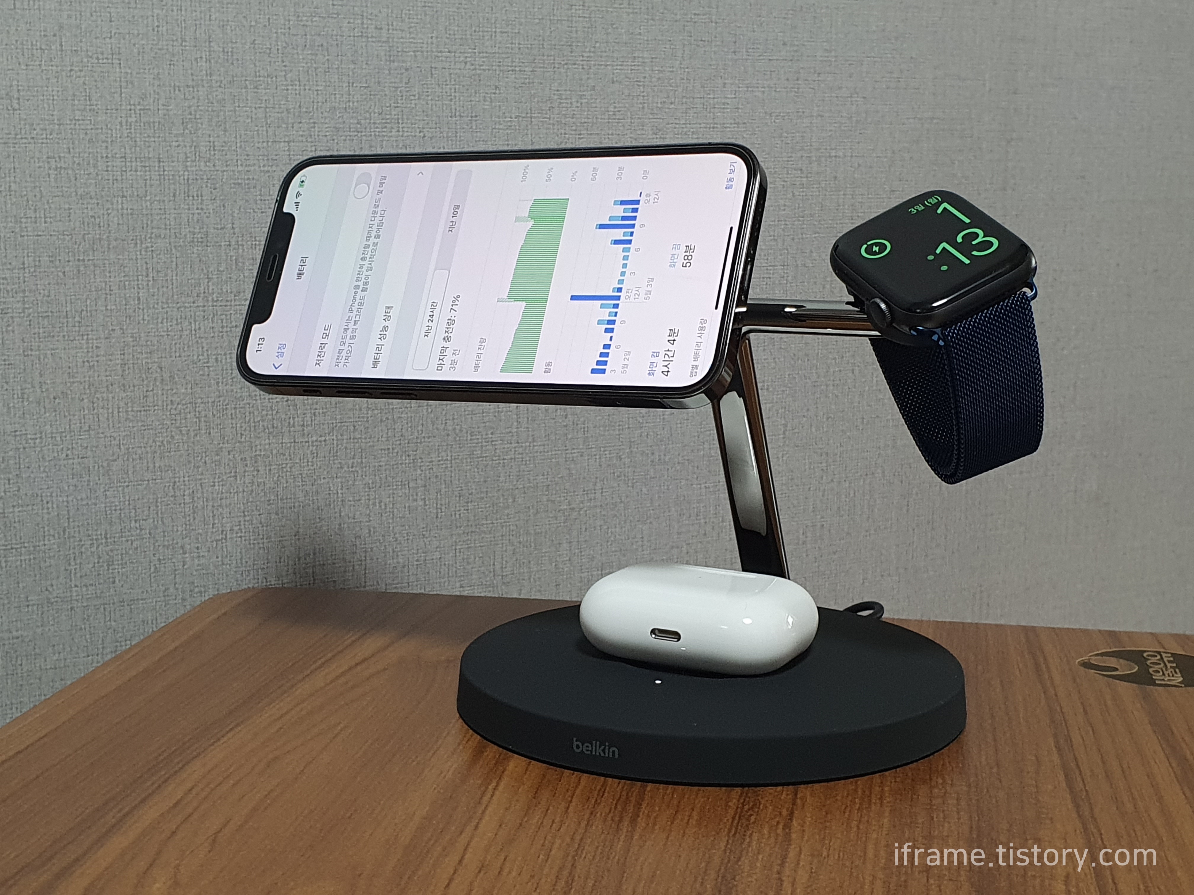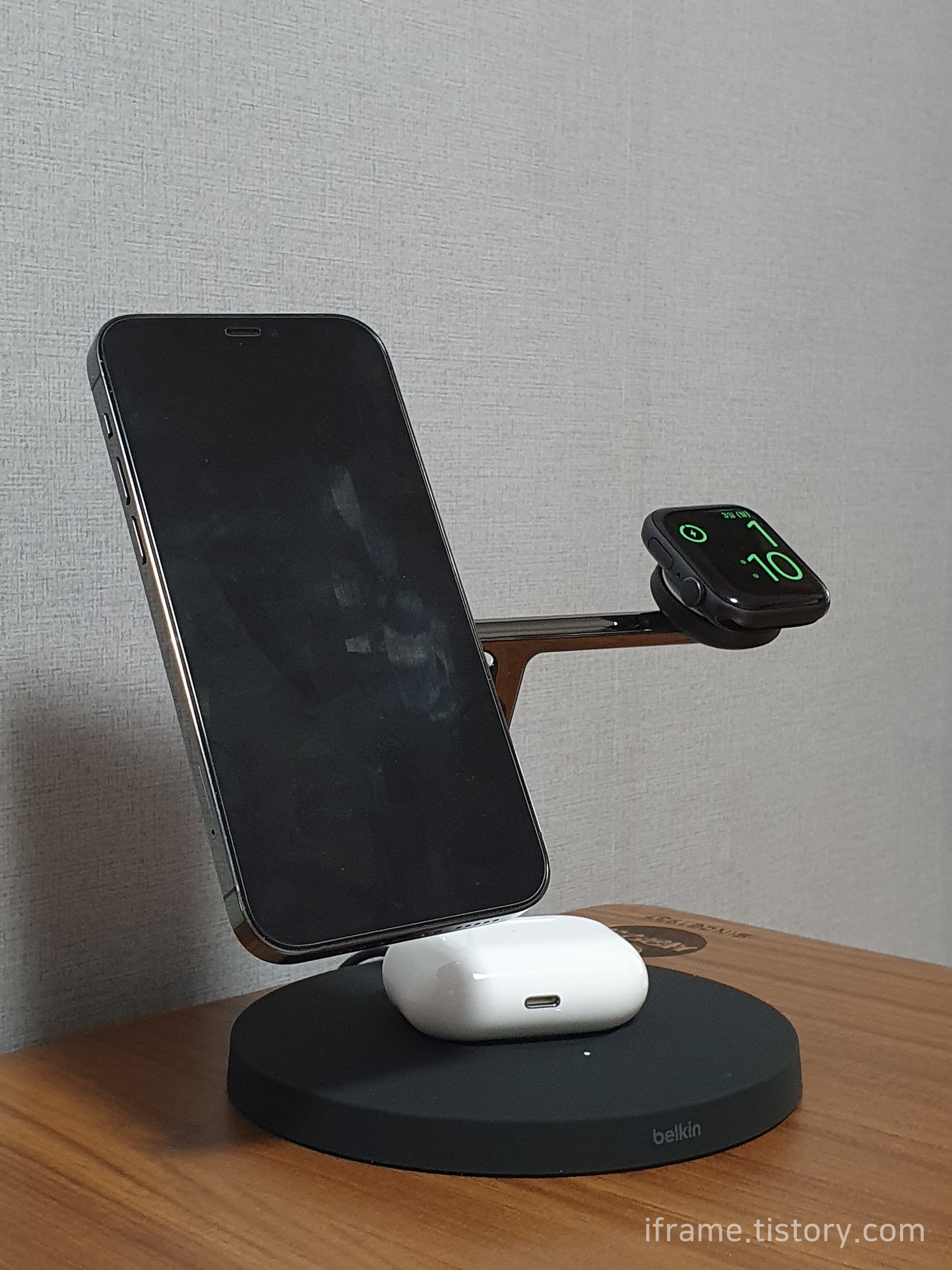 기둥이 단단하다 보니 iPhone 12 Pro Max 같이 무거운 휴대폰을 올려 두고 사용하더라도 안정적으로 사용이 가능합니다. 비슷한 디자인의 3in1 충전기는 시장에서 저렴한 가격에 판매하고 있지만 가격이 높더라도 belkin의 충전기가 잘 팔리는 이유가 있긴 하나 봅니다.