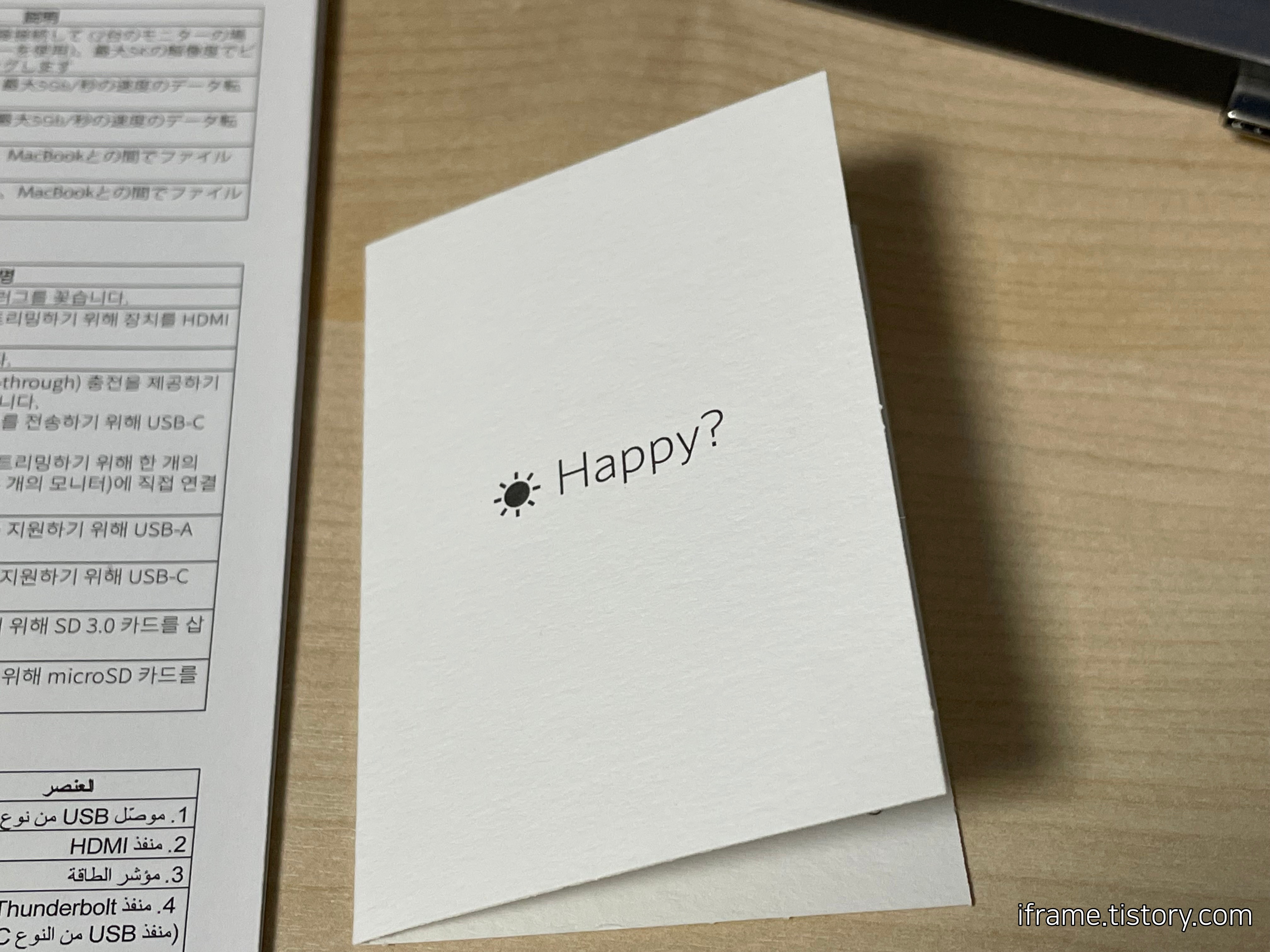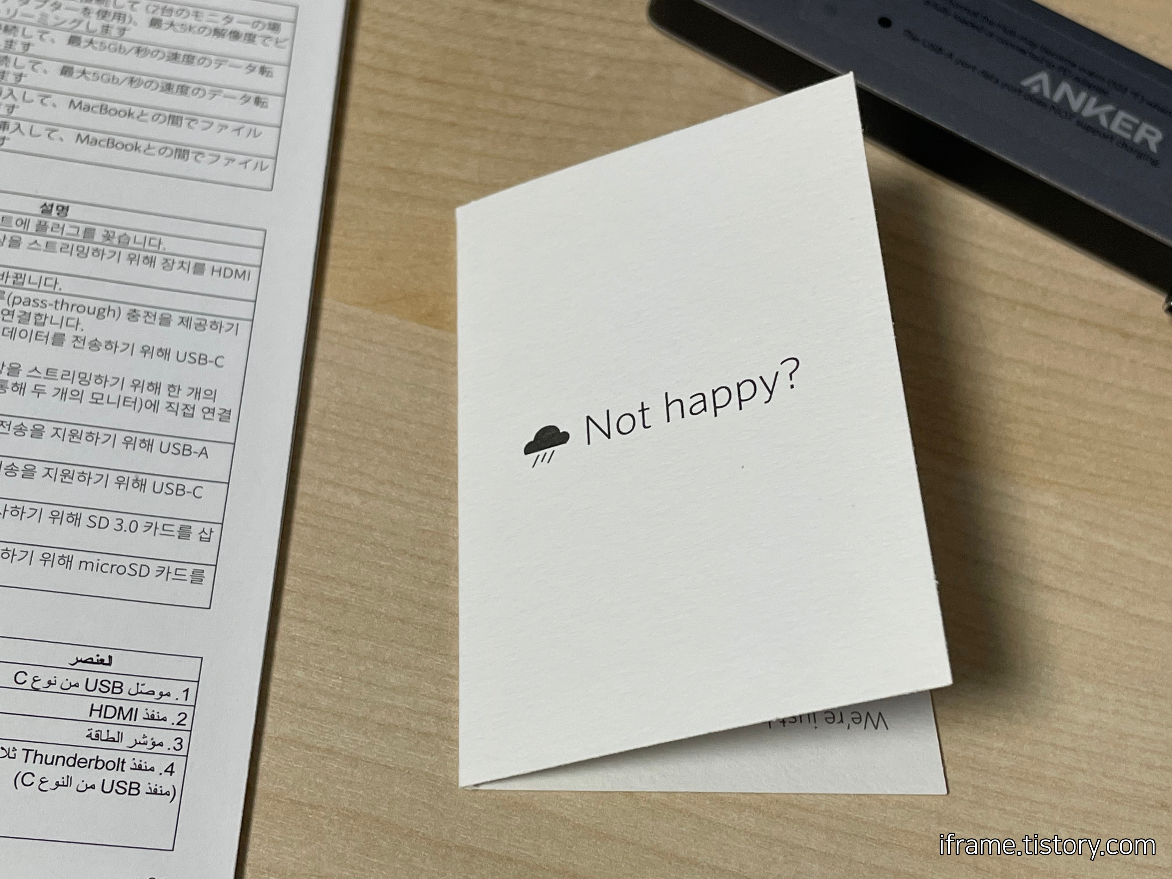 제품을 구매하신 고객님. 행복하신가요? 아니면, 행복하지 않으신가요?를 물어보는데 펼쳐보면 제품에 대한 만족도는 어떠신가? 추천 좀 해주시고 Amazon에 리뷰 좀 써주시고 Facebook 등에 공유 좀 해달라는 내용이 있고, 그렇지 아니할 경우 고객센터에 연락하시라는 배려를 보여줍니다.