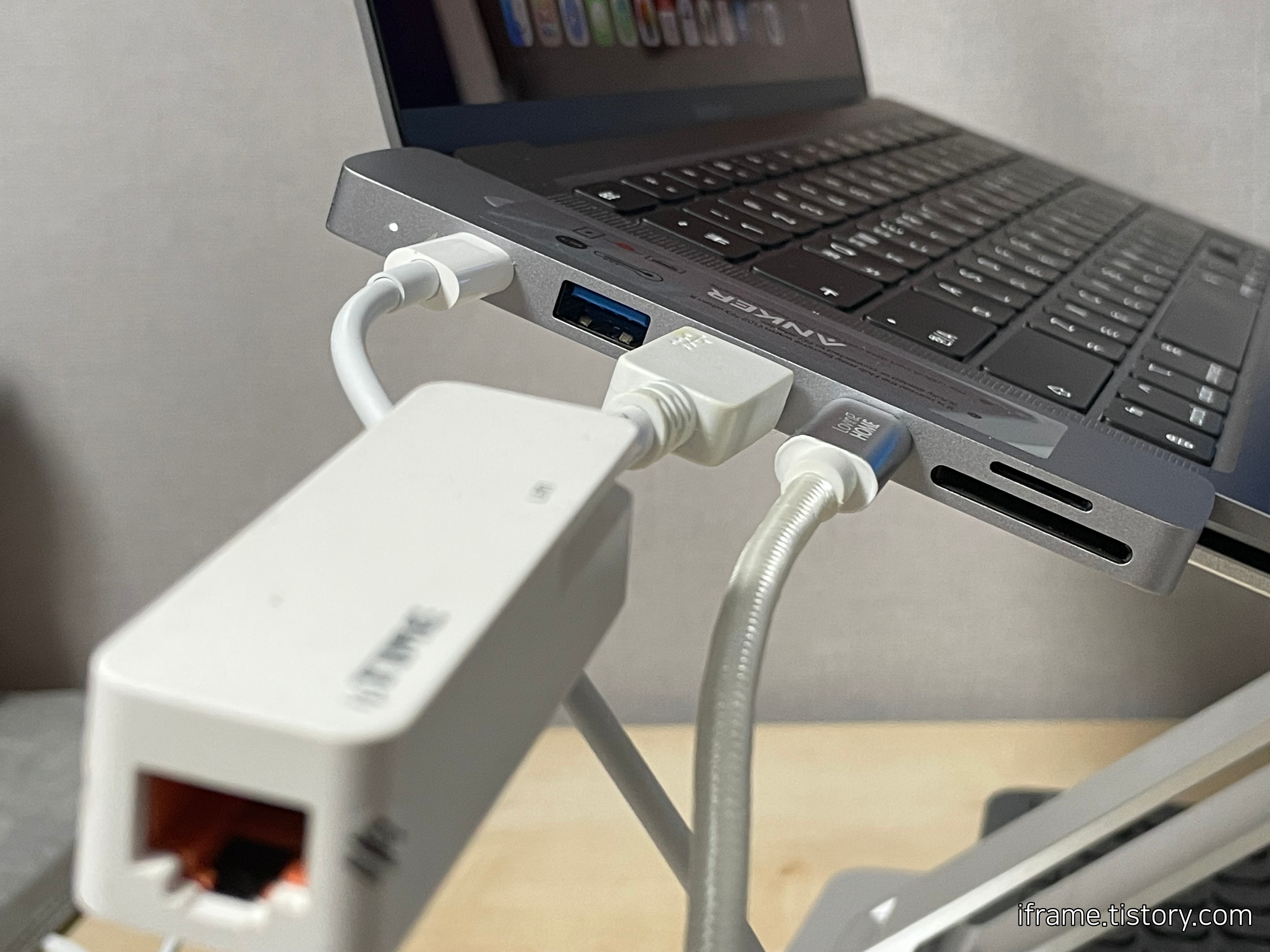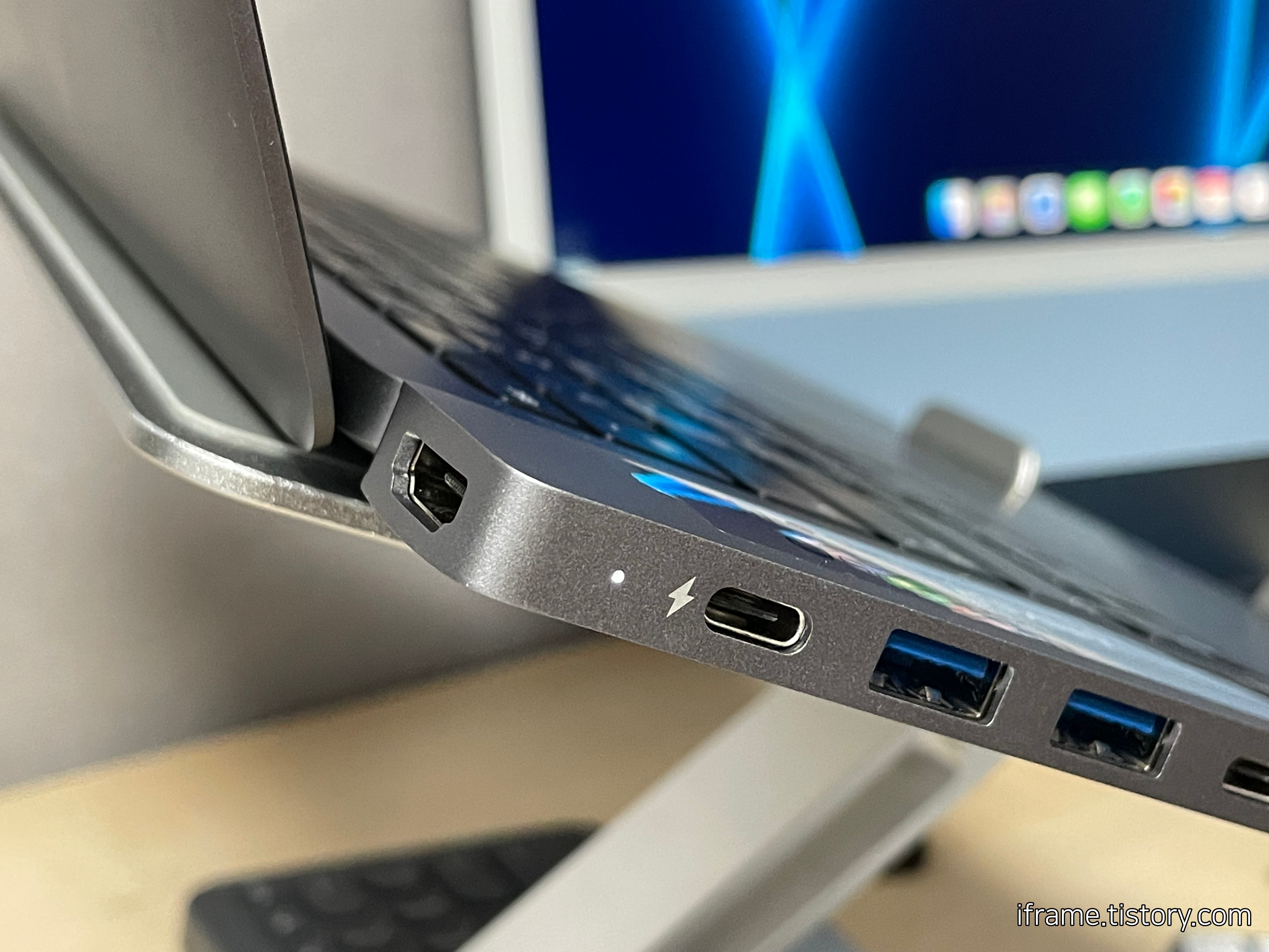 리뷰하려고 찍어둔 사진도 많고... 한번 작업을 시작하면 꽤 오랫동안 컴퓨터를 사용하는데 충전하면서 이것저것 연결하기엔 맥북의 USB 단자가 2개밖에 없어서 한계가 생기더라고요. 외장 SSD도 연결하고 충전기도 꽂고. 필요에 따라 HDMI까지 연결하려면 턱없이 부족한 포트를 확장할 겸해서 구매했습니다. 사실 그냥 특가라고 하길래 산 것도 있습니다.