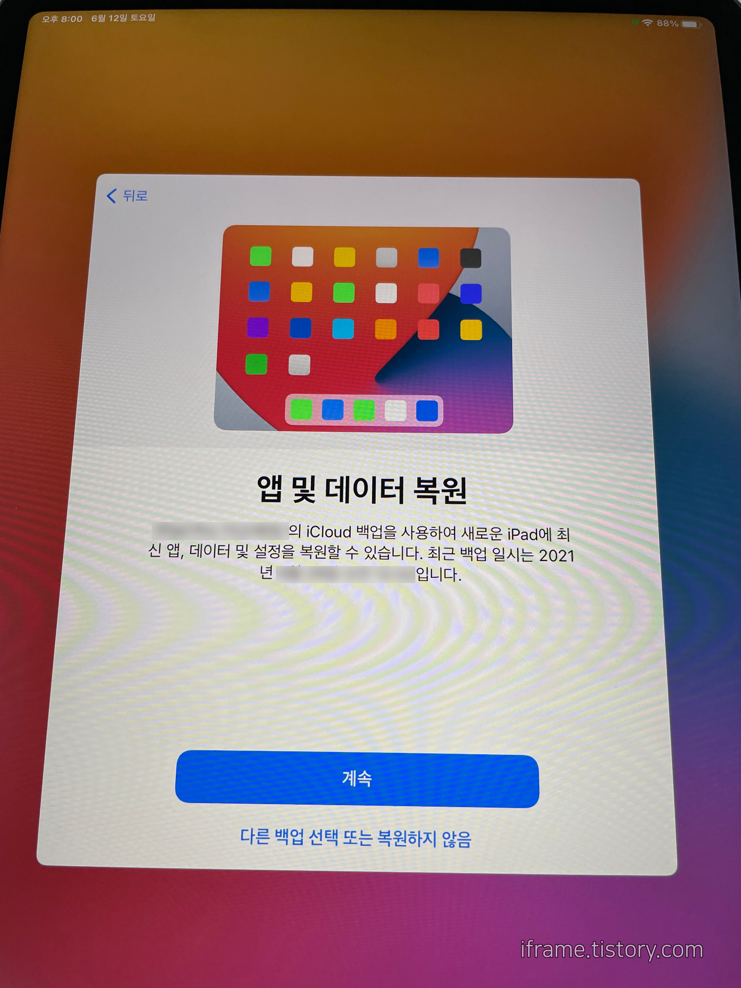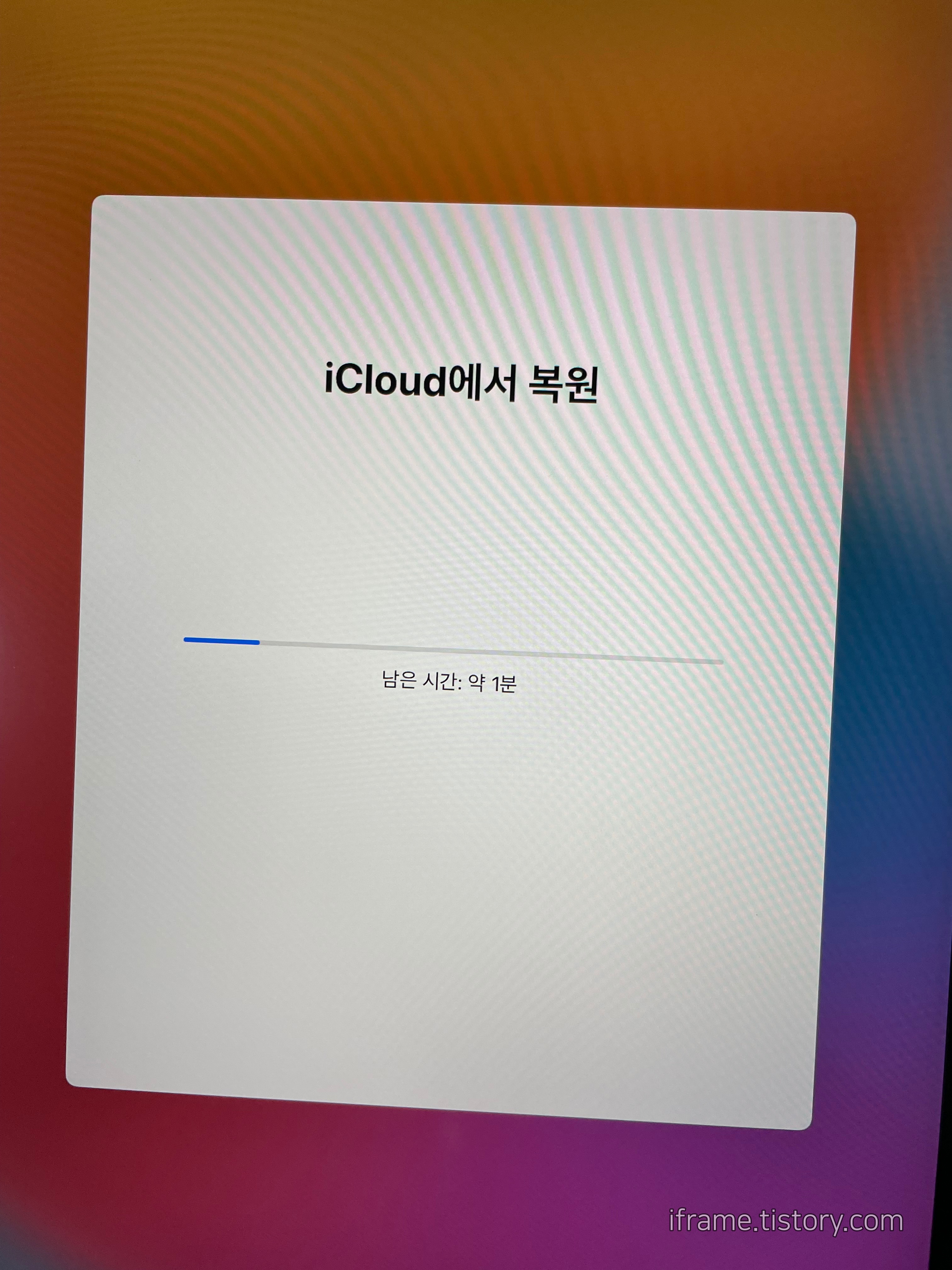네트워크를 연결하고, Apple 계정에 로그인도 하고, iCloud에 저장된 백업을 복원해봤습니다. 근데 복원한 설정 및 데이터가 너무 복잡하고 필요 없는 게 많길래 세팅 후 다시 초기화를 했습니다...;;