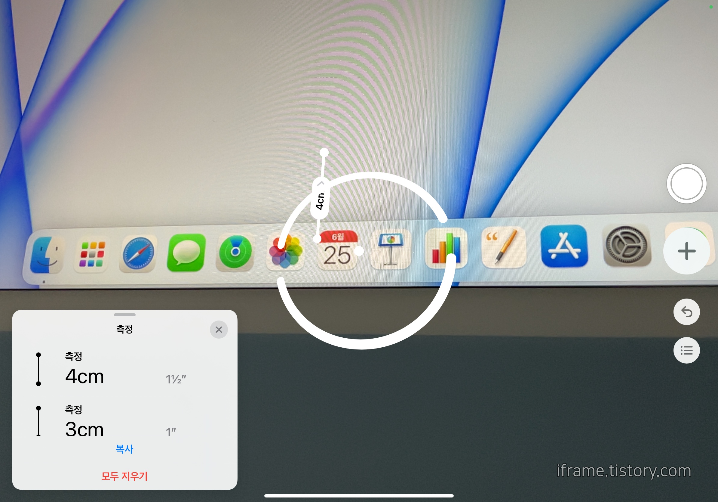 iPad에 기본으로 설치되어 있는 '측정'앱을 사용하면 길이를 측정할 수 있습니다. AR 기반의 센서를 사용함으로써 직접 자를 대어서 측정하는 거보다 편리하고 더 정확도는 더 올라갔습니다. 그렇게 하기 위해서 측정을 하려는 곳의 시작점을 찍은 후, 끝점을 찍으면 길이가 표시됩니다.