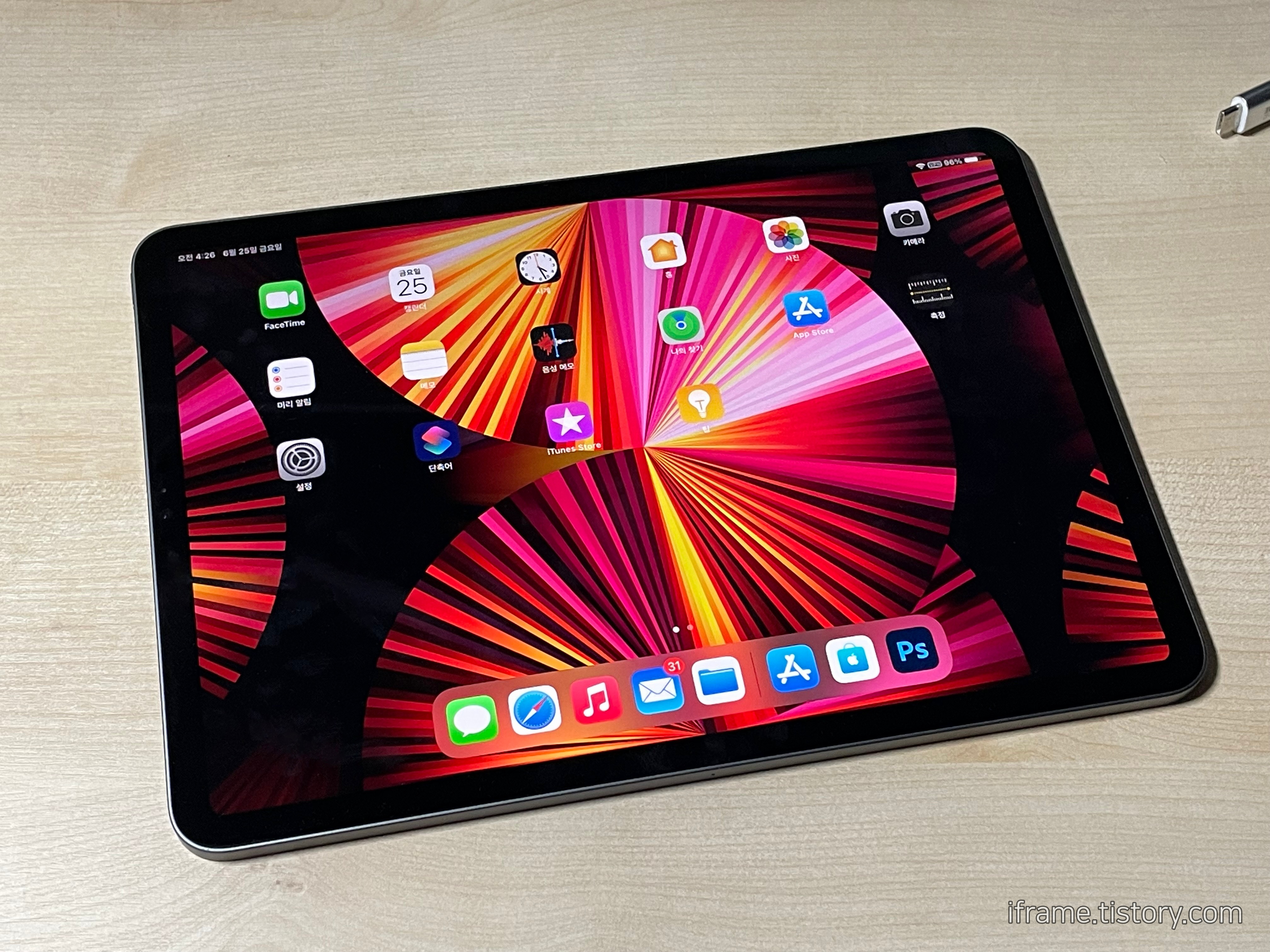 상단은 아이맥을, 하단에는 아이패드를 두고 사용하고 있습니다. 아이맥은 포토샵이나 지금 보고 계신 글을 작성하거나, 프레젠테이션을 제작한다면 아이패드는 파인더를 열어두고 사진을 끌어오거나 메시지 앱을 켜 두고 사용하고 있습니다. Airplay를 기반으로 무선으로 연결하여 사용할 수 있지만, 배터리 문제나 안정성을 생각하여 USB-C 케이블을 이용하여 맥에 직접 연결하여 사용하고 있습니다.