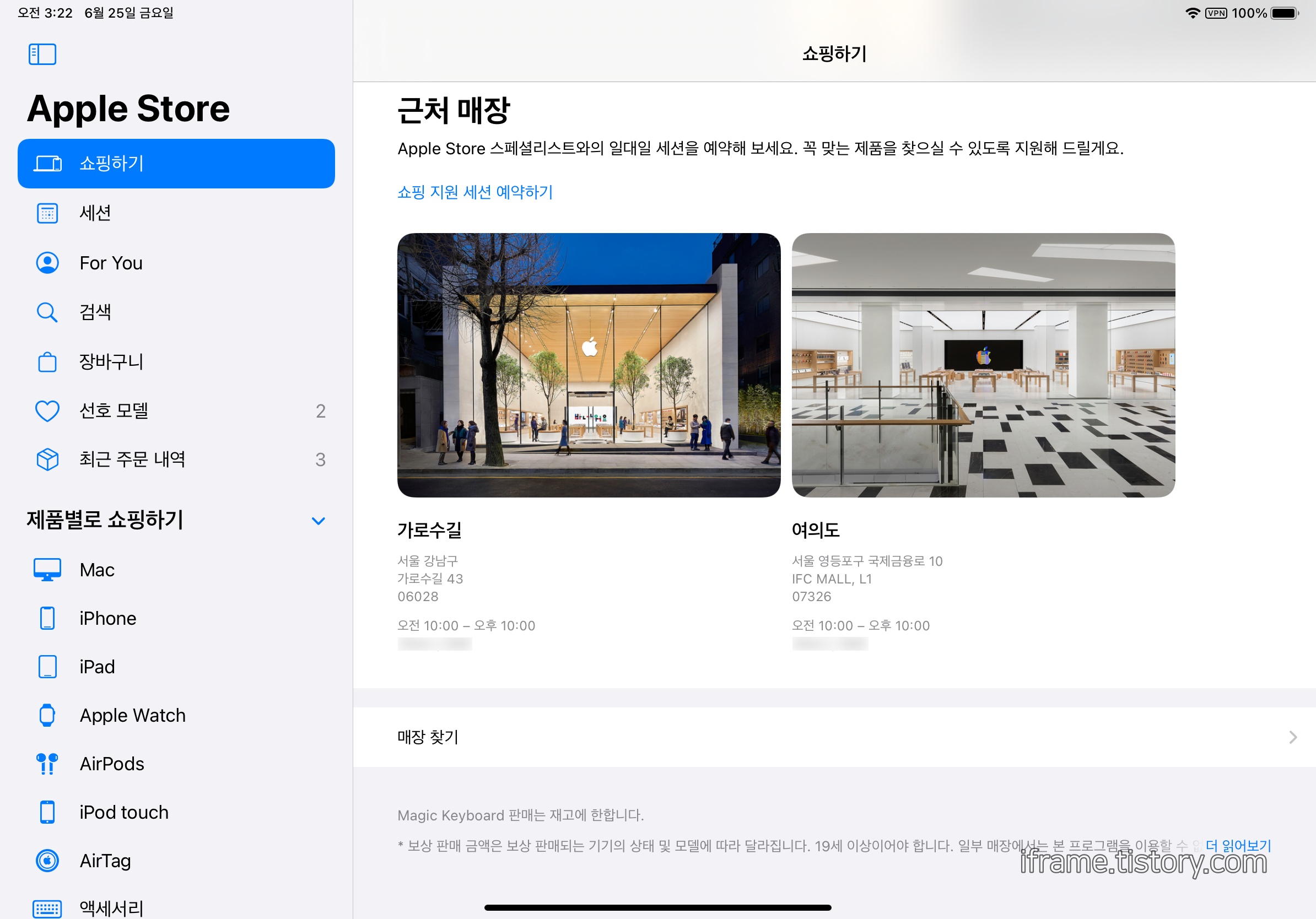 Apple 사용자의 지갑이 가벼워지는데 큰 도움을 주는 Apple Store 앱입니다. 필자가 Apple 기기를 설명할 때 단골같이 등장하는 앱 중 하나지요. 새로운 iMac이나, 새로운 iPhone 출시 이전에 열심히 판매하고 있는 iPhone 12 퍼플 색상이 페이지 상단에 위치해있으며, 영어를 할 줄 몰라도 다양한 교육을 받을 수 있는 세션을 예약할 수 있습니다. iPhone용 앱과의 차이점이라면 메뉴가 측면에 있다는 점이 되겠습니다.