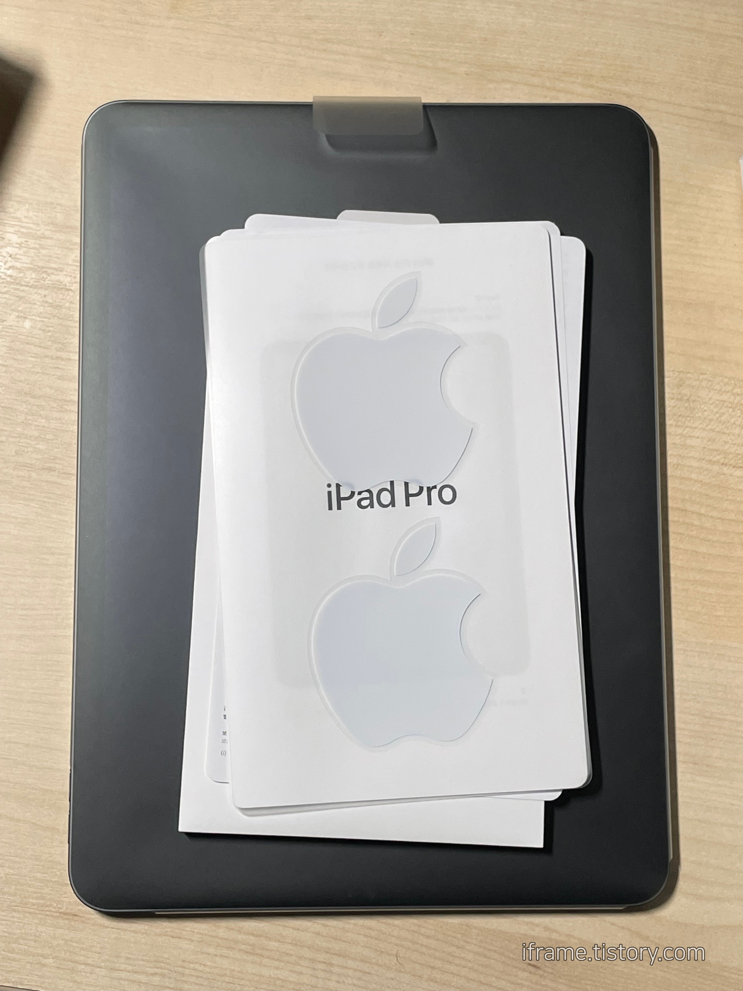 인터넷에서 판매하는 북커버를 끼워보았습니다. 기기의 후면에 내장된 자석이 케이스에 내장되어 있는 자석에 붙어서 고정되는 구조로, Apple에서도 판매하는 Smart Folio 제품과 유사합니다. 측면 보호가 아쉽긴 하지만 장착이 편리해서 쓰고 있습니다...^^ 기기가 휠 수도 있기 때문에 케이스는 선택이 아니라 거의 필수 같습니다. AppleCare+을 가입해야 케이스 없이도 사용할 텐데 그렇지 않다면 조심하셔야 됩니다.