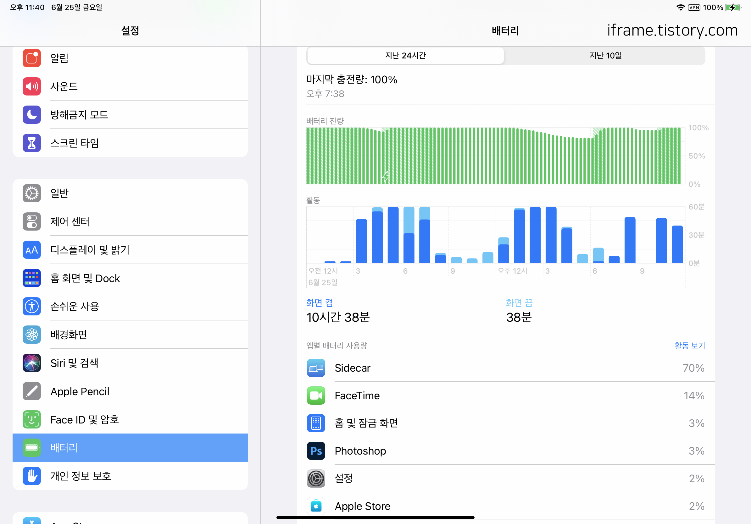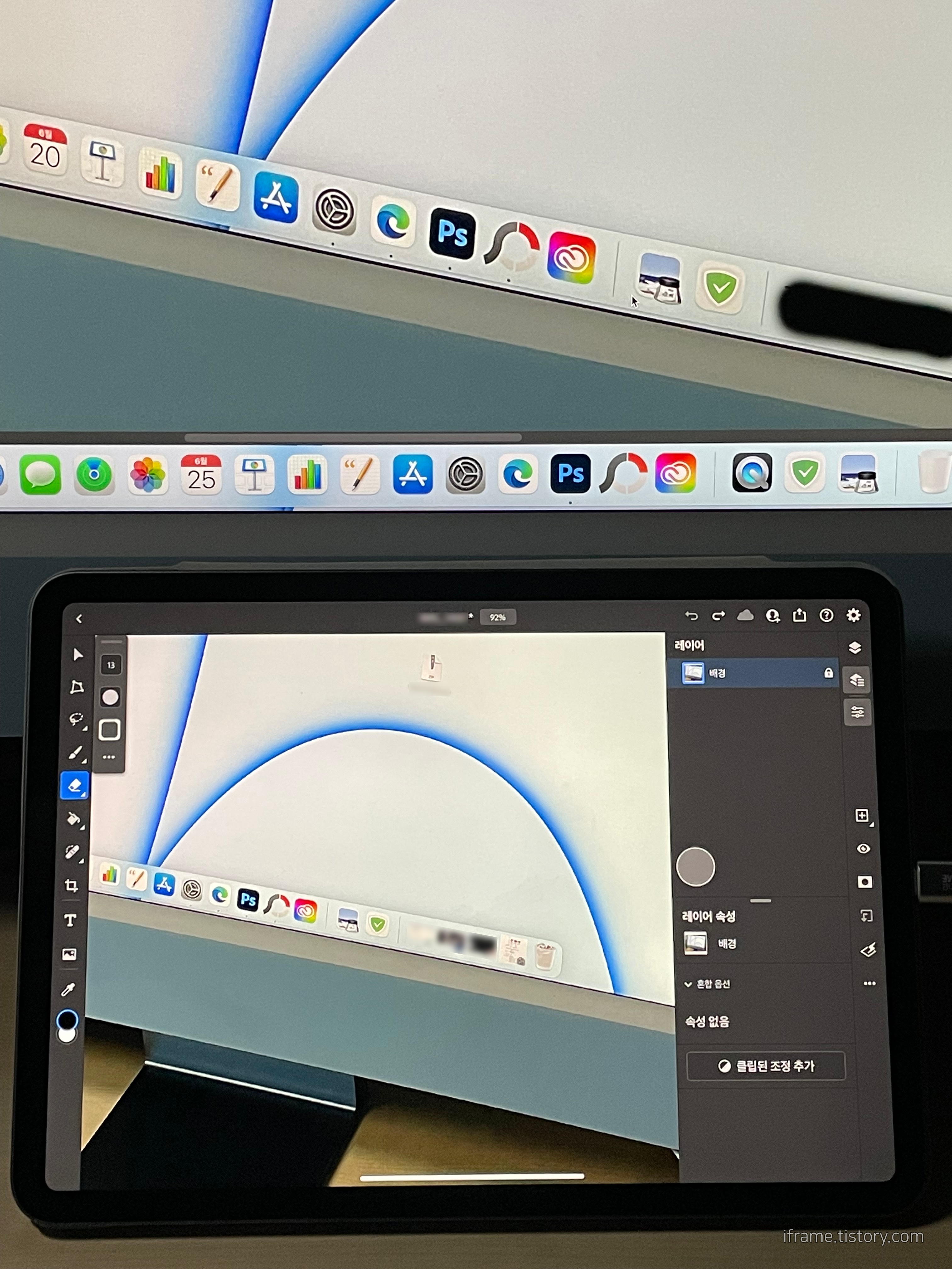 뭔가 필수 아이템이 된 거 같은 Apple Pencil과 같이 연계하여 사용하면 편리합니다. 그럴 수밖에 없는 게 터치 바 영역(Sidecar 화면 하단)만 터치가 되고 나머지 영역은 터치가 되지 않습니다. 버튼을 터치하더라도 별 반응은 없고, 의외로 제스처(스크롤 등)는 사용할 수 있긴 한데 제한적입니다. 그러다 보니 펜슬을 사용해야 어느 정도 사용이 가능할 것 같지만 필자는 그런 용도보단 보조 디스플레이를 대체하는 개념으로 사용하고 있습니다.
