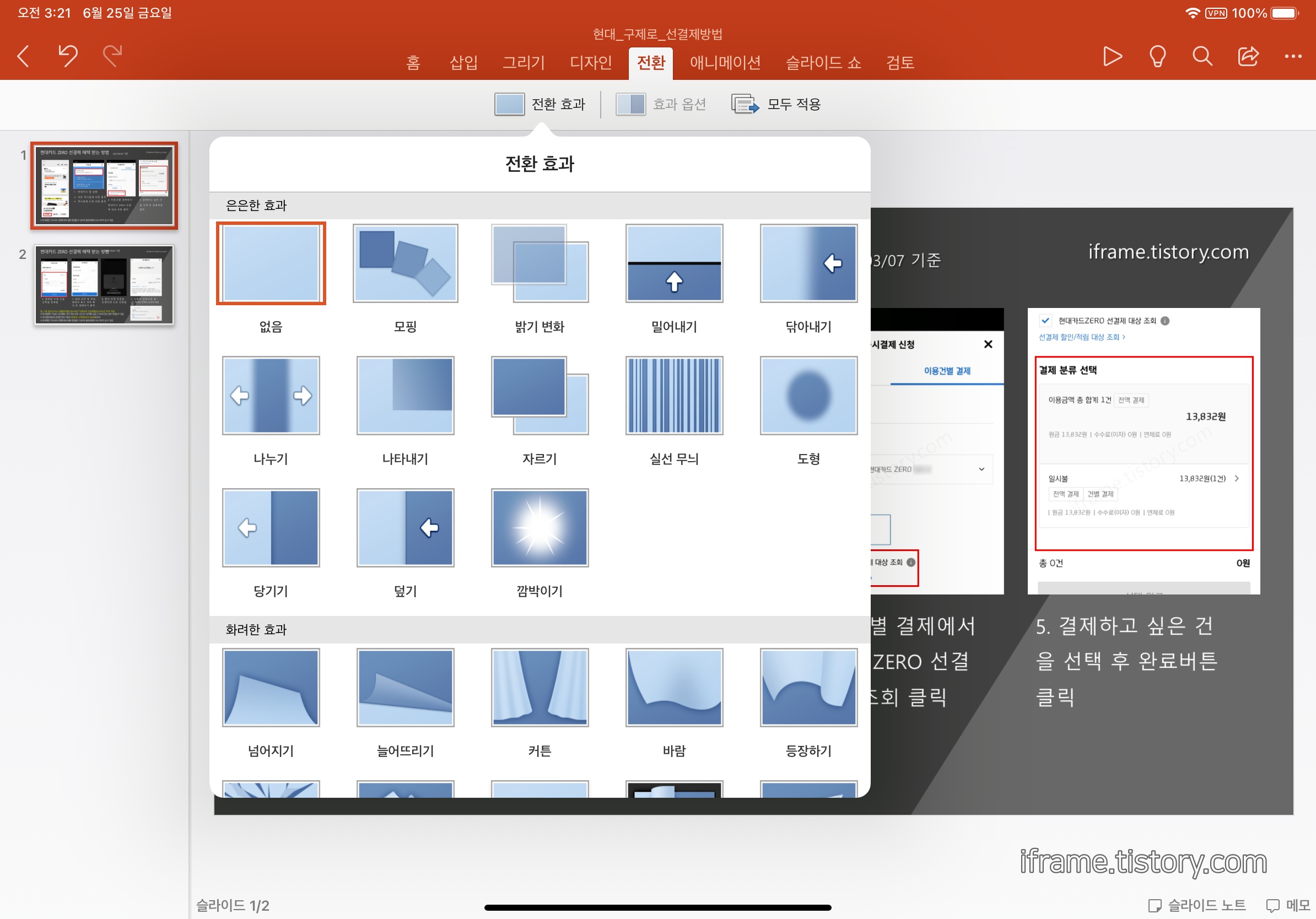 PowerPoint을 사용하시다 보면 다양한 전환 효과를 사용하시는 분도 꽤 계실 건데 모핑을 포함한 다양한 효과를 사용할 수 있습니다. 전환 효과를 넣기 위해 컴퓨터나 노트북을 찾을 필요 없이 앱에서도 추가가 가능하며, OneDrive와 연계하면 실시간으로 편집된 파일이 업로드도 가능하니 같이 활용해보는 것도 나쁘진 않겠죠?