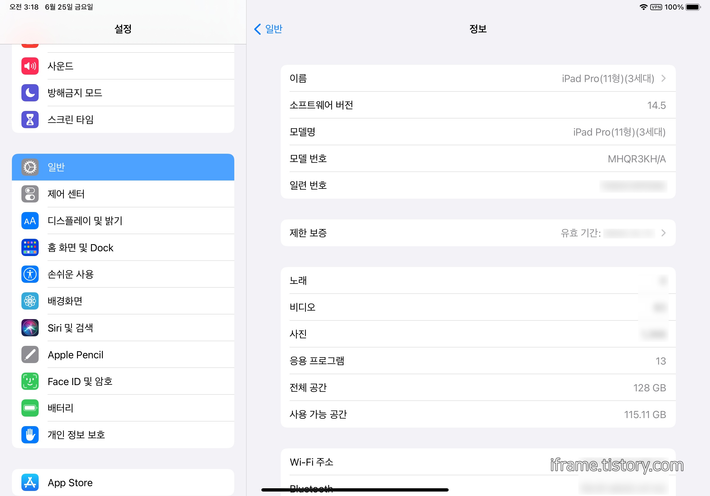 기기에 탑재된 iPadOS 버전은 14.5로, 글을 작성하는 시점(06/25)에선 14.6으로 업데이트가 가능합니다. 캡처할 때는 몰랐는데 글을 작성할 때 보니까 업데이트가 되어있지 안길래 업데이트를 진행했습니다.