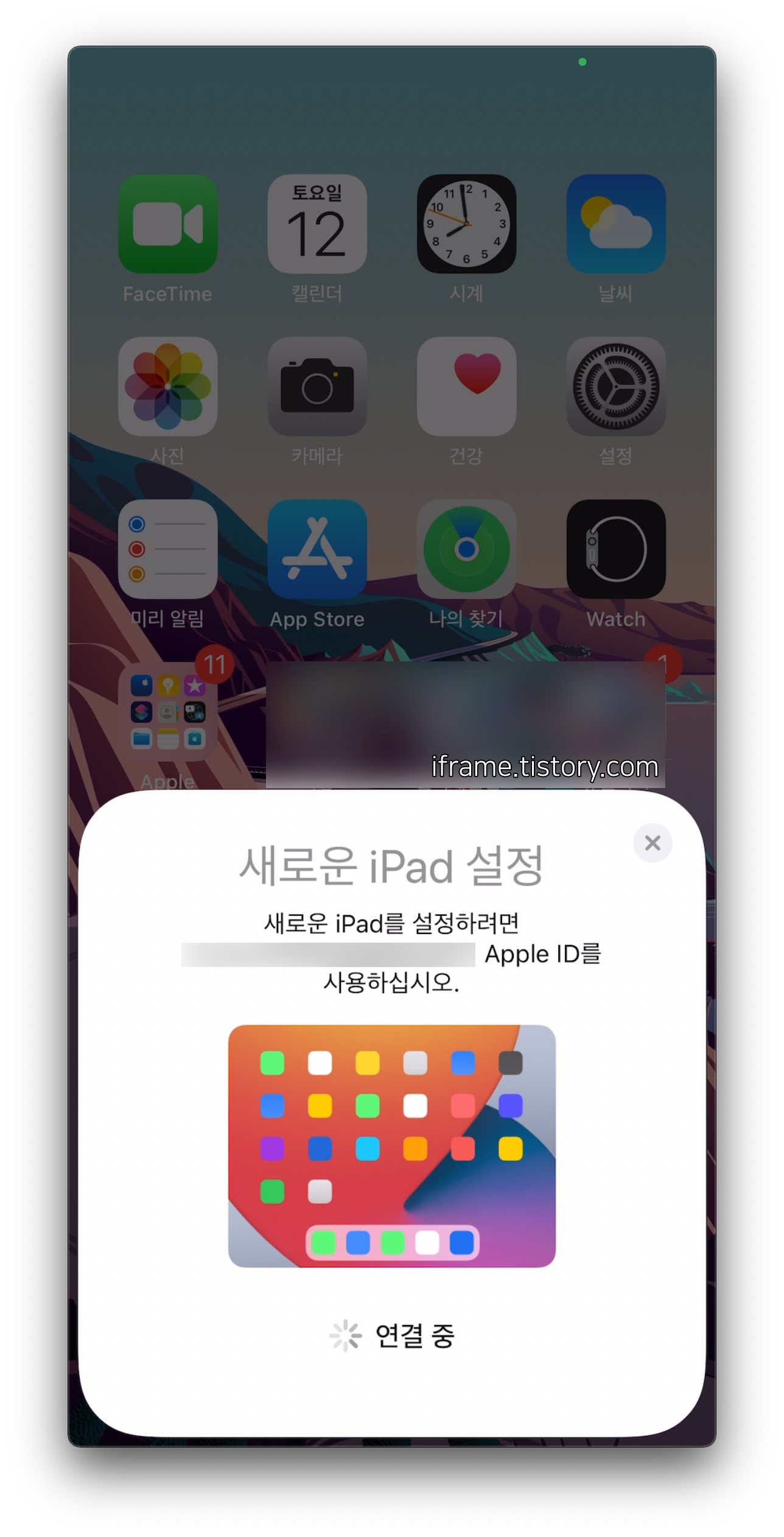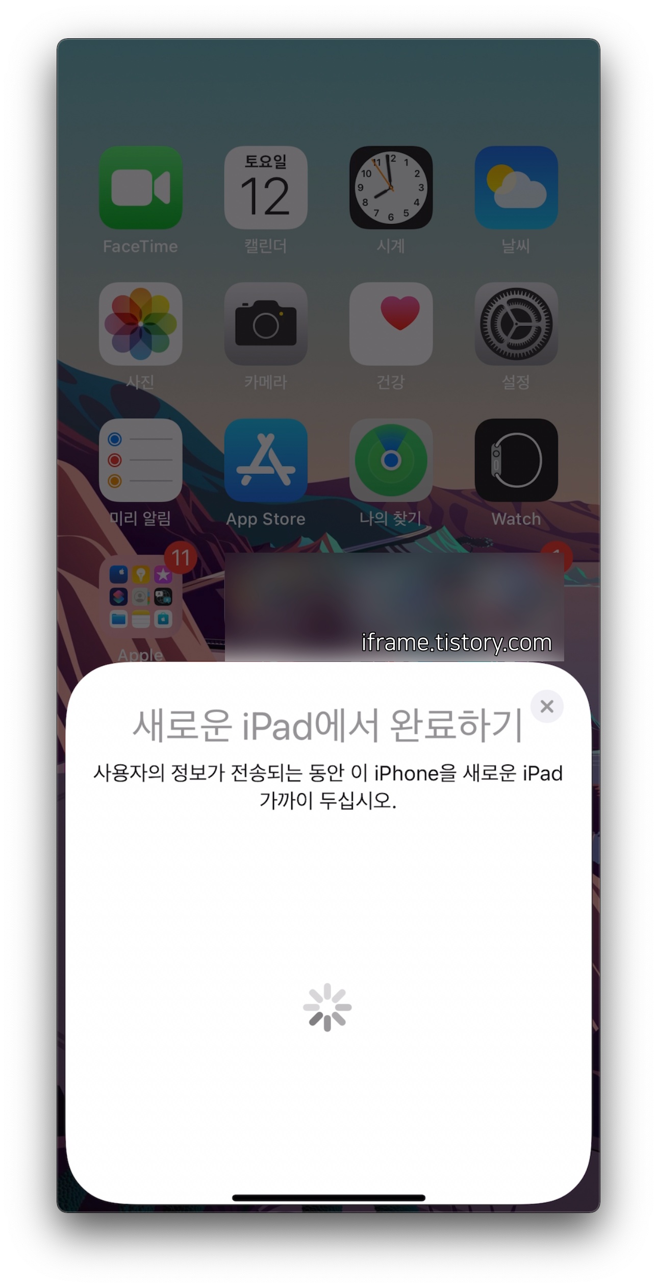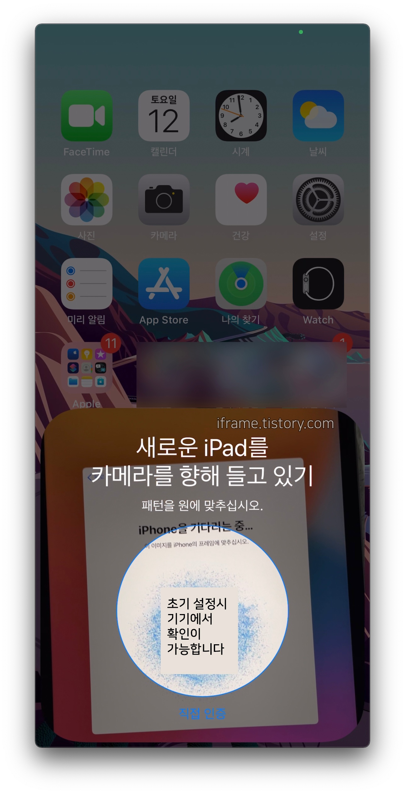 - 그런 다음, 사진과 같이 '새로운 iPad 설정'이란 팝업이 뜨면 버튼을 눌러준 후, iPad에 뜬 화면을 iPhone으로 스캔합니다.