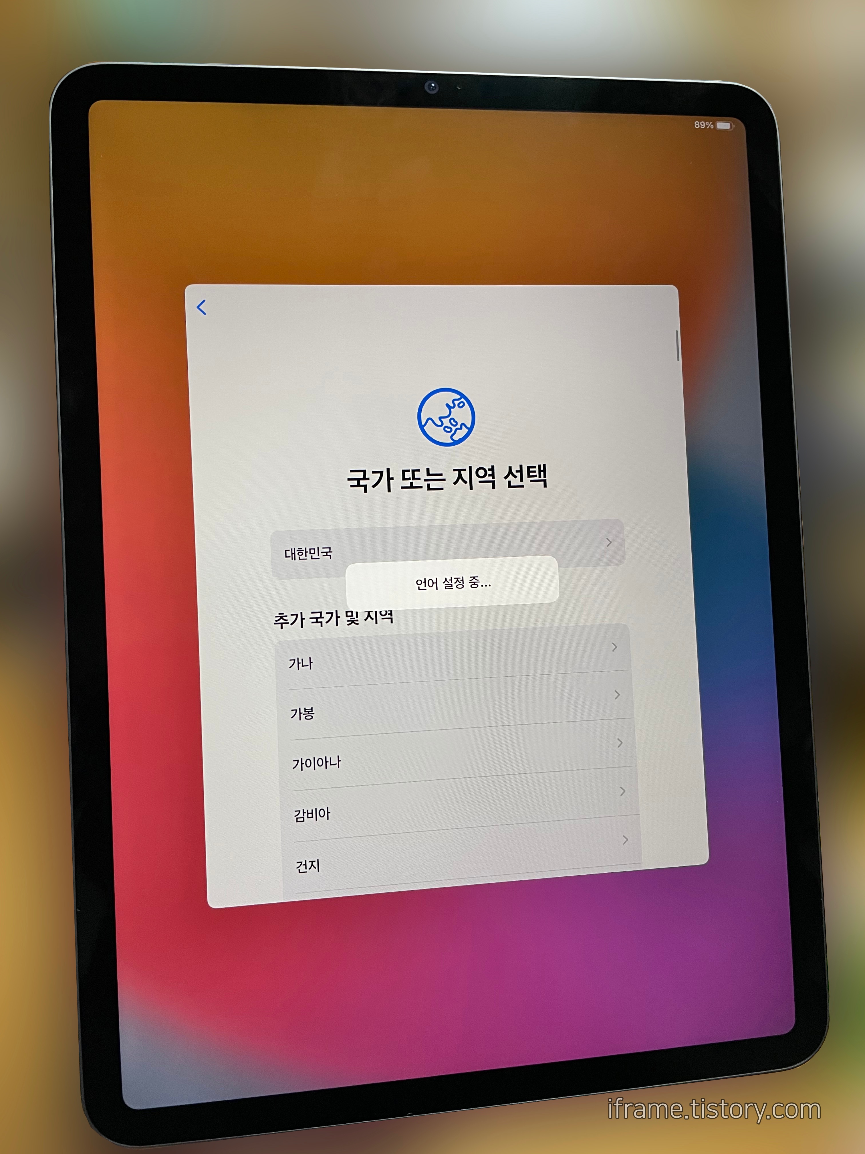 제품은 잠시 후에 둘러보고, 먼저 전원을 켜봤습니다. 2달 전까지 사용했던 11인치 2세대와 거의 차이가 없다 보니 새로 출시한 신상인데도 신상 같지 않은 뭔가 오묘한 느낌이 듭니다. 어찌 됐건 언어 및 국가를 먼저 설정합니다.