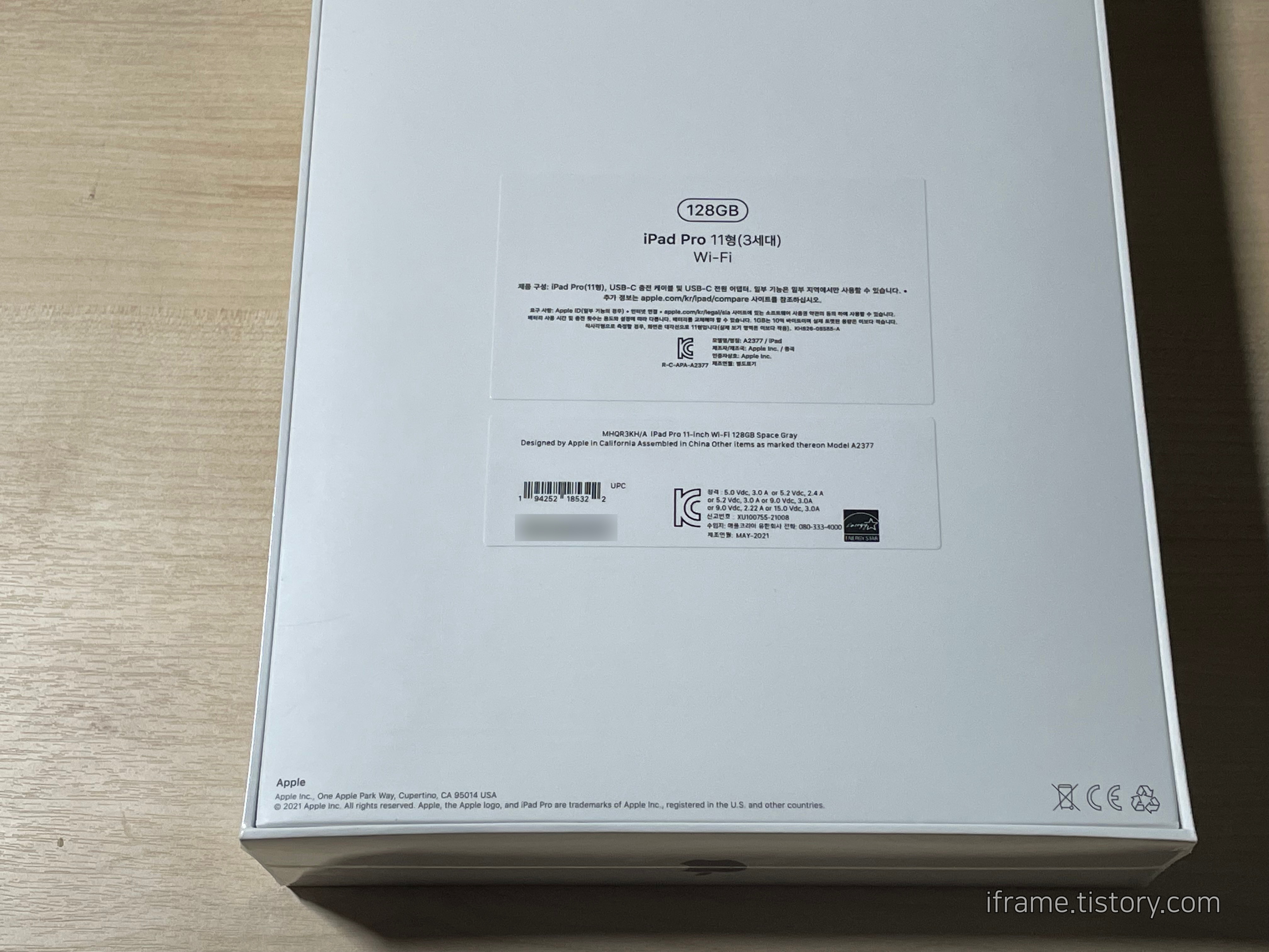 Apple의 제품엔 주요 설명은 박스 뒷면에 적혀있고, 쉽게 뜯을 수 있는 비닐 포장이 적용되어 있습니다. 흔히 깡통 옵션이라 부르는 가장 기본 옵션이라 할 수 있는 iPad로, 128GB+Wi-Fi가 적용된 스페이스 그레이 색상의 iPad Pro입니다.