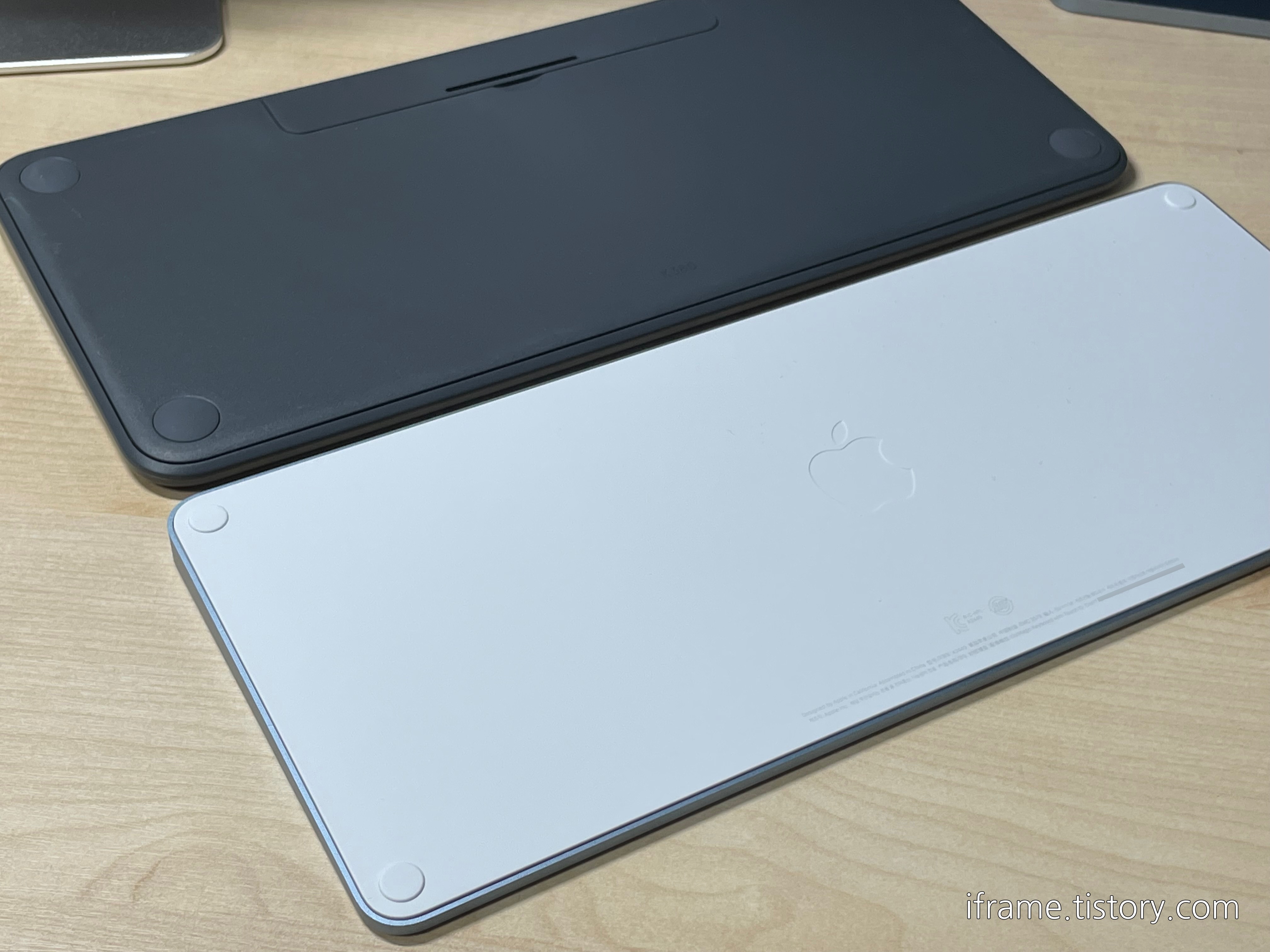 키보드의 크기의 경우 비슷하지만 무게는 K380이 꽤 무겁고, 매직 키보드의 경우 가볍긴 한데 매직 키보드는 보통 아이맥과 같이 쓰지 휴대하지는 않기에 크게 신경 쓰이진 않습니다. 만약 맥북이라던지 아이패드에서 쓴다면 얘기는 달라지겠네요.
