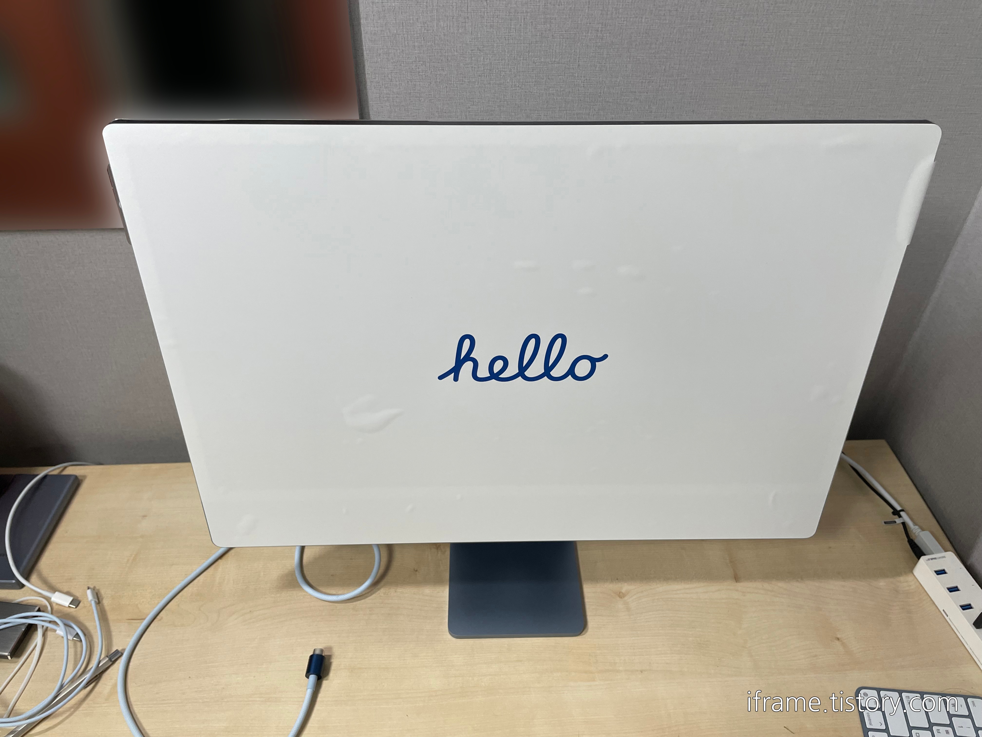 iMac 24형의 경우 이중으로 포장이 되어있으며, 부직포 느낌의 봉투를 제거하면 hello라고 쓰여있는 스티커가 모니터에 붙어있는데 그걸 떼어내야 제품을 볼 수 있습니다.