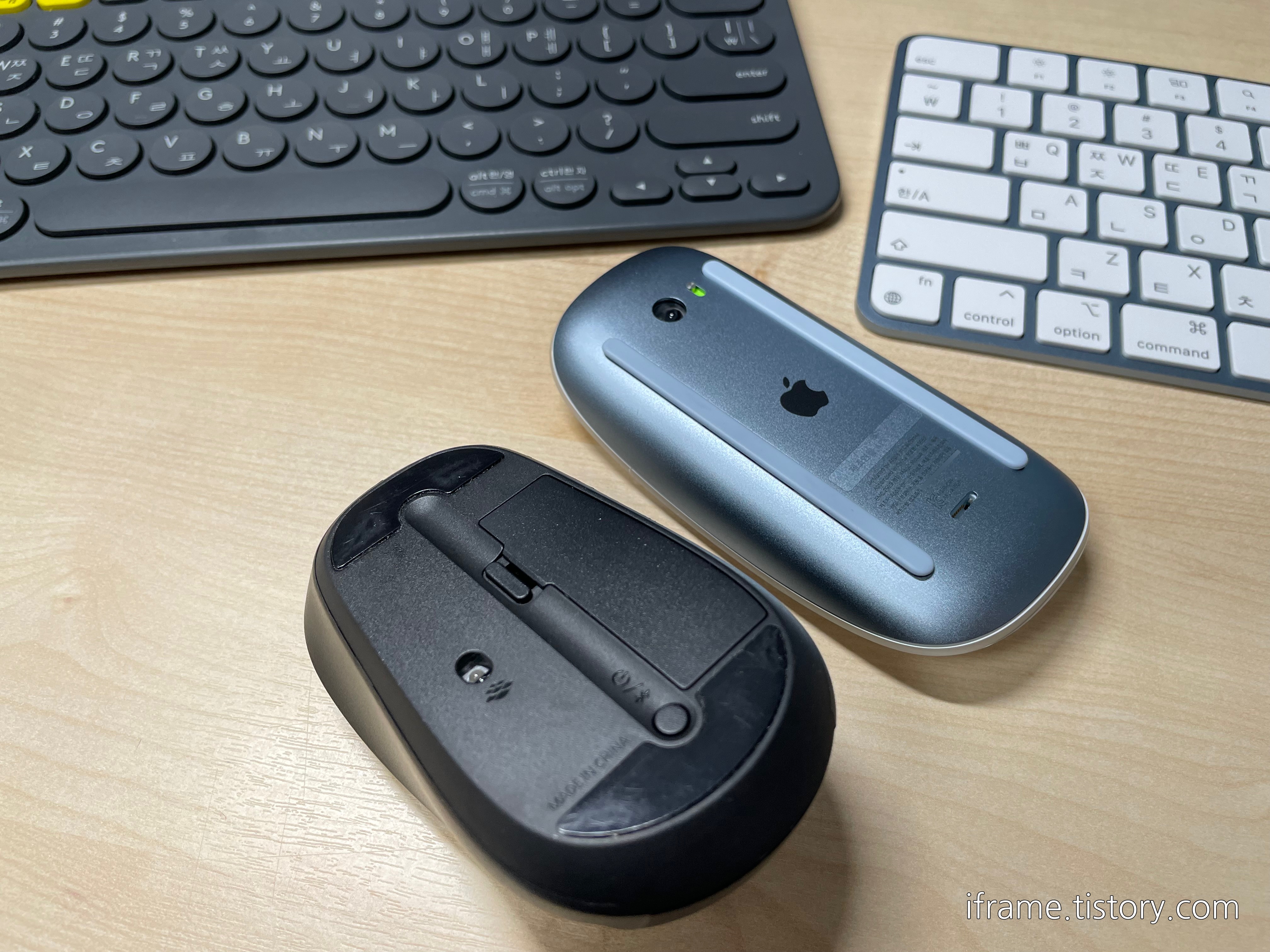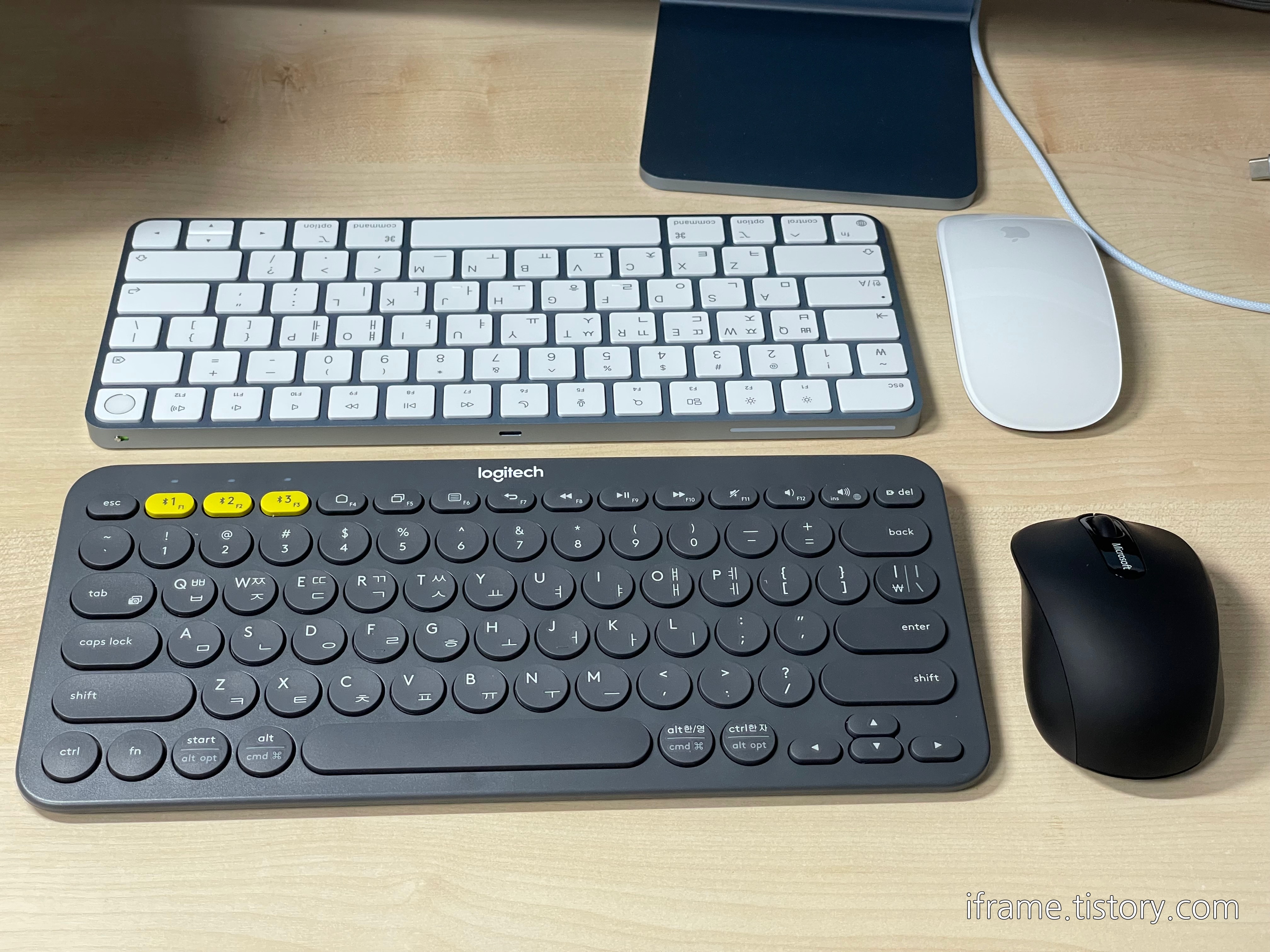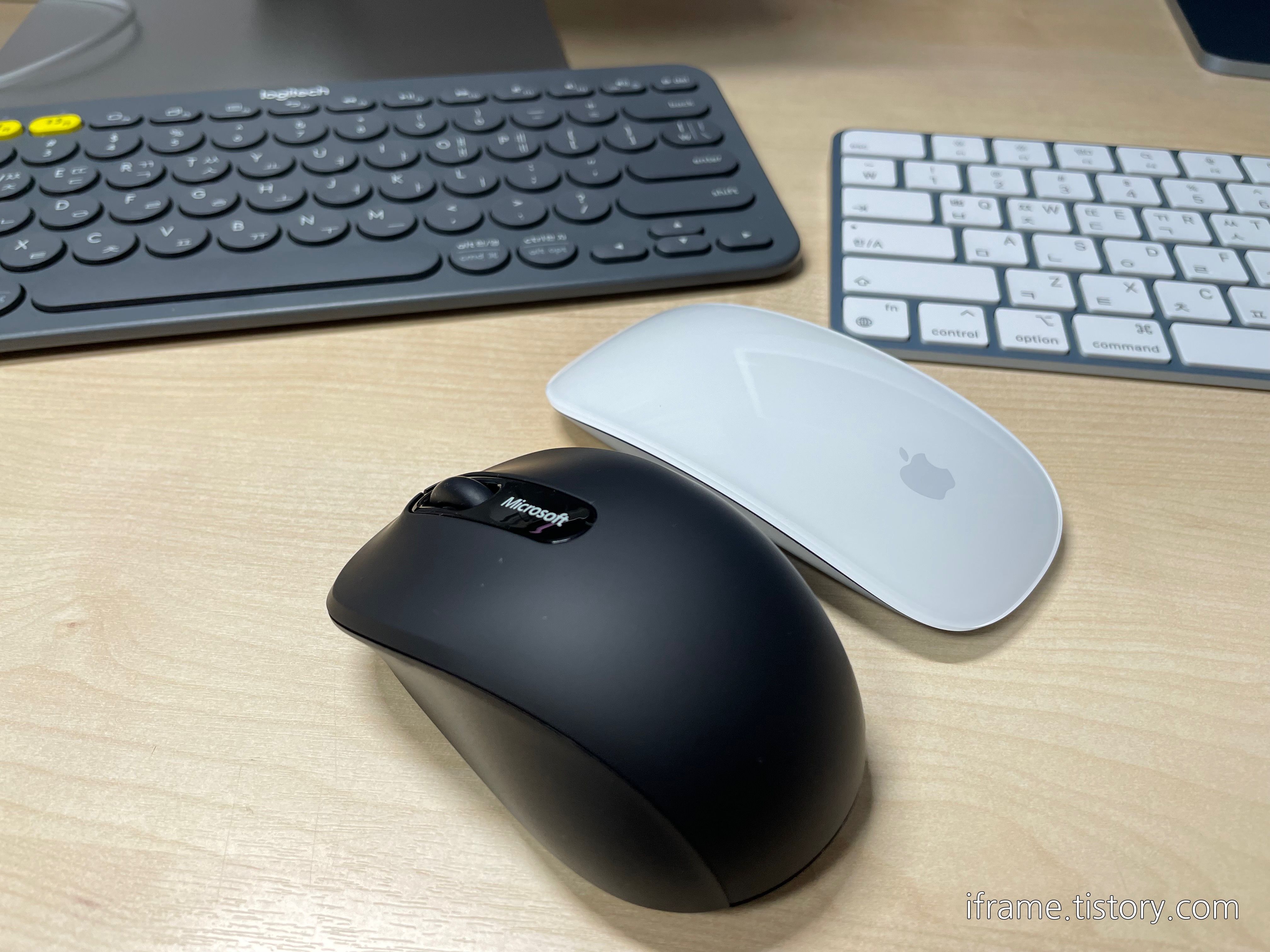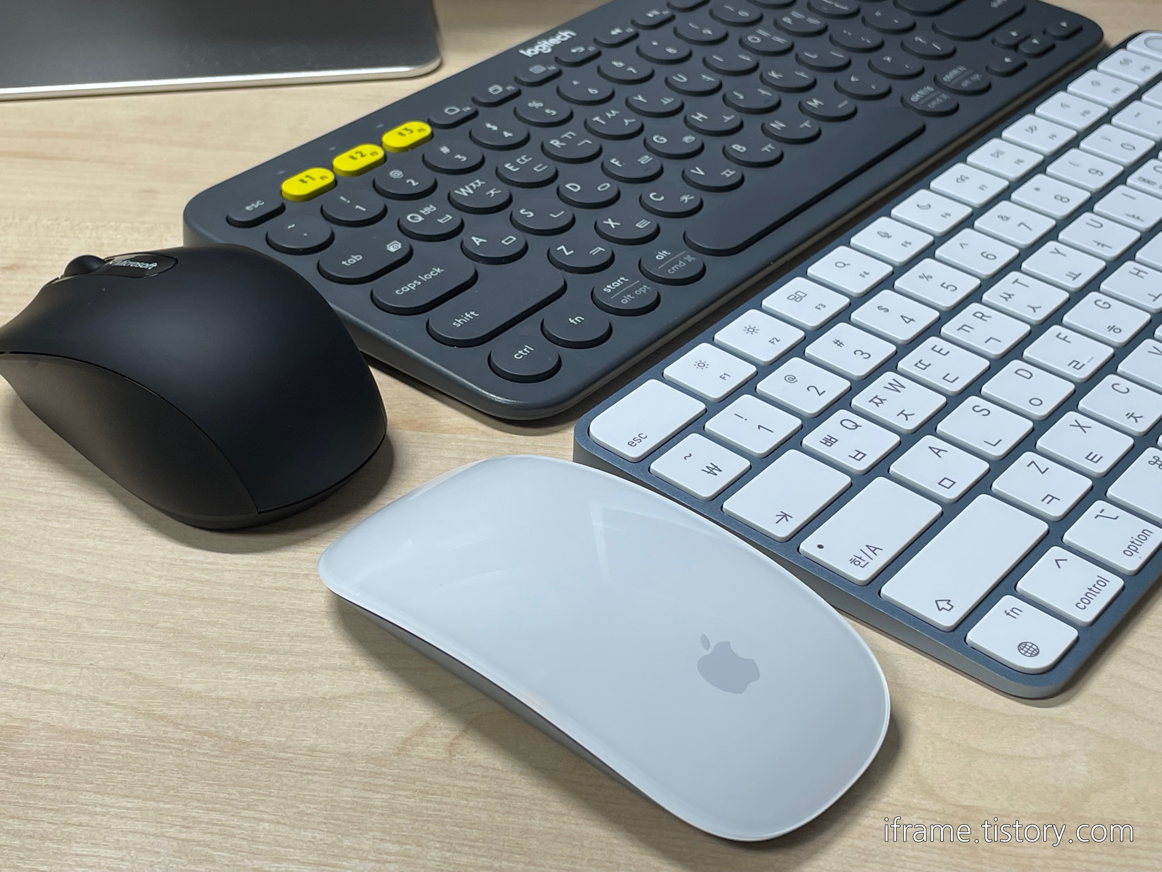 Magic Mouse 2+Magic Keyboard와 Logitech K380+Microsoft Bluetooth Mobile Mouse 3600을 나란히 두고 비교해봤습니다. 왜 로지텍과 MS의 키보드/마우스와 비교하나 싶겠지만 필자가 이미 사서 쓰고 있는 제품이 저거만 있어서 그렇습니다.