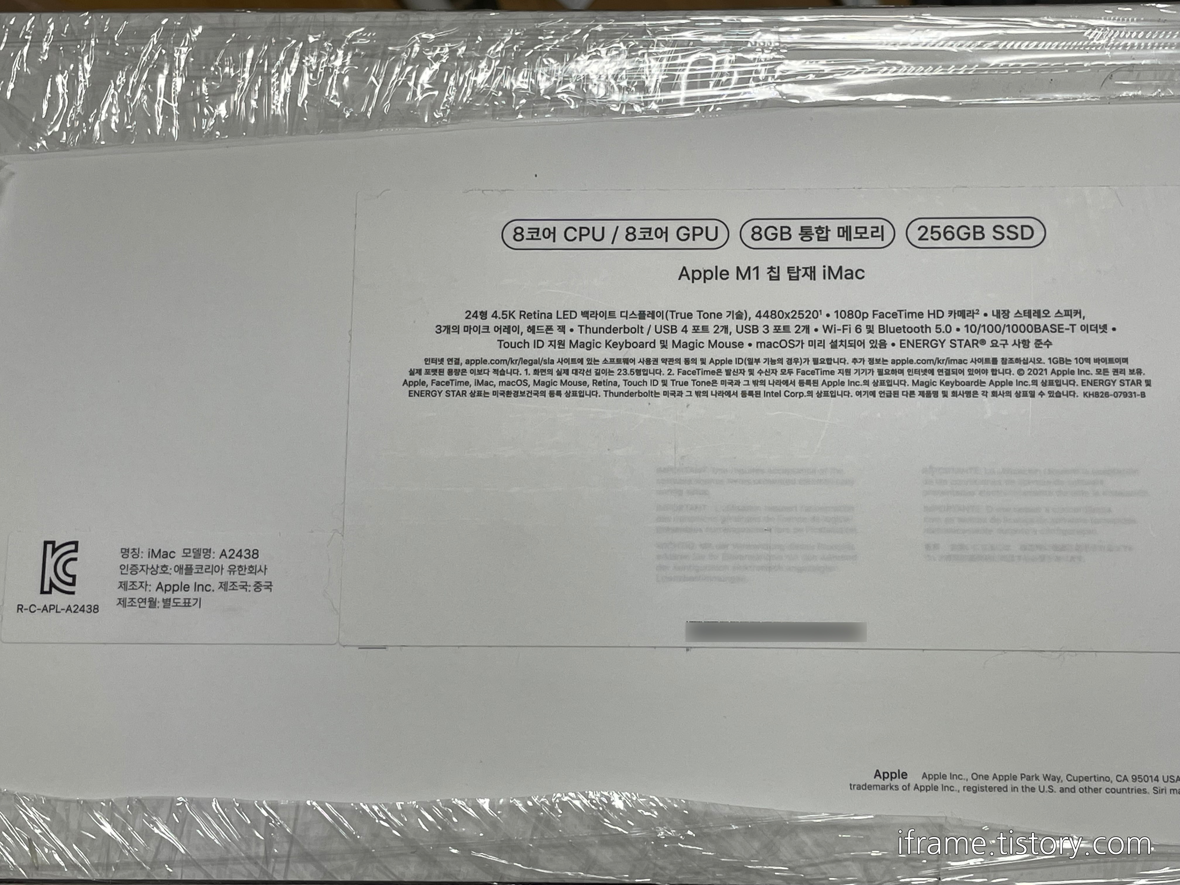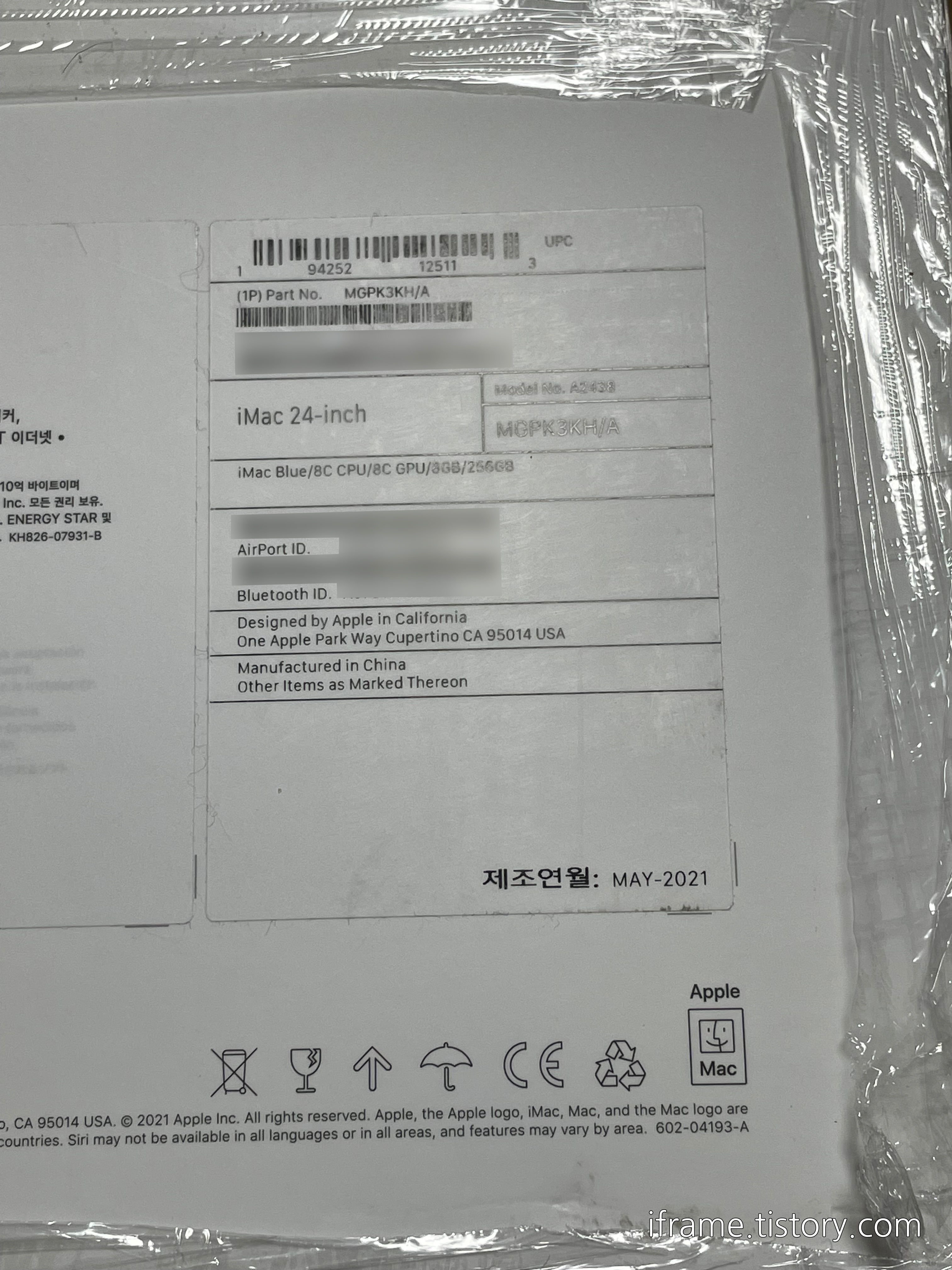 박스 하단에는 선택한 옵션 정보(8 코어 CPU 및 GPU, 8GB RAM 등...)와 각종 안내가 적혀있습니다. 제조연월은 21년도 5월로 제품 수령일 기준 1달밖에 안된 신제품을 받았습니다. iMac 외에도 iPad Pro나 Macbook Air도 비슷한 시기에 주문했었는데 같은 5월에 제조했더라고요.