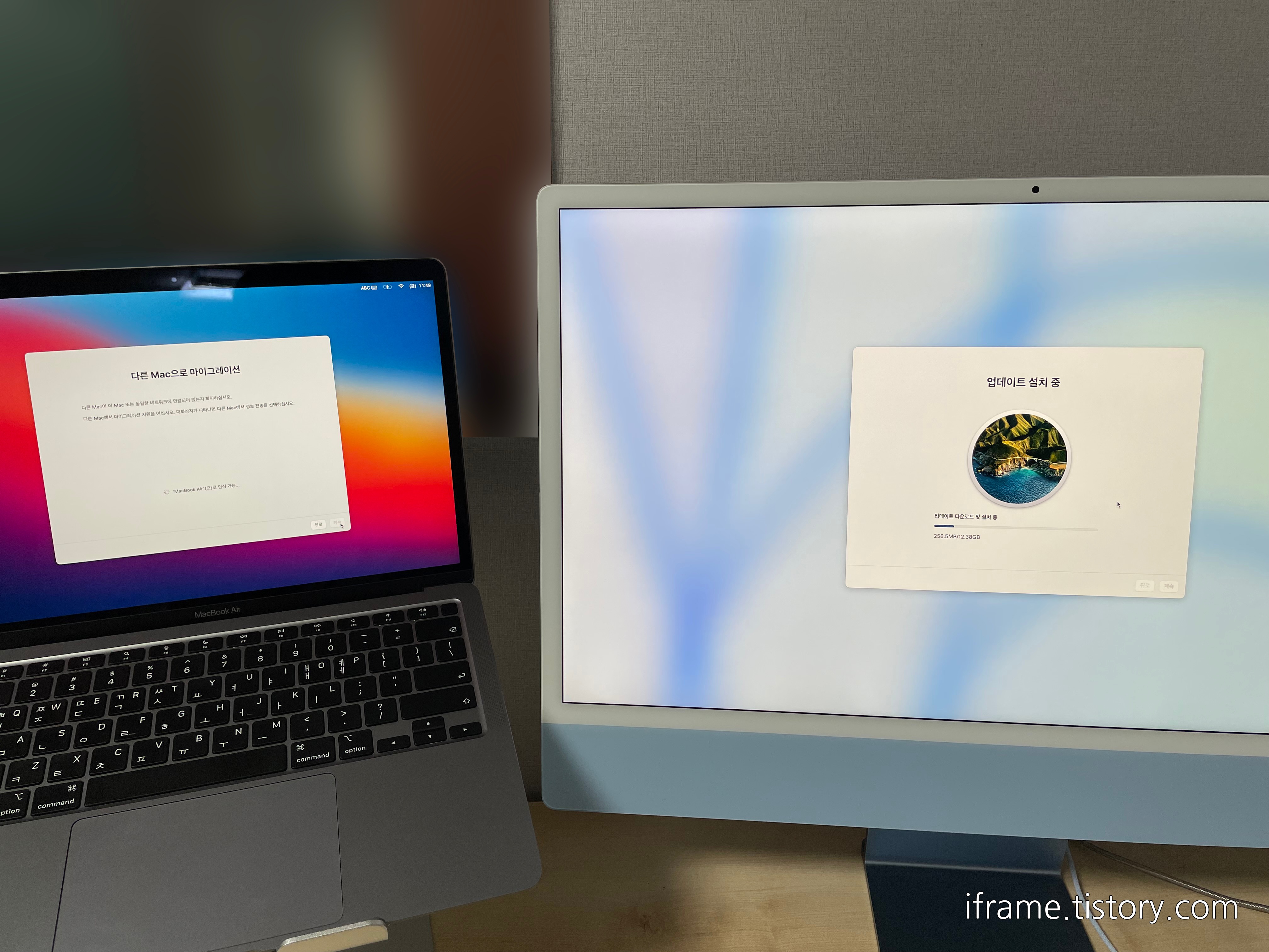 근데 MacBook Air의 소프트웨어 버전과 iMac의 버전이 다르다 보니 업데이트를 진행 후 마이그레이션을 마무리했습니다. 시간은 꽤 걸렸습니다..;; 이럴 줄 알았으면 Time Machine(백업/복구 프로그램)을 사용했을 텐데 말이죠.