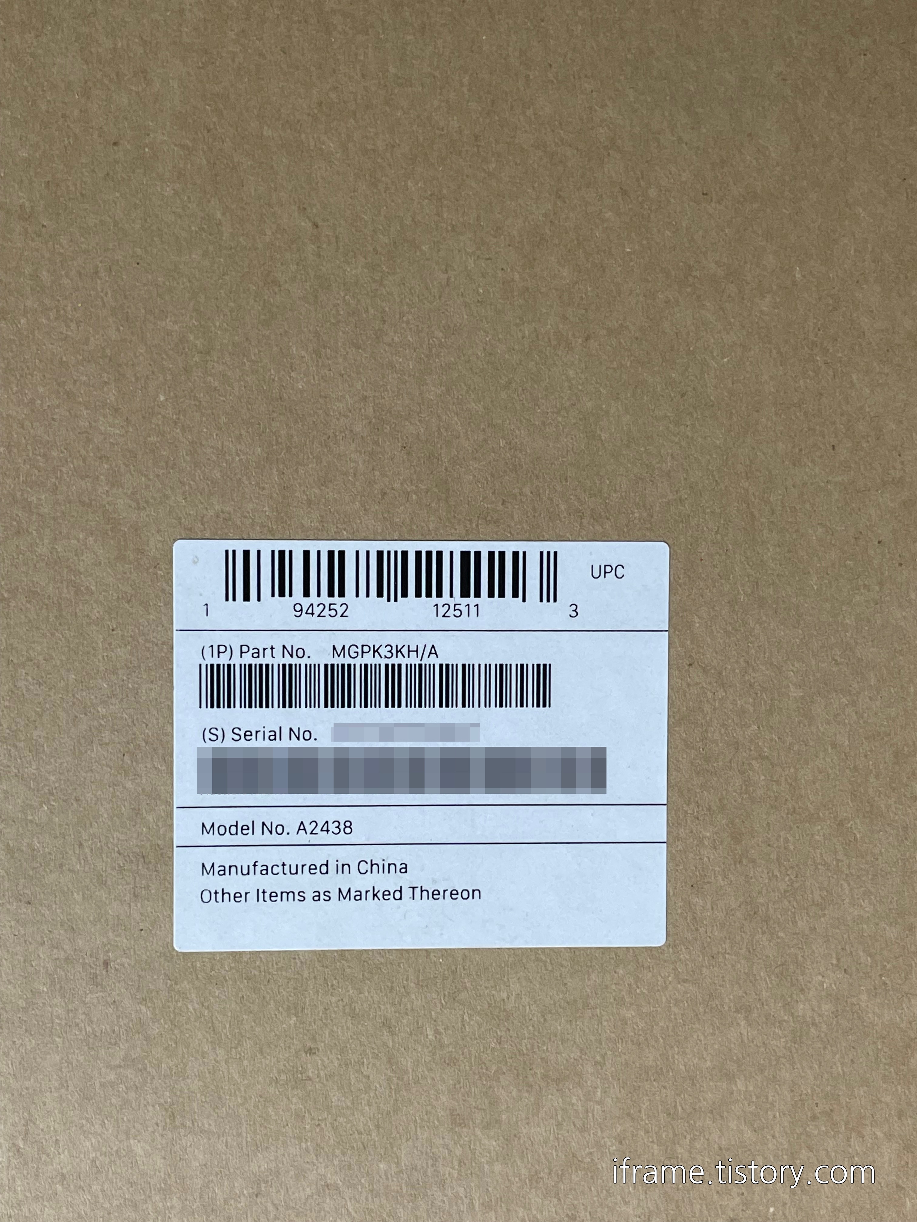 배터리가 탑재되어 있는 제품이다 보니(Magic Keyboard 및 Magic Mouse. 옵션에 따라 Magic Trackpad) 관련된 라벨이 부착되어 있고, MGPK3 KH/A라는 모델 코드를 가지고 있으며, 해당 코드를 검색하면 CPU 8C/GPU 8C+블루 색상 모델이 뜨더라고요. (KH/A는 지역 코드)