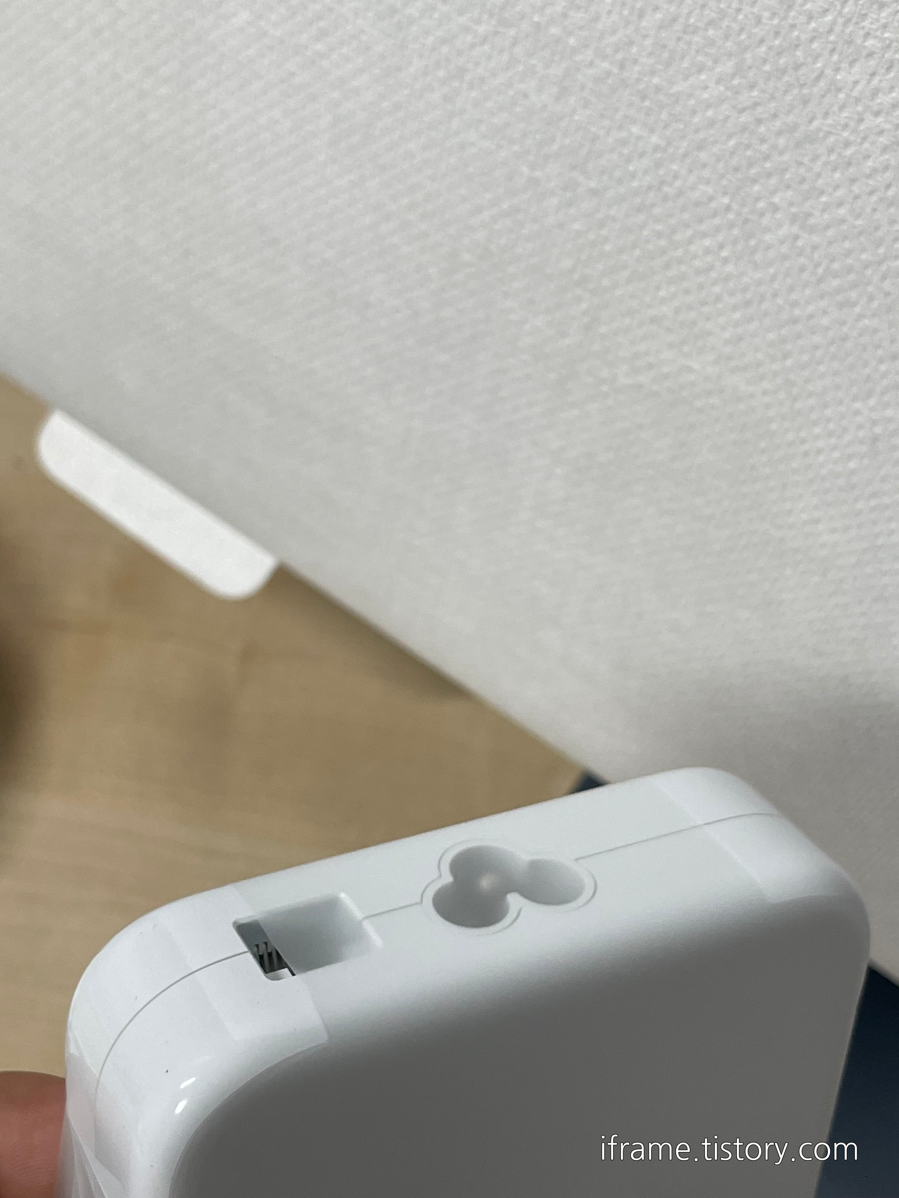 후면에는 이더넷(옵션)+전원 공급을 같이 할 수 있는 케이블을 꽂을 수 있게 제작되어 있으며, 자석으로 되어있다 보니 케이블을 살짝 가까이하면 끼워지는... 수준까지는 아니어도 케이블을 아주 가까이하면 자성에 의해 잘 붙습니다. 착! 소리가 나니까 잘 끼워졌는지 체크할 필요도 없고요.
