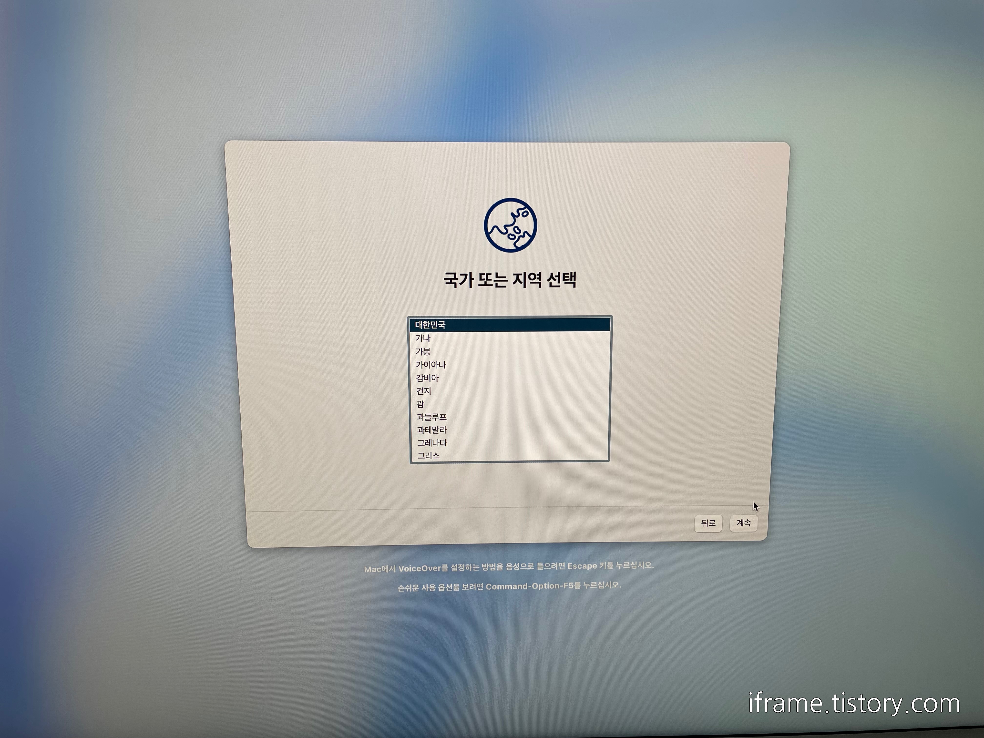 국가 또는 지역을 선택합니다. 스피커가 내장되어 있다 보니 TTS가 화면의 글자를 자동으로 읽어주도록 세팅을 할 수 있습니다. 그 외 사진에는 없지만 Wi-Fi 연결, Apple 로그인, iCloud 설정, 다른 Mac에서 자료 불러오는 기능 등의 여러 과정을 거치면 세팅은 끝납니다.