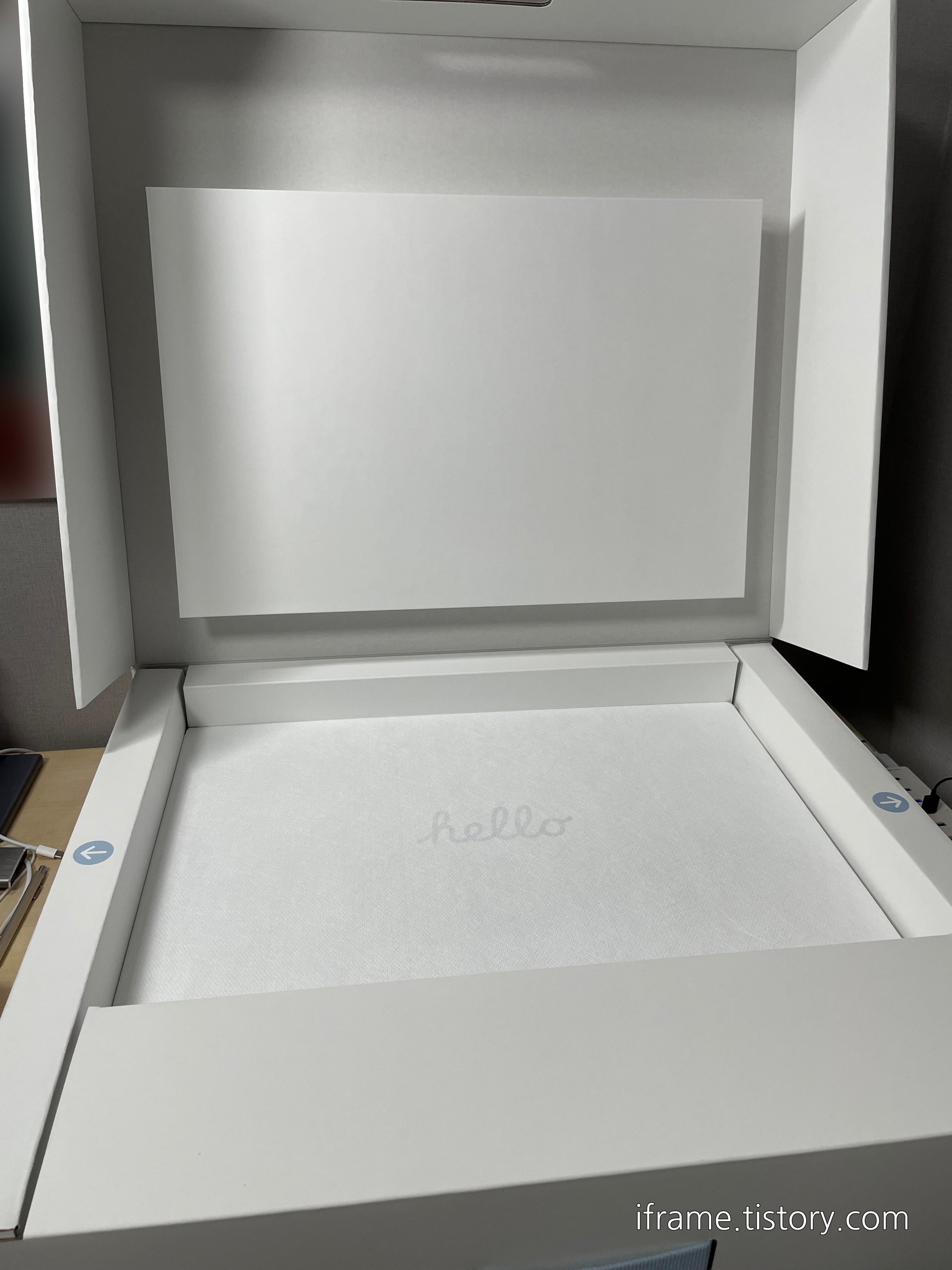 iMac 24형의 경우 이중으로 포장이 되어있으며, 부직포 느낌의 봉투를 제거하면 hello라고 쓰여있는 스티커가 모니터에 붙어있는데 그걸 떼어내야 제품을 볼 수 있습니다.