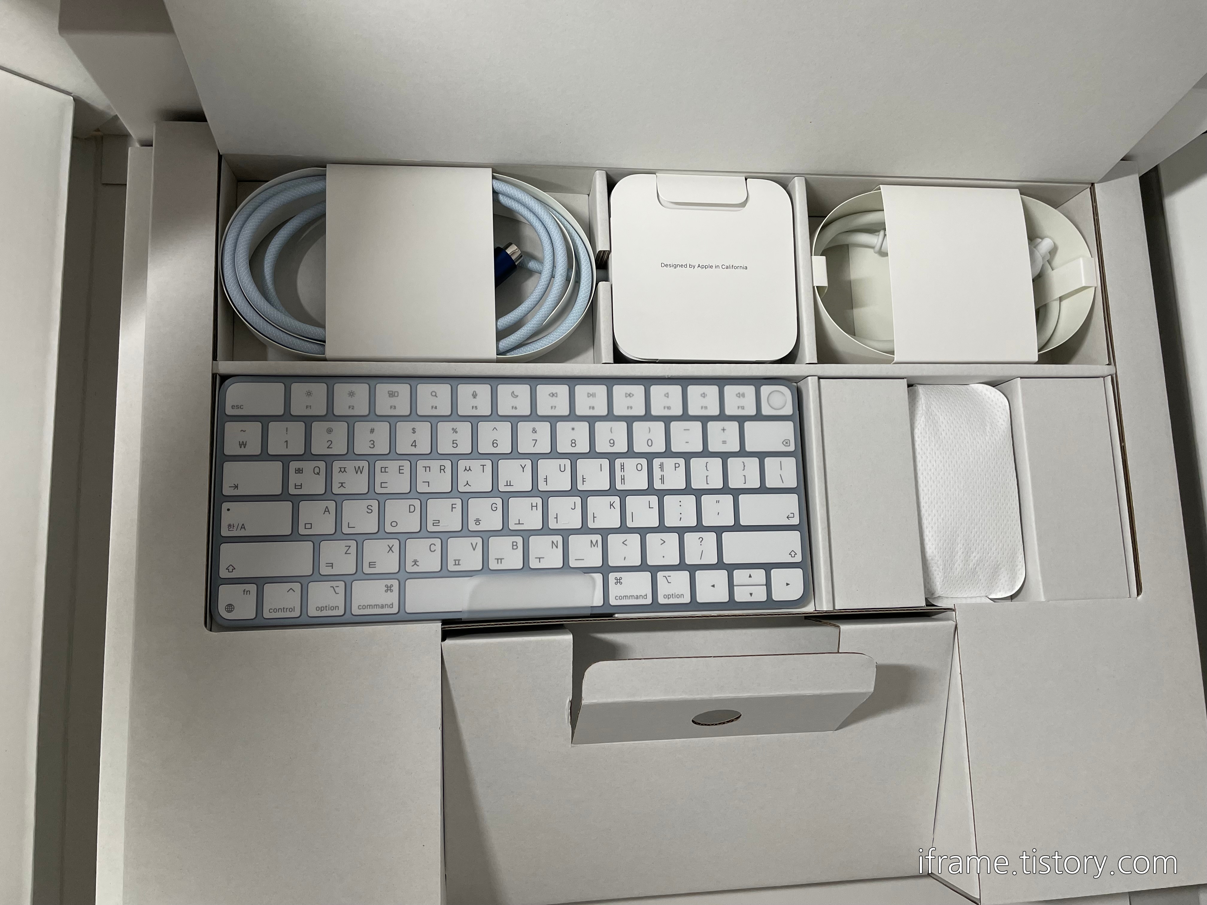 구성은 전원 공급장치 및 전원 케이블, USB-C to Lighiting 케이블, Magic Mouse 2, Magic Keyboard, 사진에는 없지만 스티커 등이 들어있는 작은 case도 하나 있습니다.