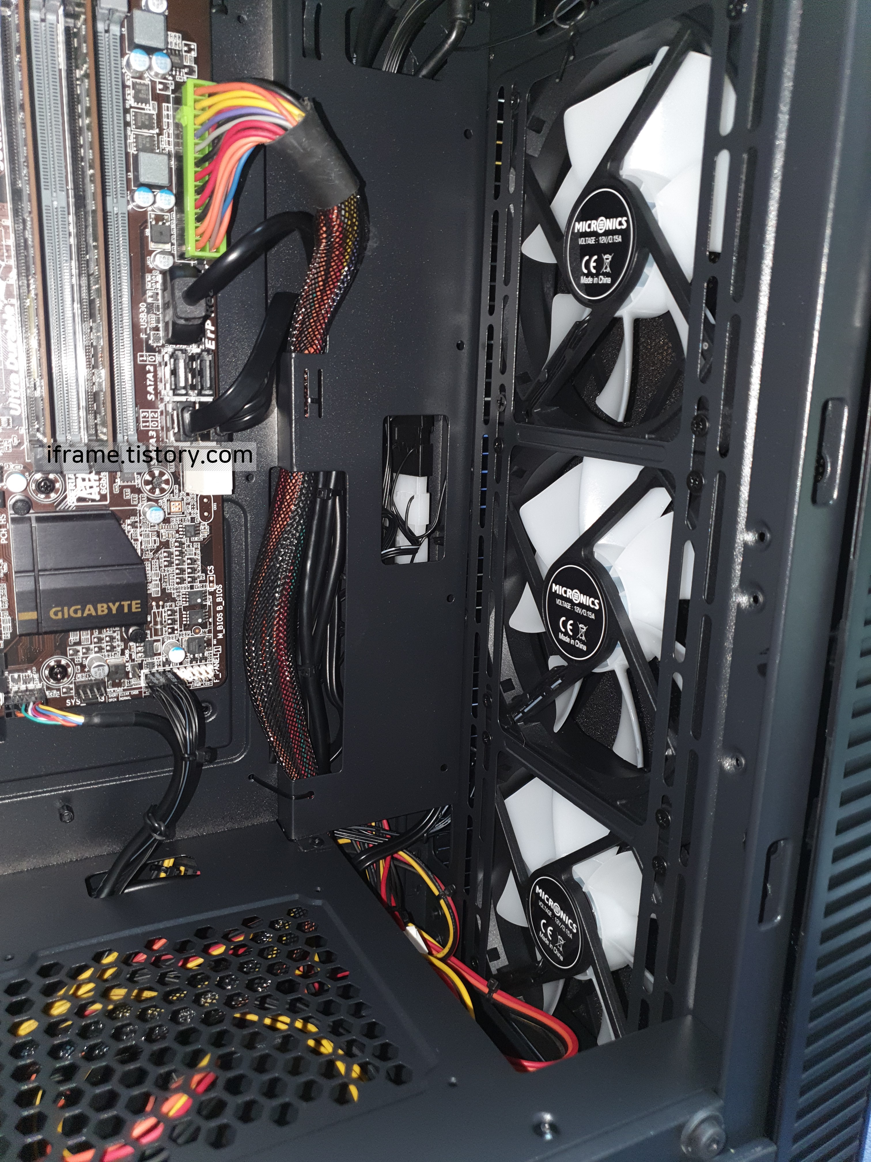 쿨러가 전면 3개, 후면 1개, 상단 2개 총 6개를 배치하여 쿨링이 부족하지 않게 달려있는 게 특징입니다. 그래서 그런지 선이 복잡해서 처음엔 애먹었습니다.