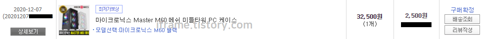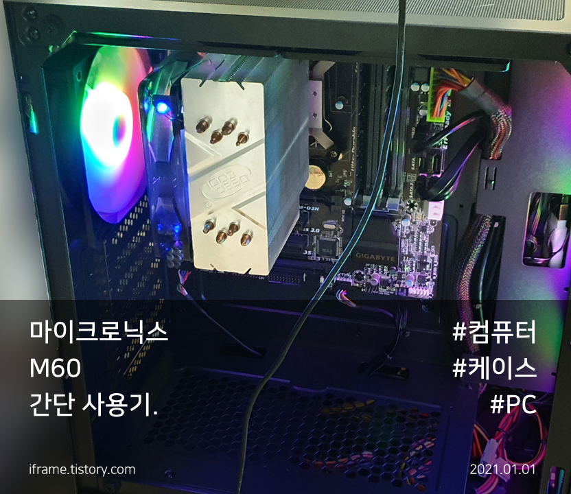 단점- 조립 난이도가 조금 있으며(하드디스크 및 쿨러 전원선 배치), 강화유리를 사용하다 보니 내구성 및 편의성이 아크릴에 비해 떨어지는 점이 느껴집니다. 또한 강화유리는 깨질 경우 파편이 튀기 때문에 위험한 점이 있다 보니 웬만하면 아크릴을 선호하는데 M60은 구매일 기준 아크릴 옵션은 없어서 어쩔 수 없이 강화유리로 주문했습니다.