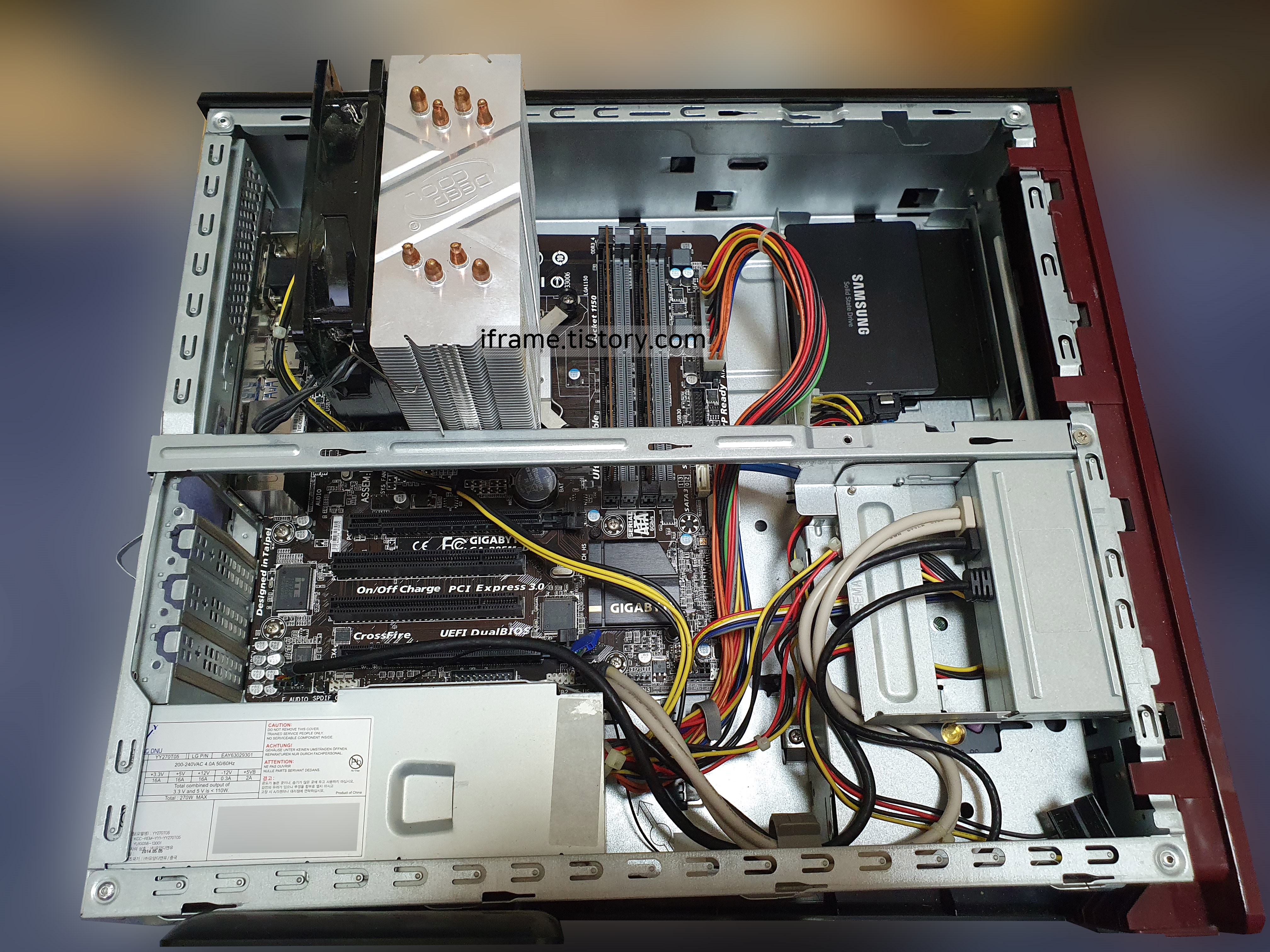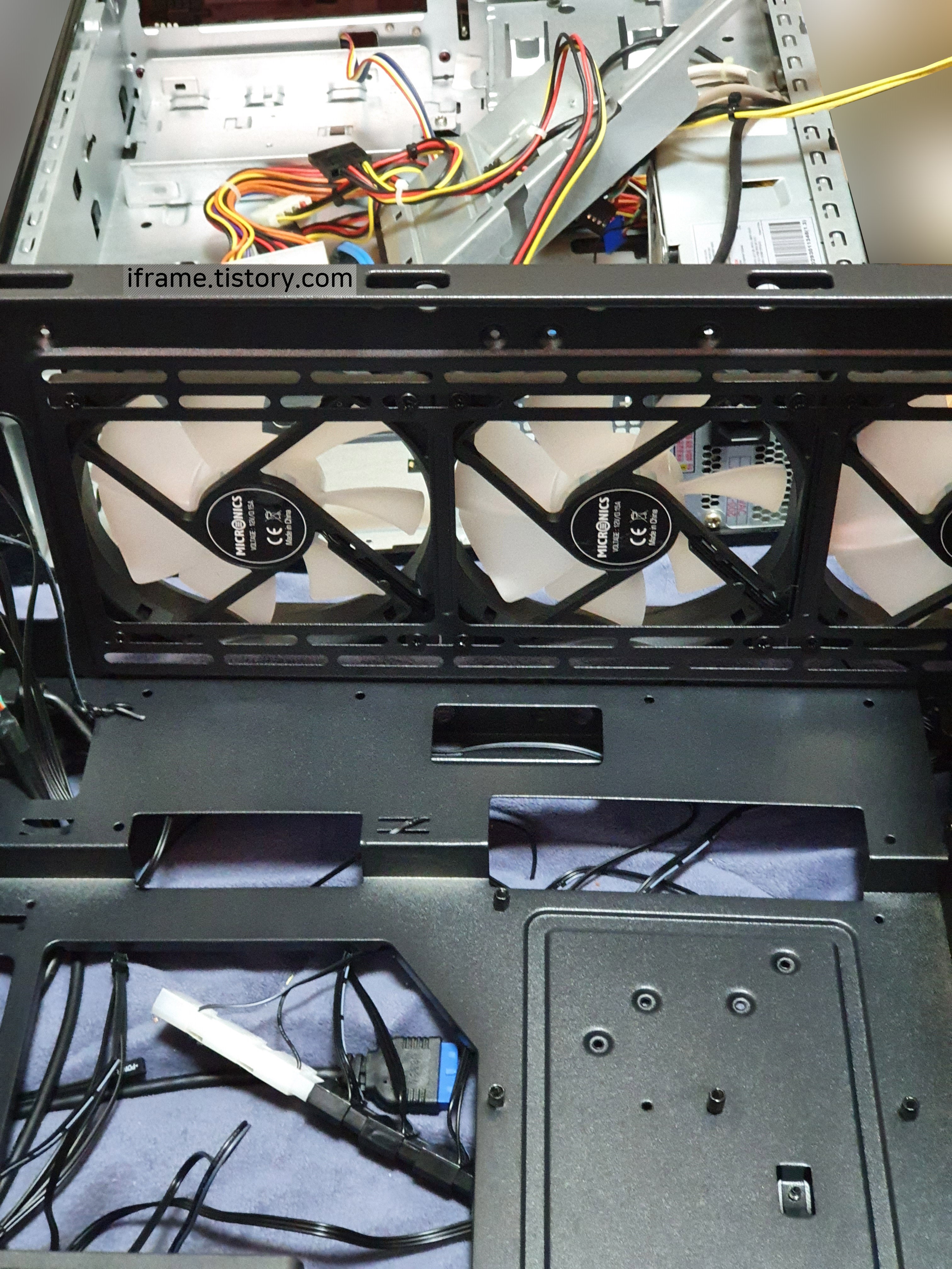 가장 난제라고 생각한 부분은 하단의 하드디스크 설치로, 방향도 바꿔보고 케이블도 휘어보다가 겨우 배치했습니다. 차라리 SSD를 썼다면 힘들진 않았겠지만 비용 부담도 만만치 않아 포기했습니다.