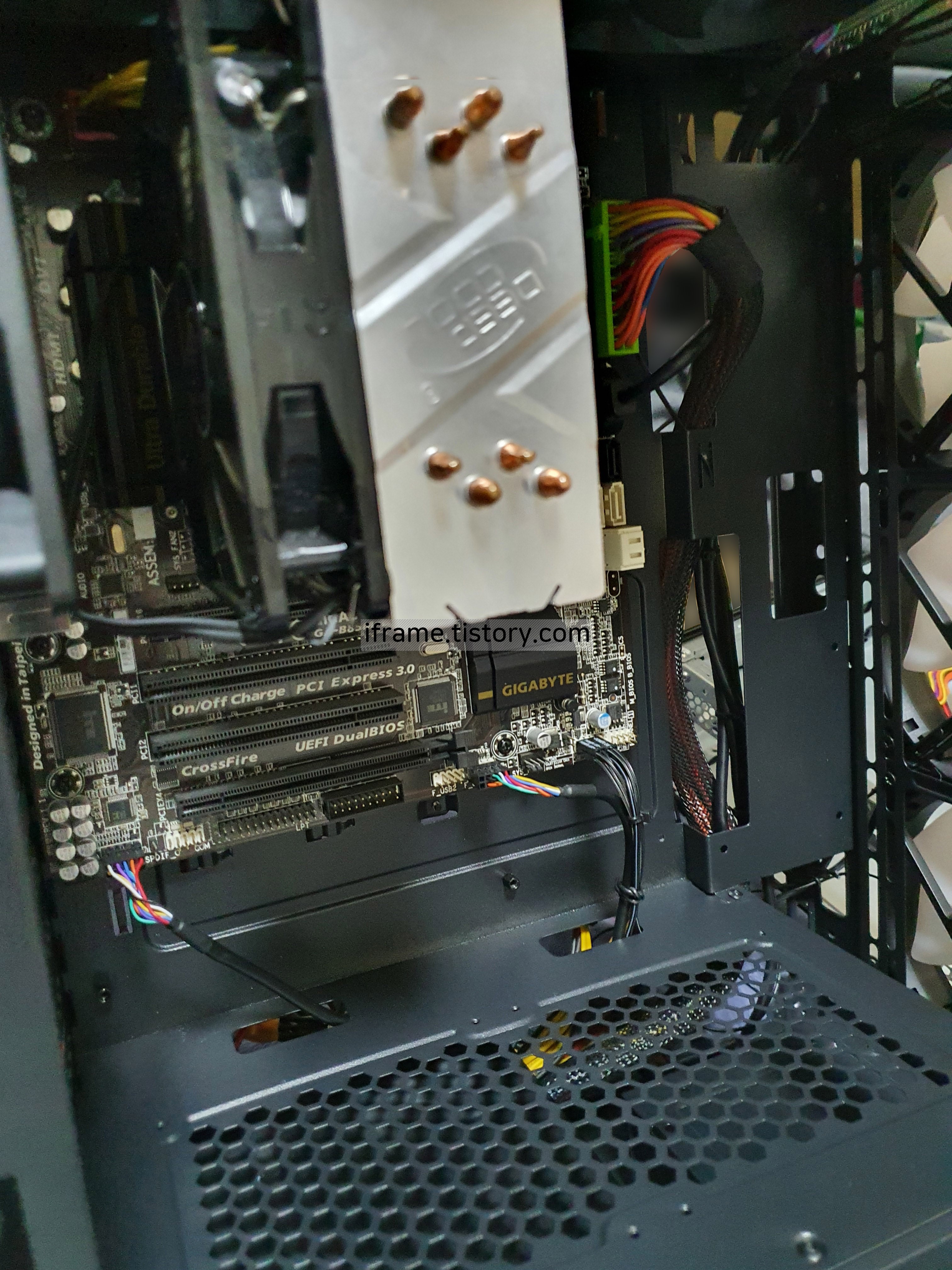 HDD 설치할 때, 선 정리를 깔끔하게 하지 않고 케이스를 닫아버리다 보니 각종 전원 케이블이 케이스 하단에서 널브러져 있었고 그러다 보니 쿨러를 건드리는 문제가 생겼습니다. 임시로 건드리지 않게 분리를 시켰지만 중앙에 삐죽 튀어나온 선을 포함해 다시 정리를 해야 되는데 귀찮아서 다음 청소할 때나 다시 정리할 것 같습니다^^;;