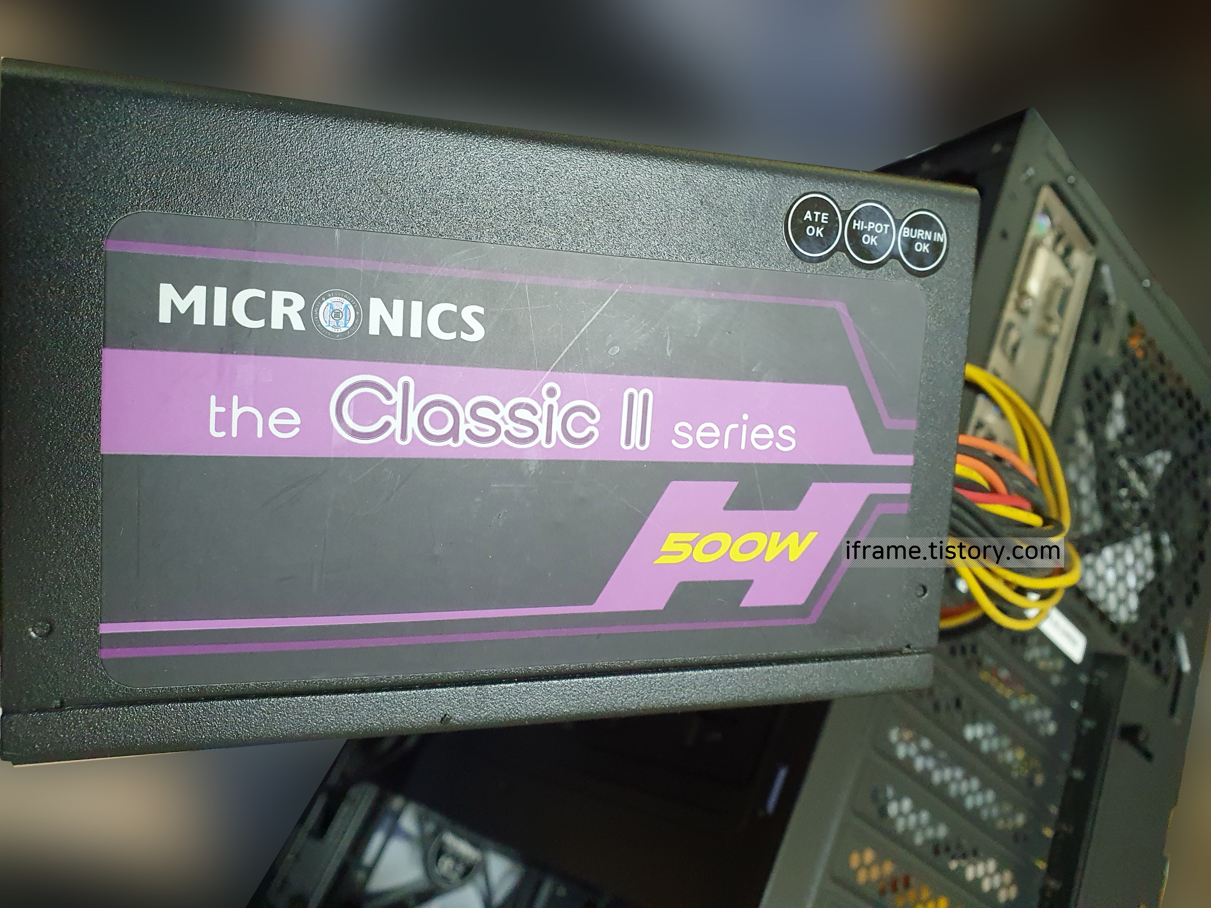 마이크로닉스 케이스라서 해당 회사의 파워를 준비했습니다...^^ 2015년도에 맞춘 컴퓨터다 보니 당시에 주로 쓰였던 파워를 구매했었고, 고장 난 게 아니어서 다시 사용하고자 장착했습니다.