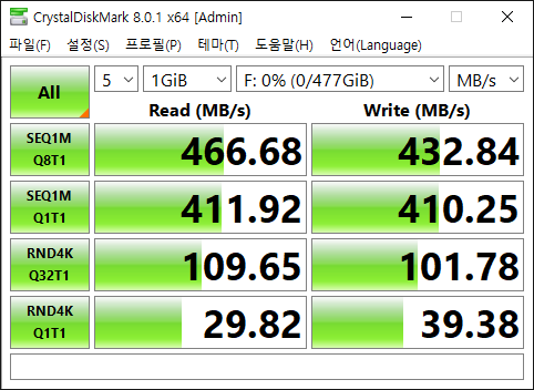 팁: 벤치마크(성능을 측정하는 프로그램)를 자주 할 경우 저장 장치의 수명이 줄어드는데 도움을 주기에(?) 프로그램을 수시로 돌리는 것은 추천하지 않아요.